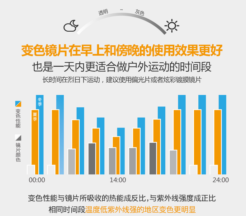 只有新增的变色透明片跟变色偏光片,会随阳光强弱变化片色。其他镜片不会变色。