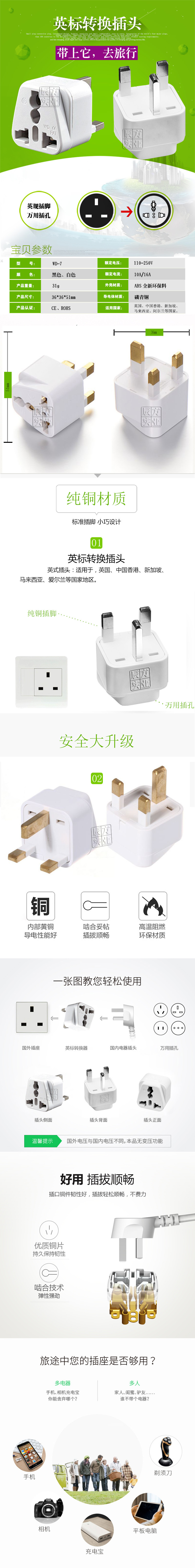 6、产品功能:能够将世界各国插头的插脚转换成英式(英标)三方插脚.
