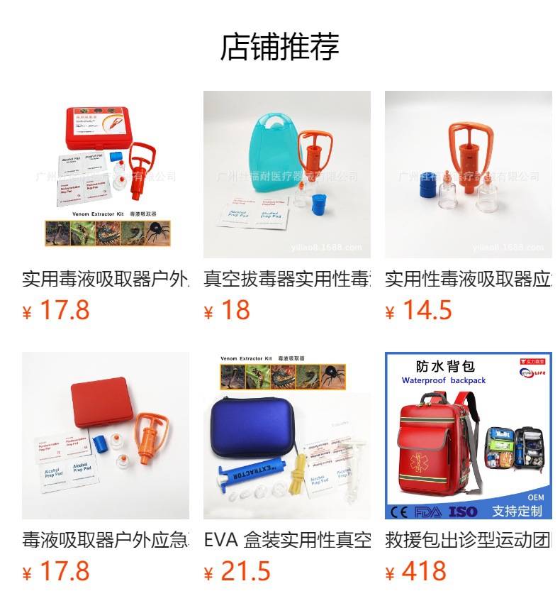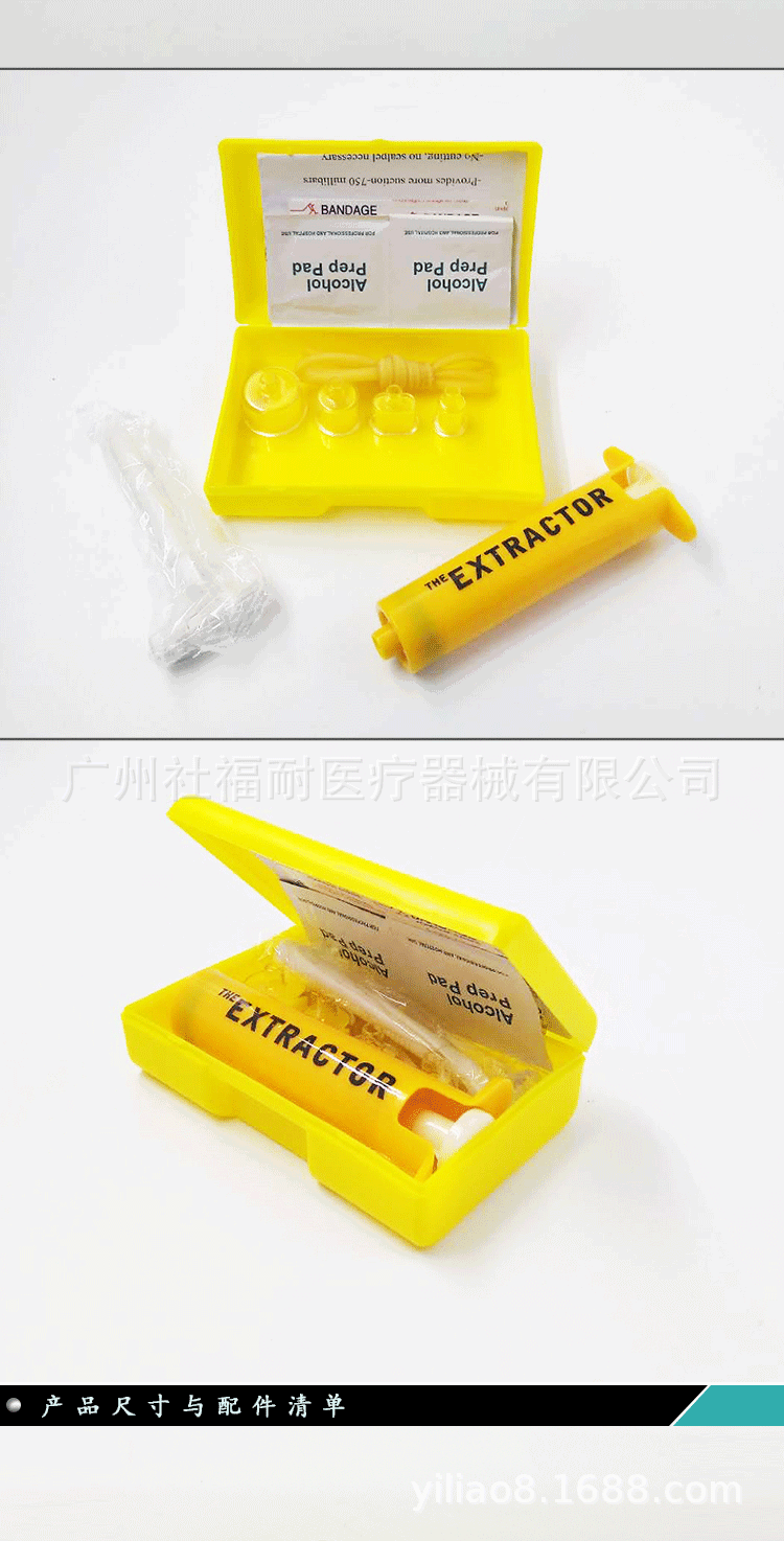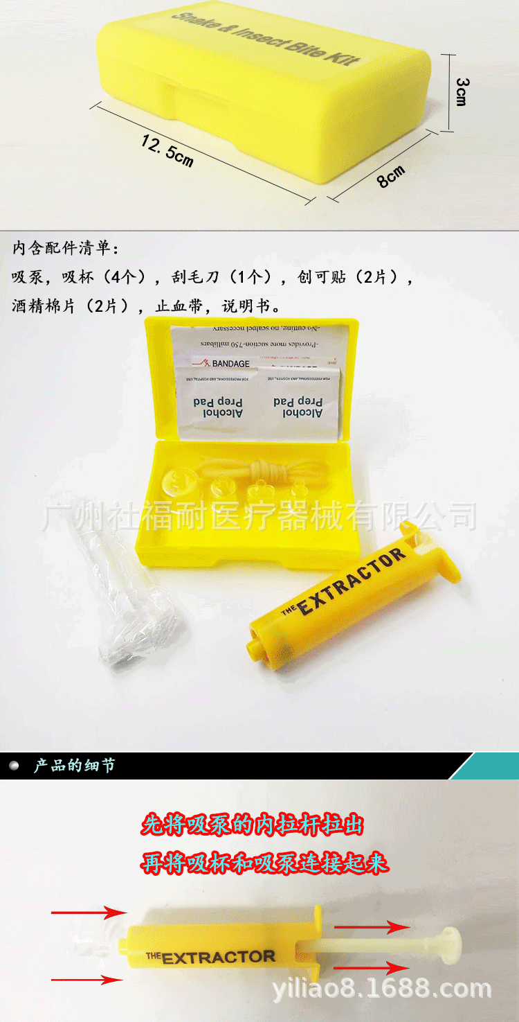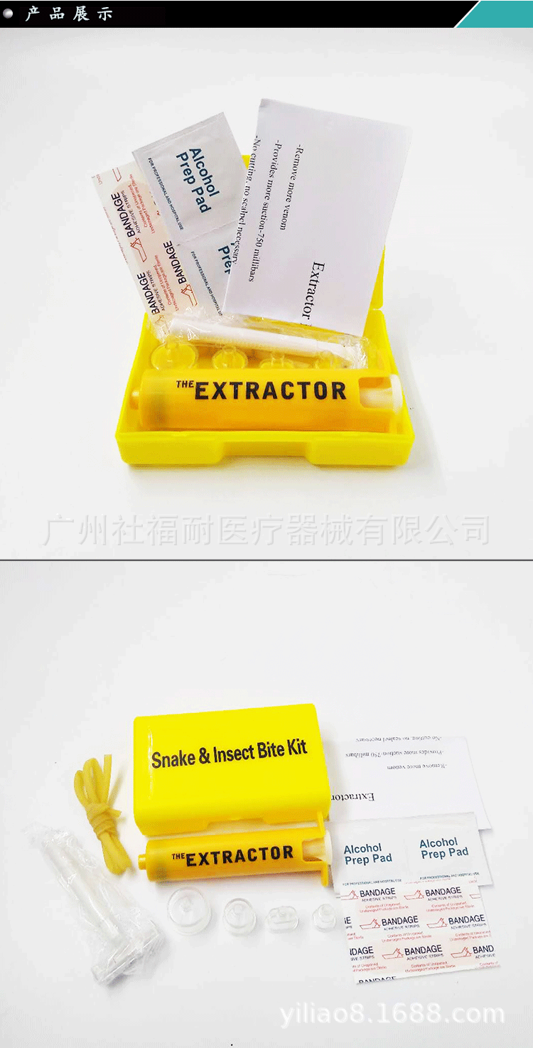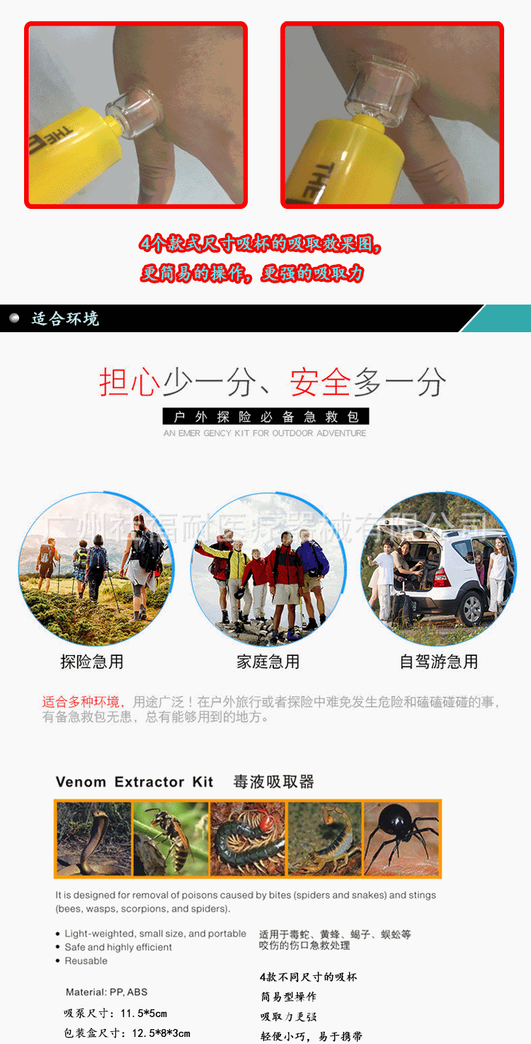 经常户外旅游的驴友们都会遇到被蛇虫鼠蚁攻击过的经历,这些生物大多无害,但是喜欢探险的驴友们经常会挺近深山野林,松厚的积叶和高密的草丛是一些毒蛇的绝好隐身处,一不小心被蛇咬到之后怎么办……呵呵! 大家都会想到想影视中的英雄一样,将毒液用嘴巴吸出来吧。但是,你错了,用嘴巴吸毒既不卫生也不安全,还会有另一个人中毒的风险。不过,现在好了,有我们的这款新品,操作简单,便捷安全,利用空气的压力,直接将毒液挤压出来。配有消毒湿巾和酒精片,简单快速就能将伤口处理好……