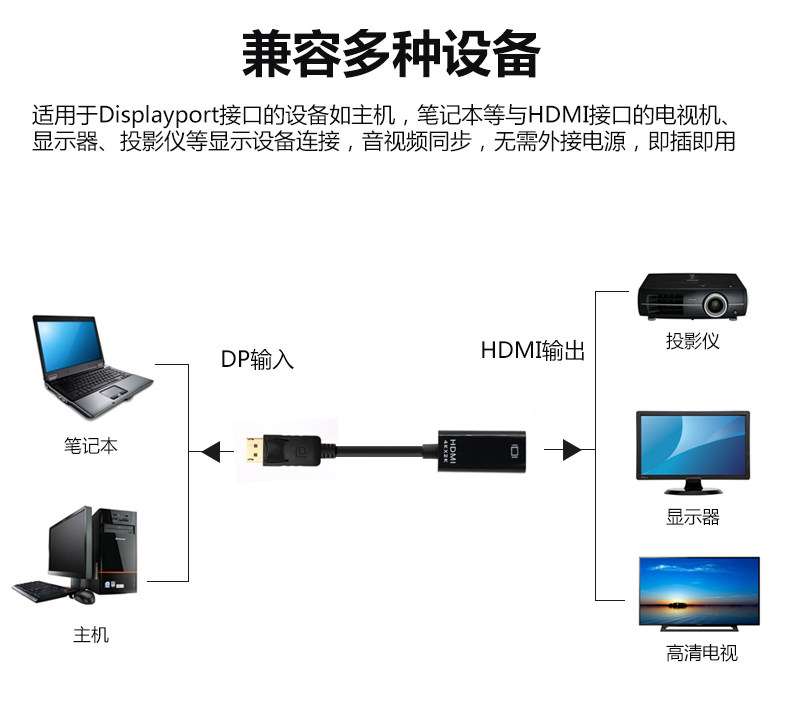 Note: for some compatible device, it might take a few seconds for the video to display. Portable adapter connects a DisplayPort (DP, DP++, DisplayPort++) equipped laptop or desktop to an HDTV, monitor, or projector with HDMI input; An HDMI cable (sold separately) is required