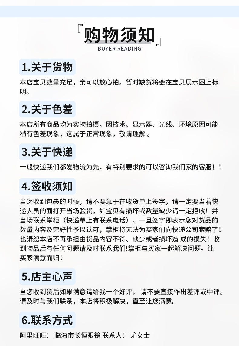 感谢你在茫茫阿里之中,选择本店的眼镜。眼镜是我们自己家生产的,省去了中间的利润,把利润空间直接给予你们,随带关注一下咱们店铺呗!!!后续会有很多新品上新的!!! 1.(关于货物):本店宝贝数量充足,亲可以放心拍。暂时缺货将会在宝贝展示图上标明。 2.(关于色差):本店所有商品均为实物拍摄,因技术、显示器、光线、环境原因可能稍有色差现象,这属于正常现象,敬请理解 。 3.(关于快递): 一般快递我们都发物流为先,有特别要求的可以咨询我们家的客服!!! 4.(签收须知):当 您收到包裹的时候,请不要急于在收货单上签字,请一定要当着快递人员的面打开当场验货,如宝贝有损坏或数量缺少请一定拒收!并当场联系掌柜(快递单上有联系电话)。一旦签字即表示您对货品的数量内容及完好性予以认可,掌柜将无法为买家们向快递公司索赔了!也请恕本店不再承担由货品内容不符、缺少或者损坏造 成的损失!收到物品后有任何问题请及时联系我们!掌柜与买家一起解决问题。让买家满意而归! 5.店主心声:当您收到货后如果满意请给我一个好评, 请不要直接作出差评或中评。请及时与我们联系,本店将积极解决,直至让您满意。 6.联系方式:阿里旺旺: 临海市长恒眼镜 联系人: 尤女士
