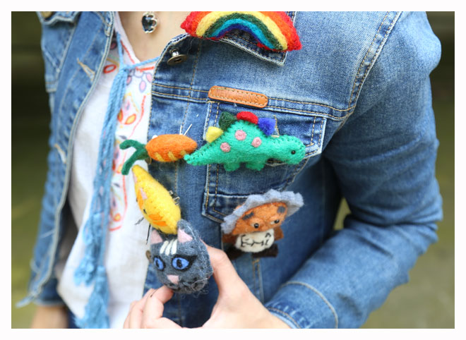 1#黄色い猫のブローチ,2#シャーペイのブローチ,3#灰色の猫のブローチ,5#恐竜のブローチ,7#ミス・ハリネズミのブローチ,10#マカロンレインボーブローチ,11#レインボーブローチ,虹雲のブローチ