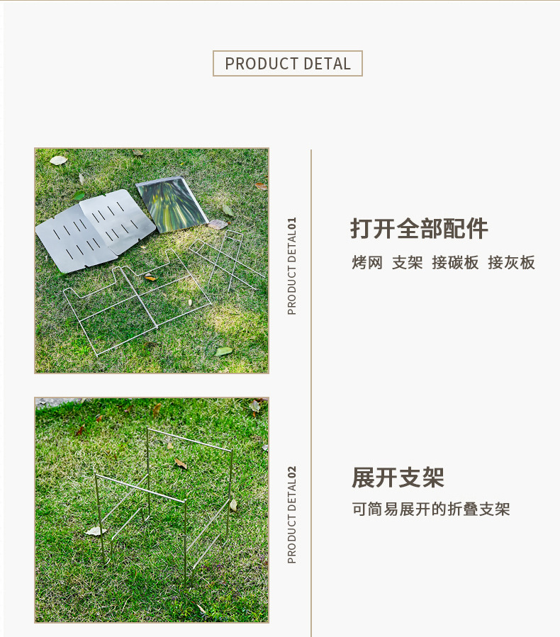 产品构成: 支架 烧烤网 接灰盘 挂钩 收纳包