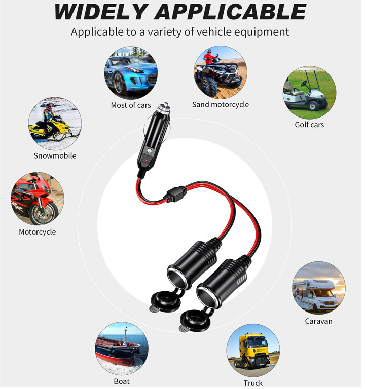 - 适用于为带点烟器插头的电器供电,如点烟器分配器、车载风扇、USB 车载充电器适配器、12V 车载冰箱、12V 便携式空气压缩机泵和其他 12V-24V 电器
