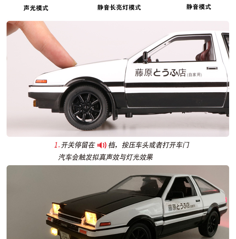建元1:24大型AE86車両ライトは、フォグランプを回転させることができ、四輪ショックアブソーバー、リターン力、シミュレーション合金車両モデル、音と光を備えています。