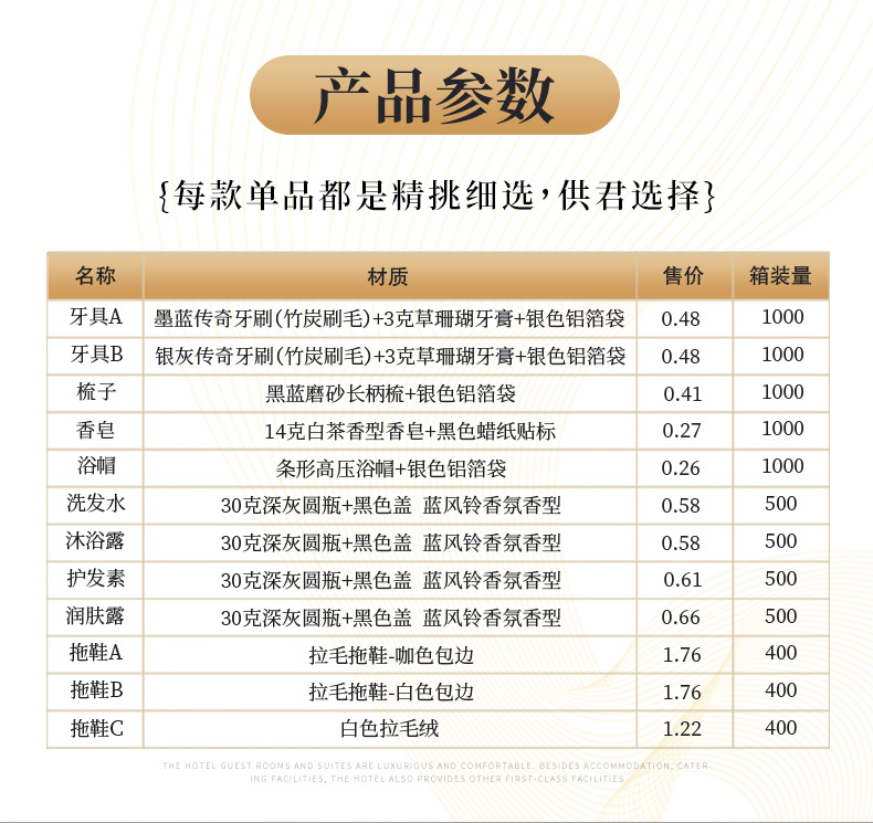 歯具A,歯具B,スリッパA,スリッパB,スリッパc,シャンプー,入浴剤,ローション,コンディショナー,石鹸,櫛,シャワーキャップ,7点セット,9点セット,11点セット