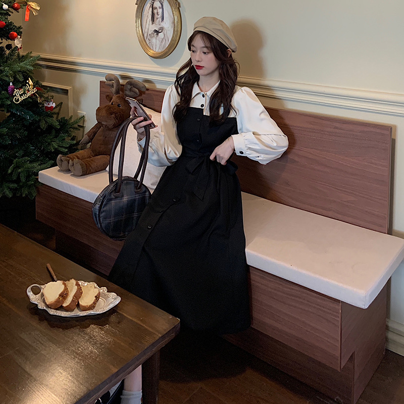 実拍実価格【起爆】偽の2枚のストラップ長袖フレンチワンピース女性が痩せているヘボン風シャツ