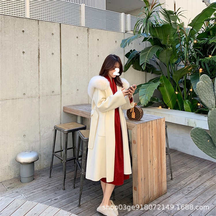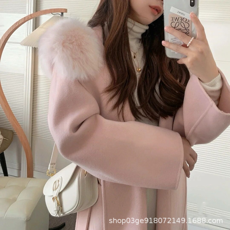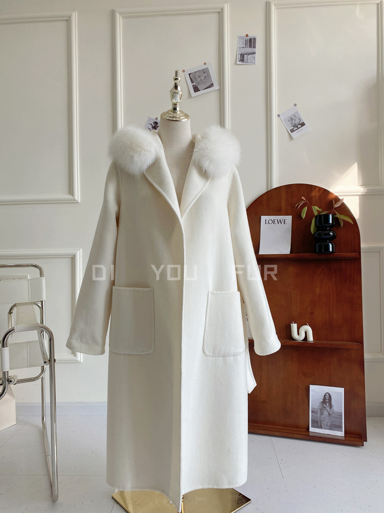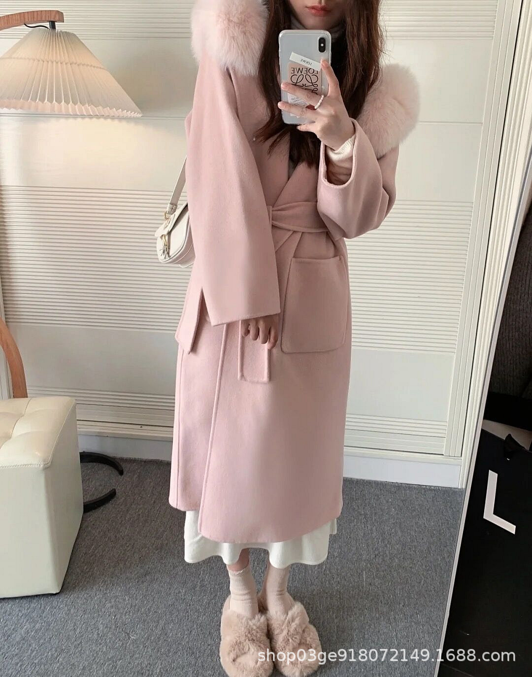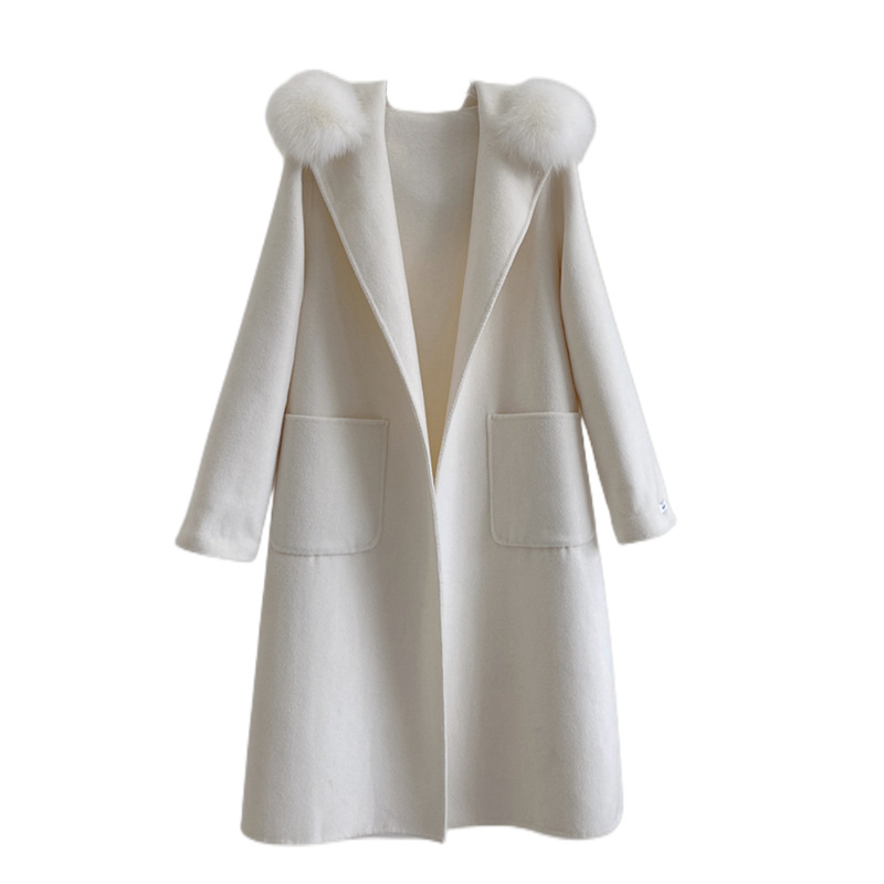 雪が解けた後の2025年秋冬新作、フォックスファー襟付きフード付き両面カシミヤコート、女性用ミドル丈ウールコート