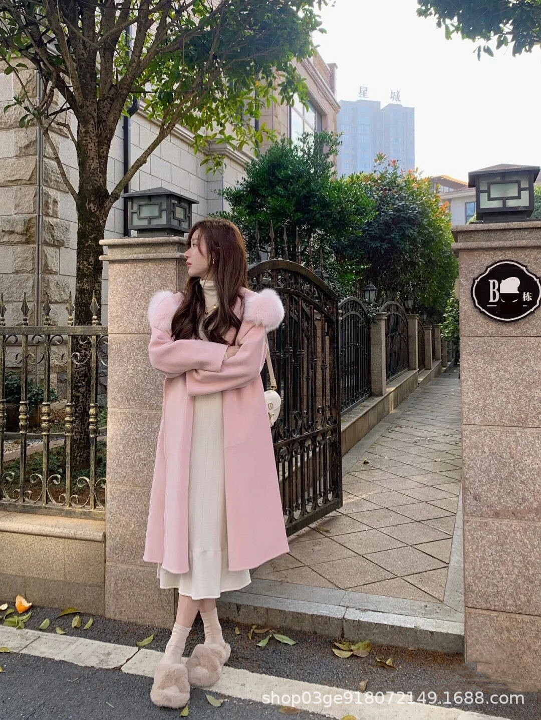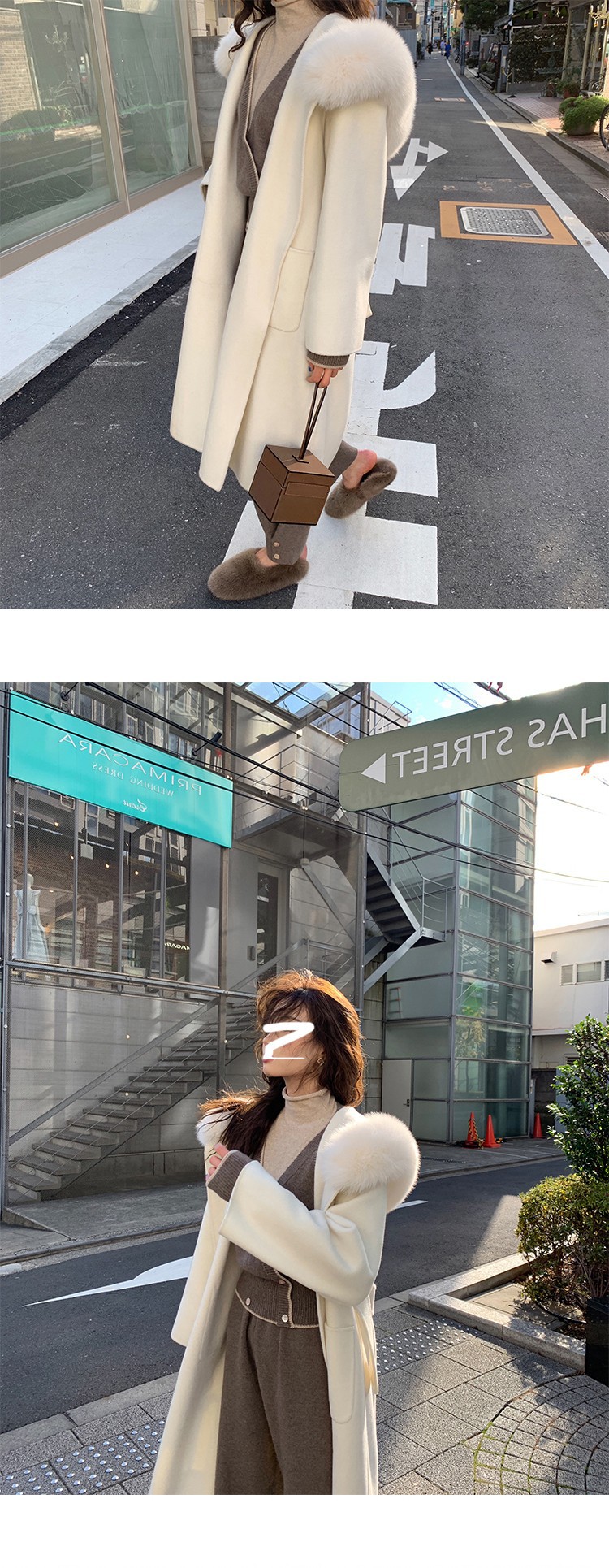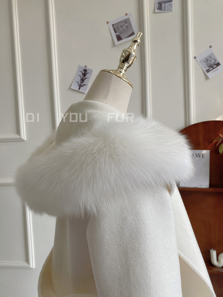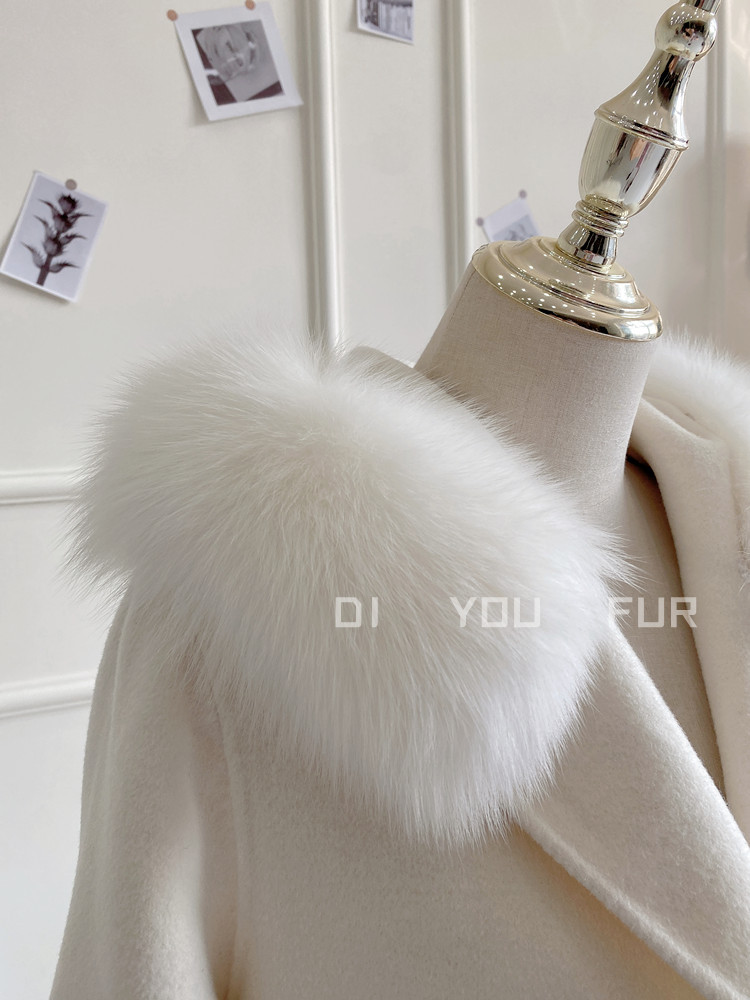 雪が解けた後の2025年秋冬新作、フォックスファー襟付きフード付き両面カシミヤコート、女性用ミドル丈ウールコート