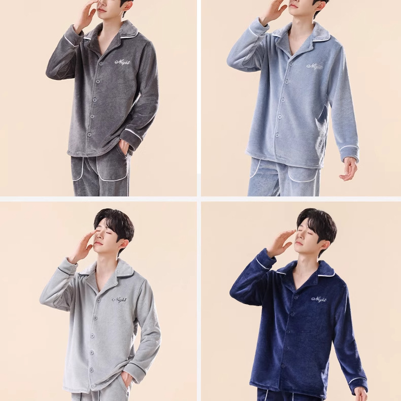 2025新款秋冬法兰绒男士睡衣男翻领开衫保暖珊瑚绒家居服套装批发