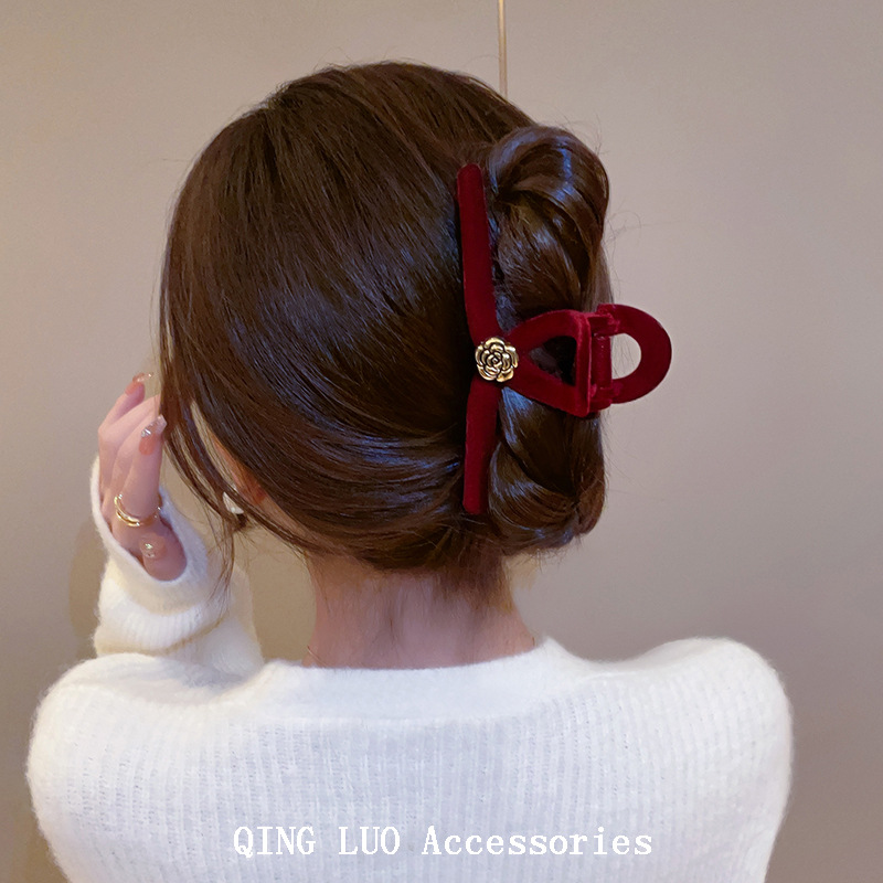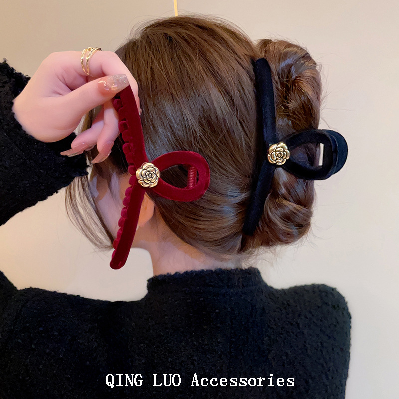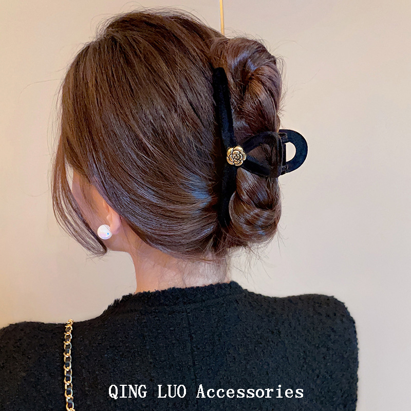 黒い大きいサイズのベルベットはツバキの花を挟んで高級感があります。
