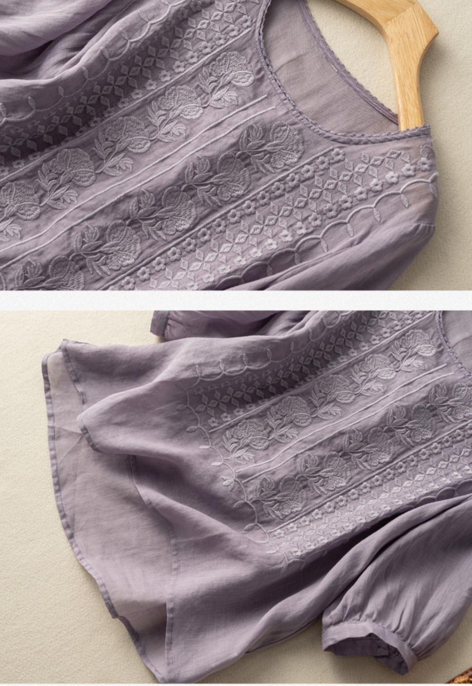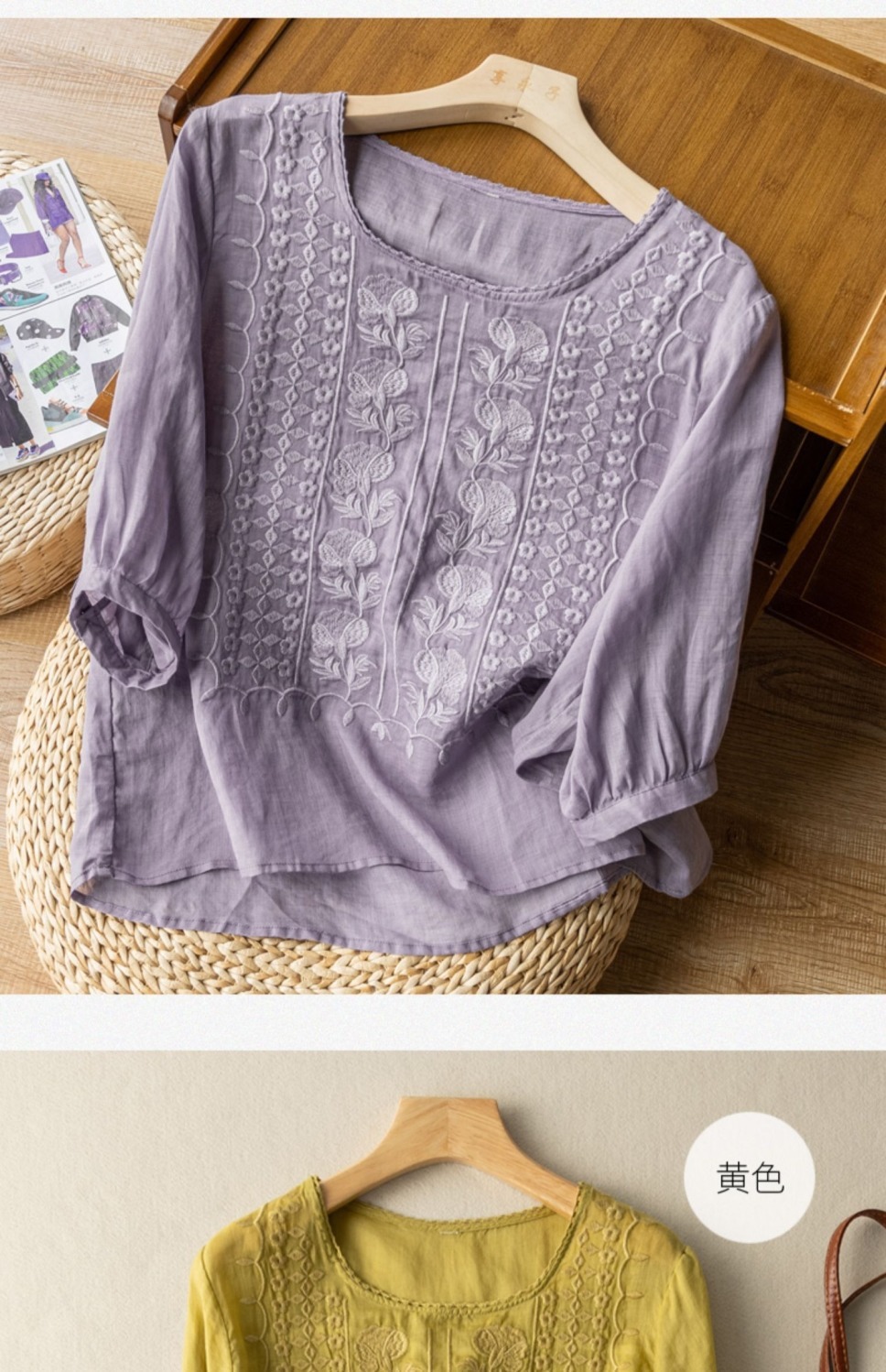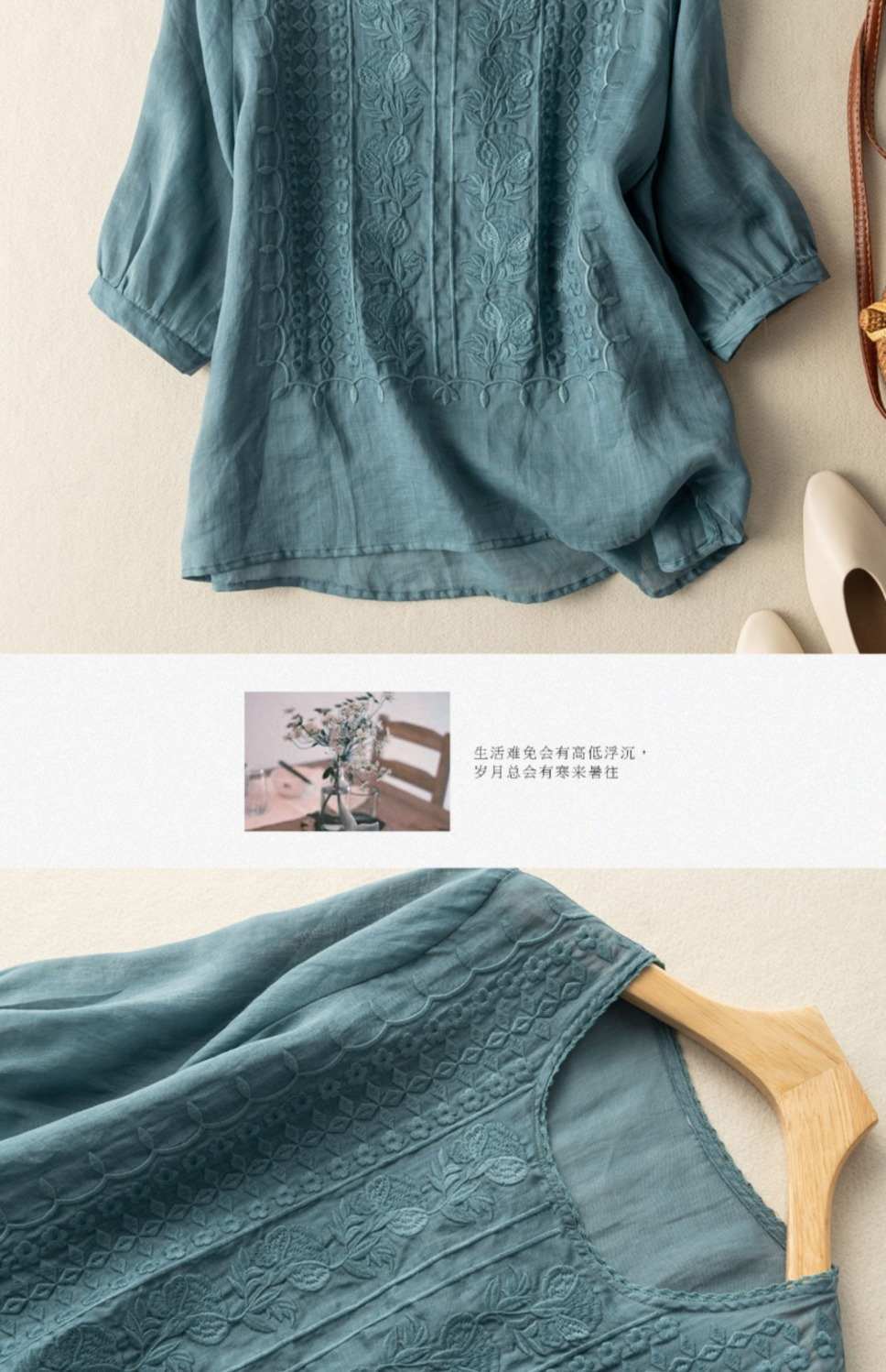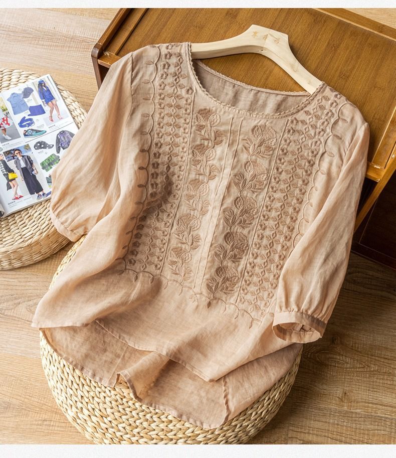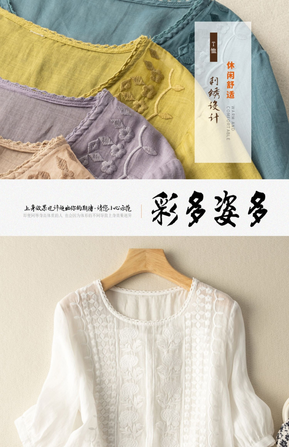 女性の綿麻の薄いタイプの刺繍の夏の新型の丸首の上着の文芸の復古の通気性の泡の袖の半袖の女性のtシャツ