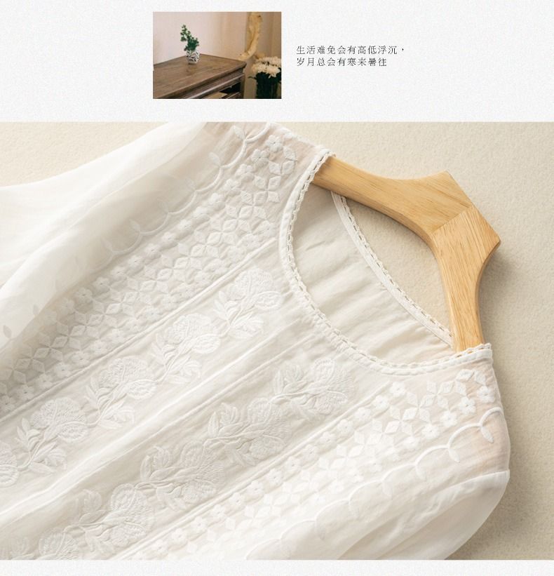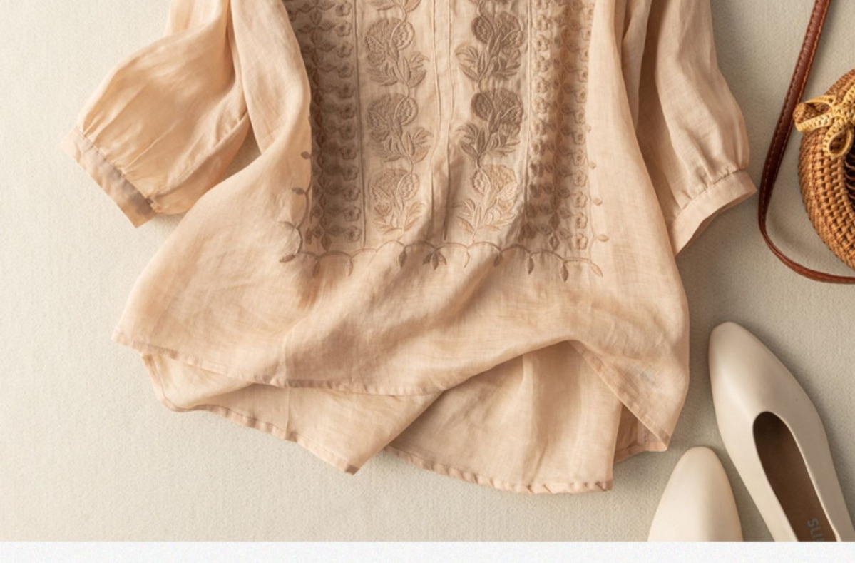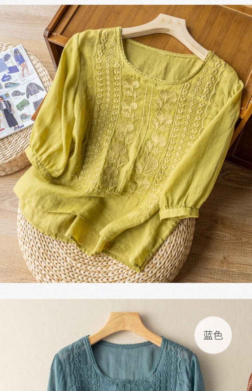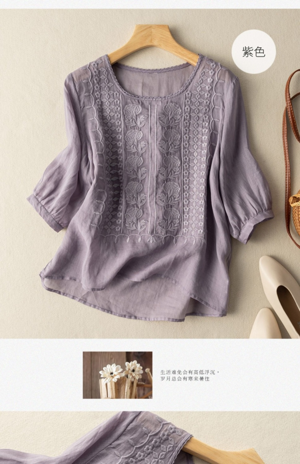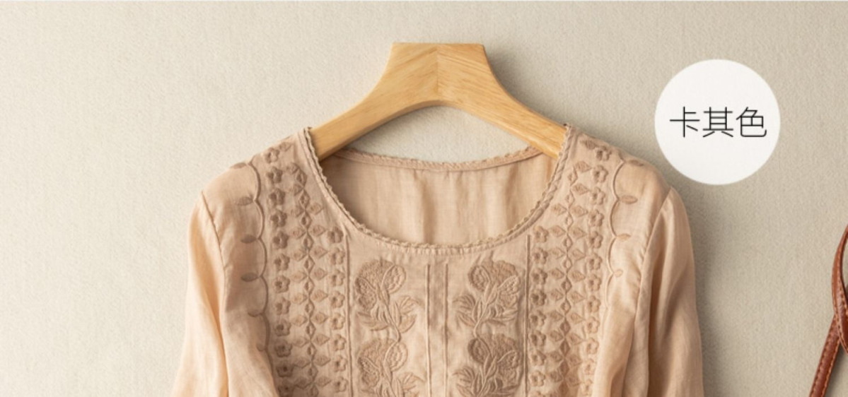 女性の綿麻の薄いタイプの刺繍の夏の新型の丸首の上着の文芸の復古の通気性の泡の袖の半袖の女性のtシャツ