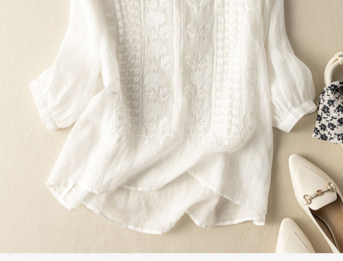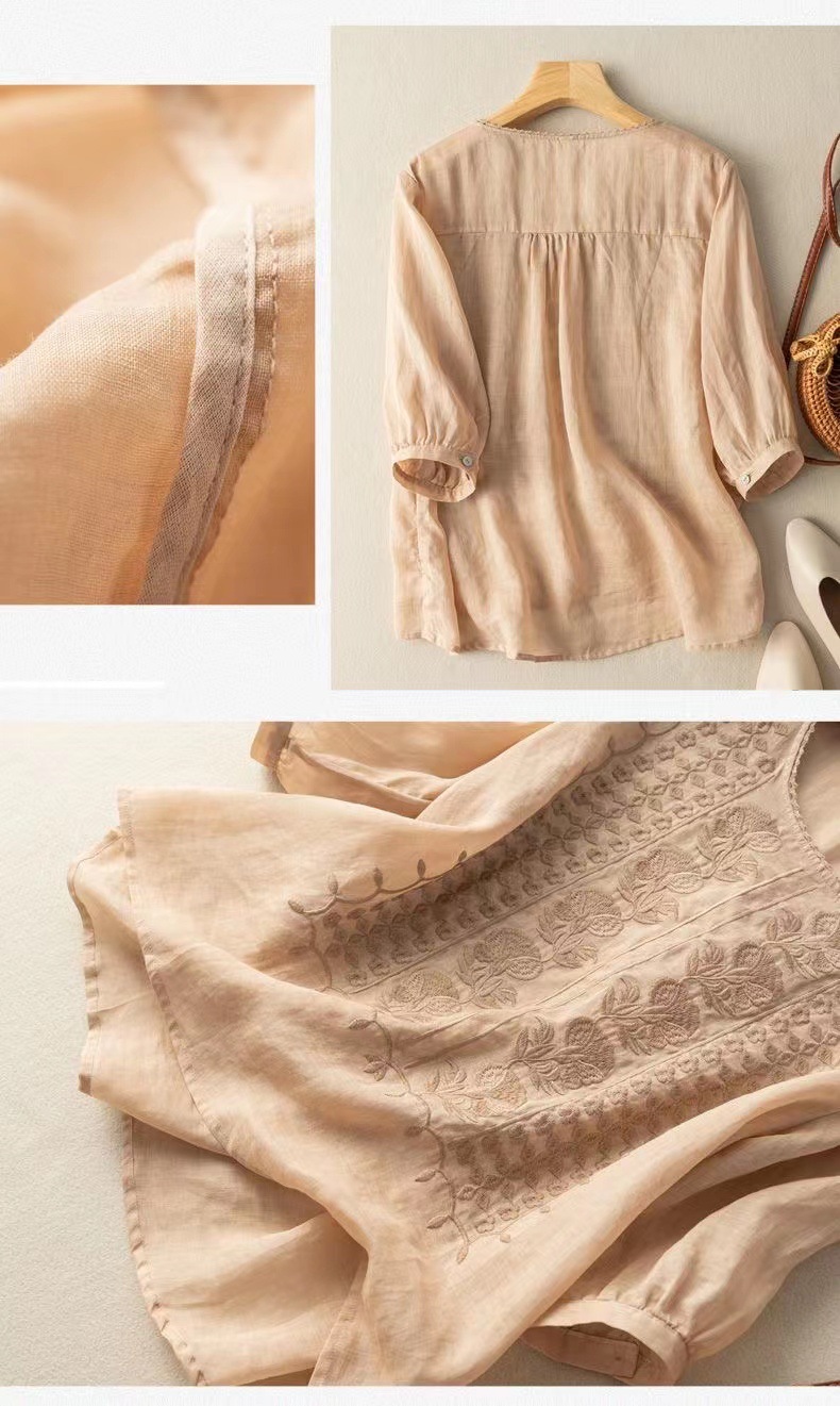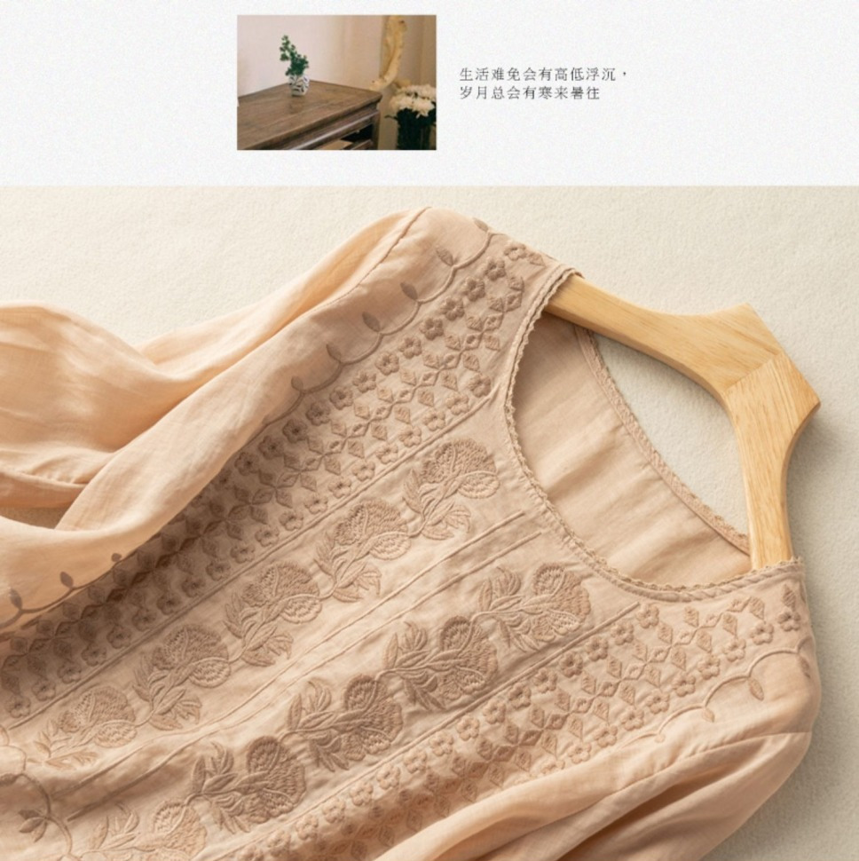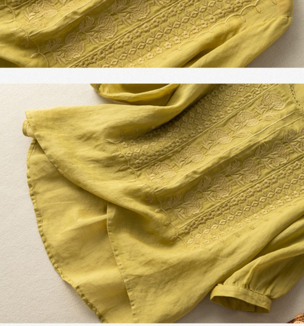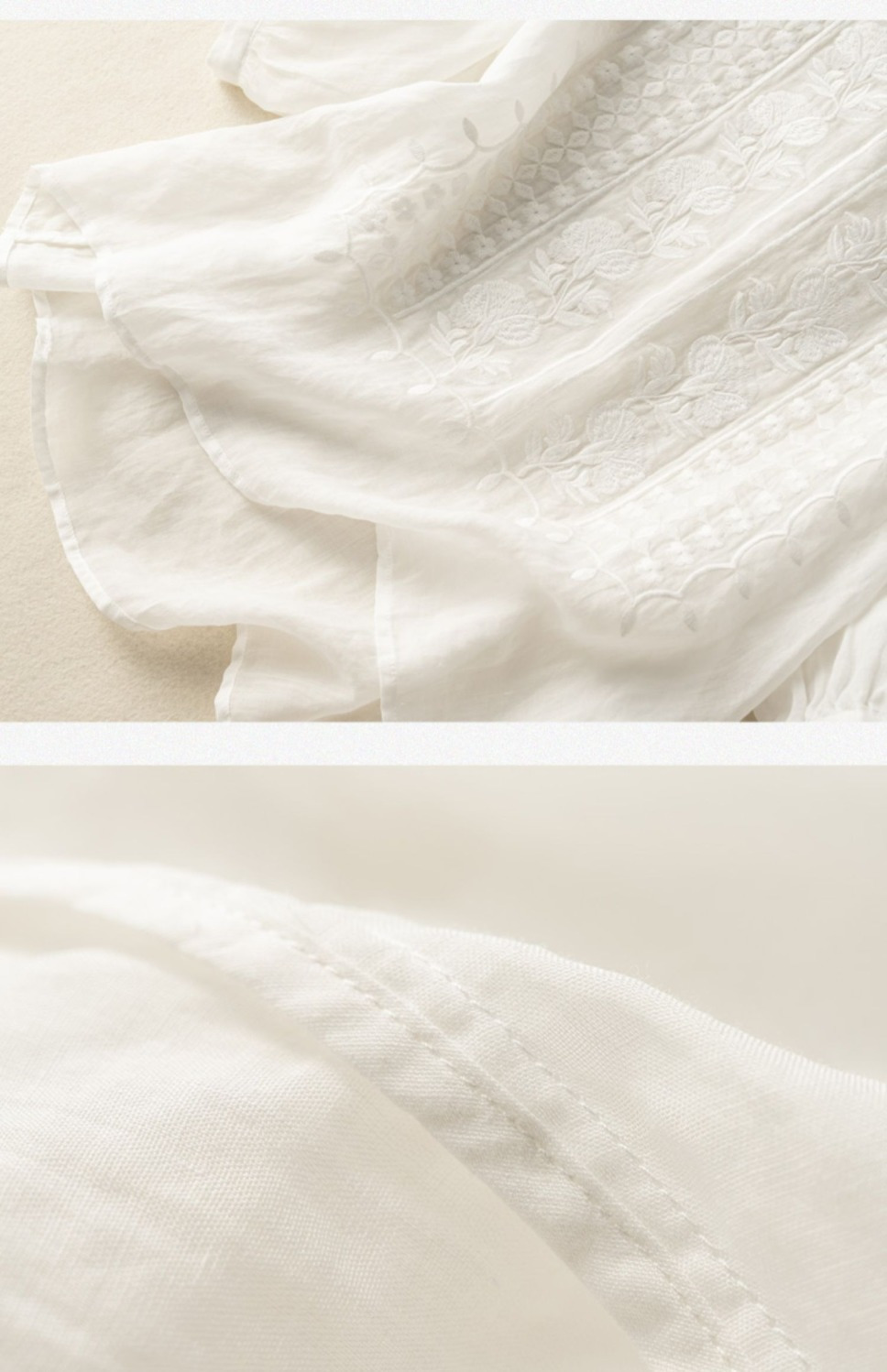 女性の綿麻の薄いタイプの刺繍の夏の新型の丸首の上着の文芸の復古の通気性の泡の袖の半袖の女性のtシャツ