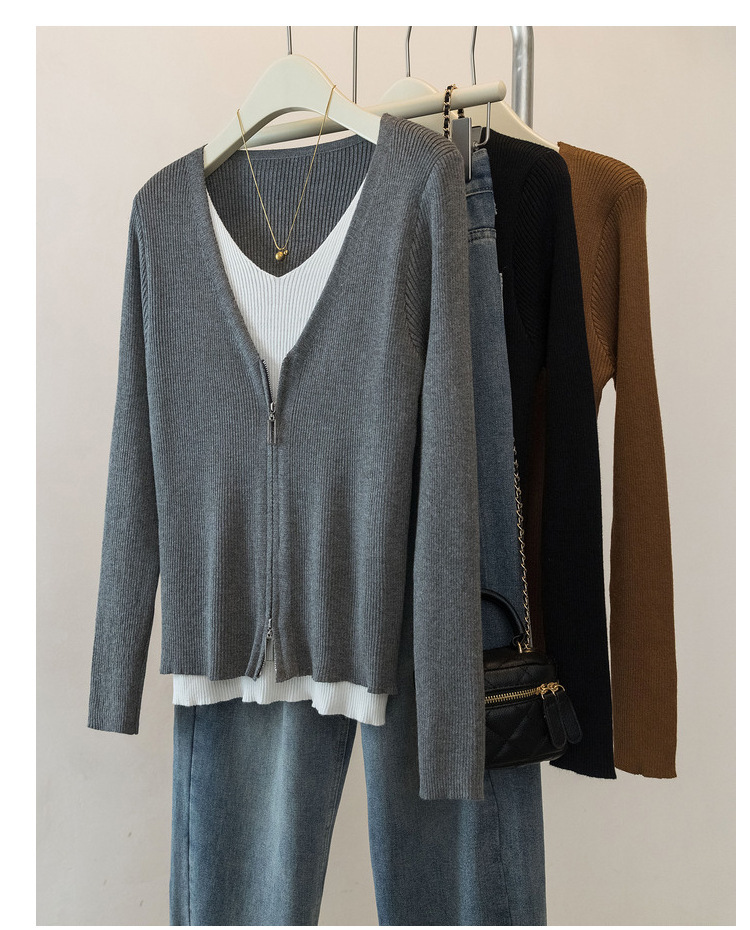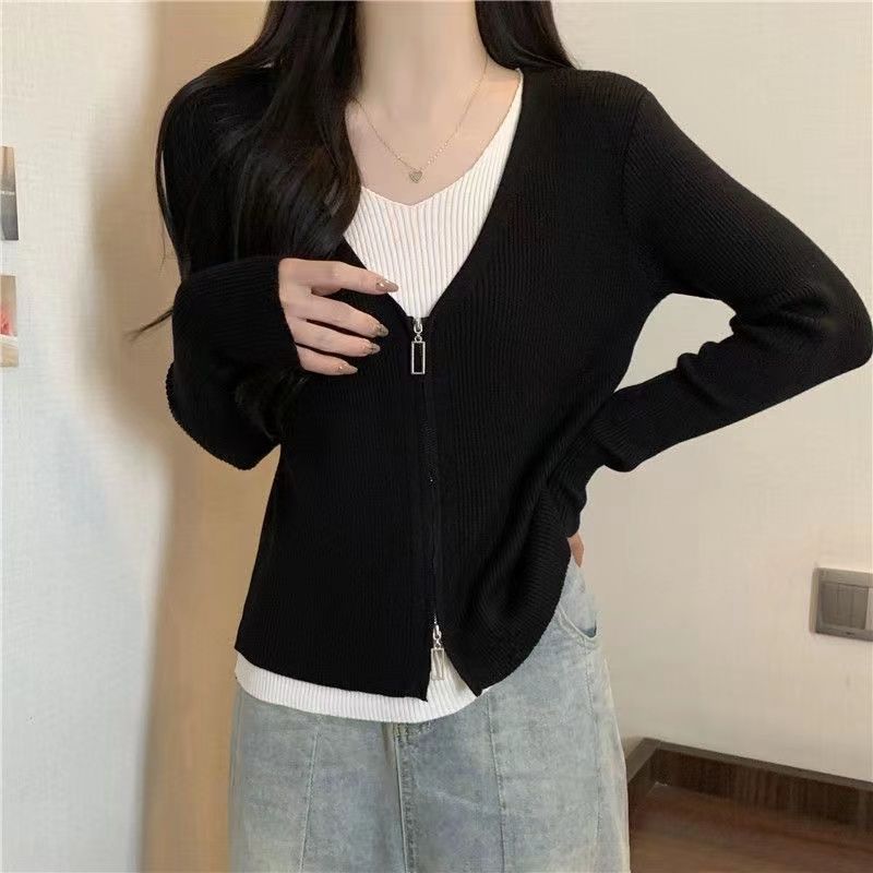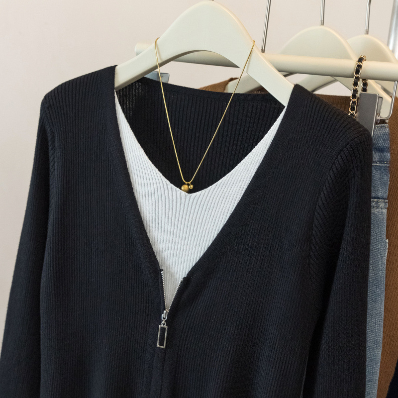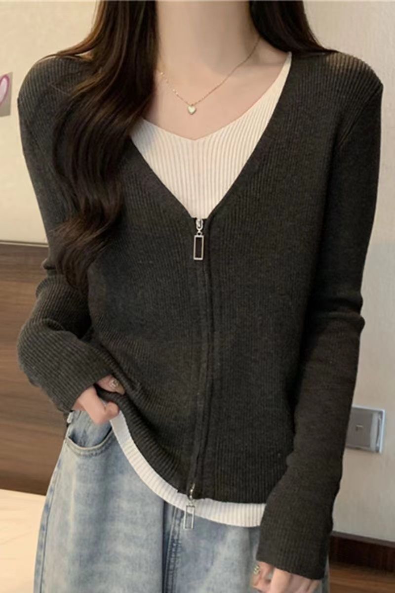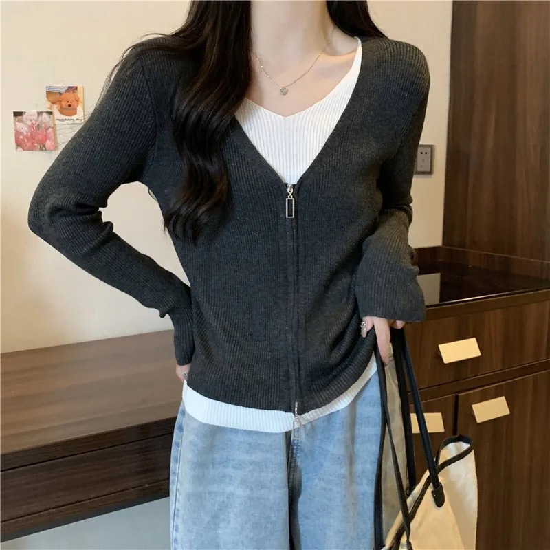 2025婦人服のデザイン感の中にカーディガンの長袖の上着の偽の2つの色のセーターの底のシャツの女性の春