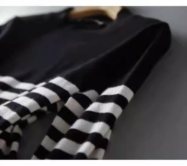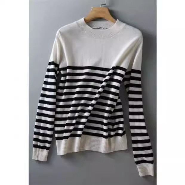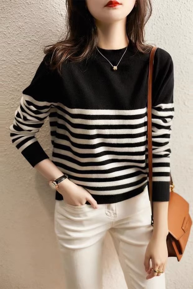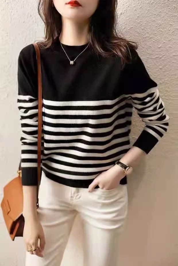 秋と冬のセーターの女性の 2025 新ファッションストライプ底シャツプルオーバーラウンドネック長袖ルーズスリム多用途トップ