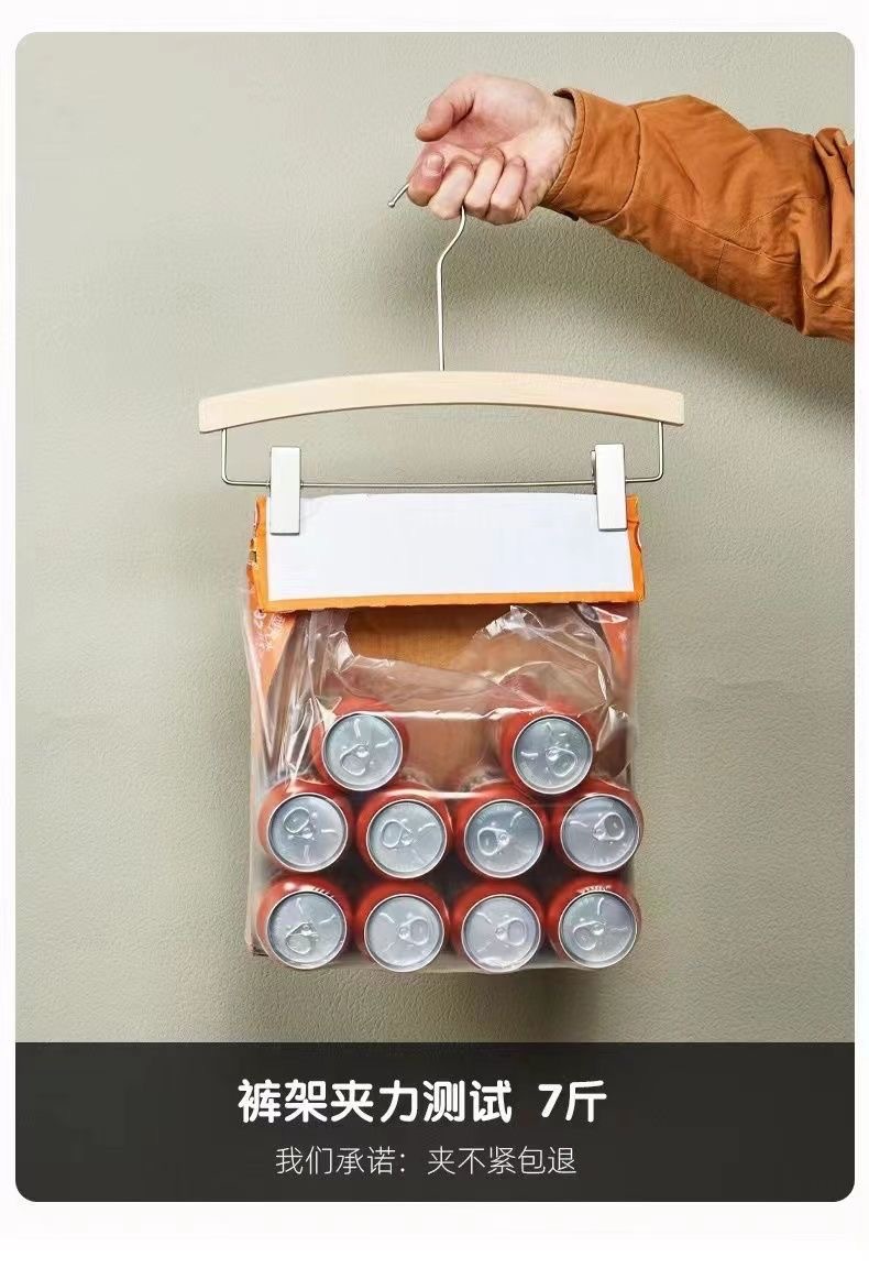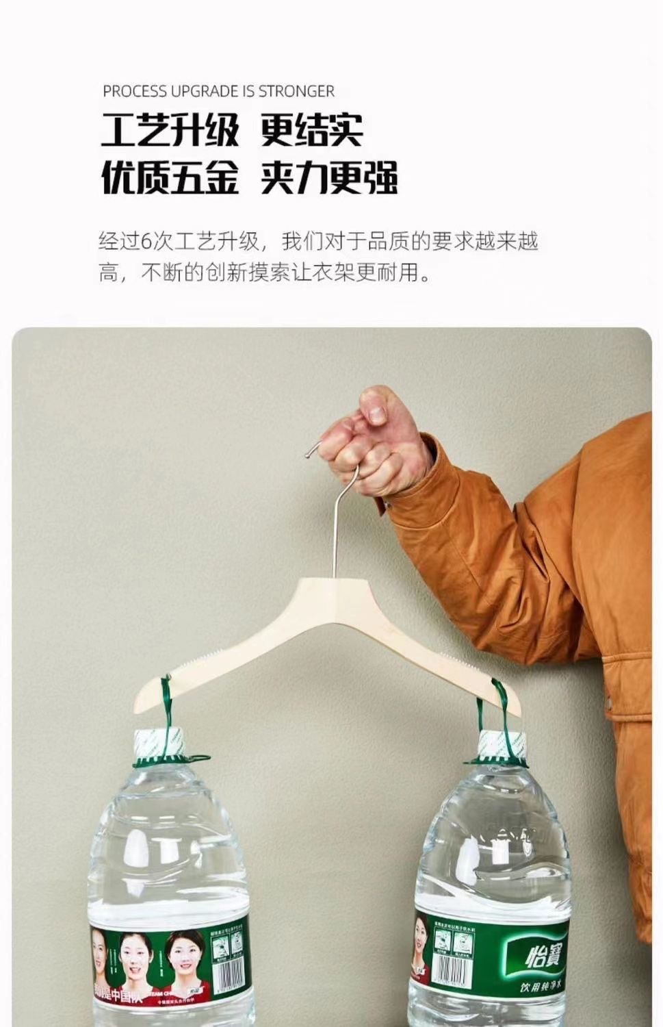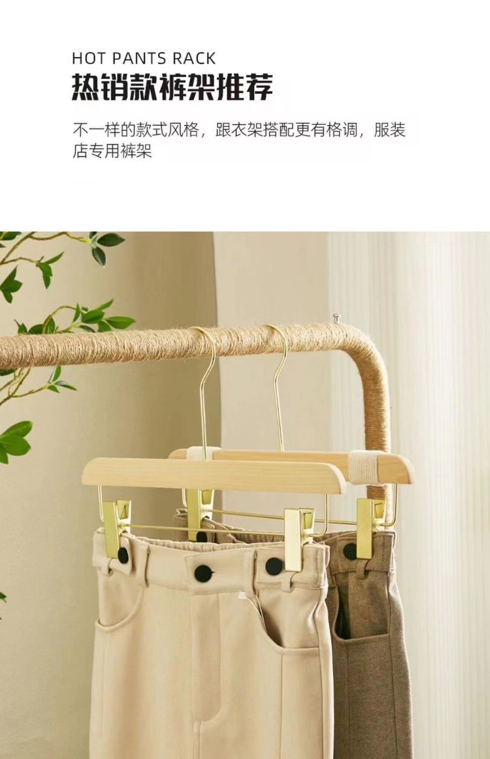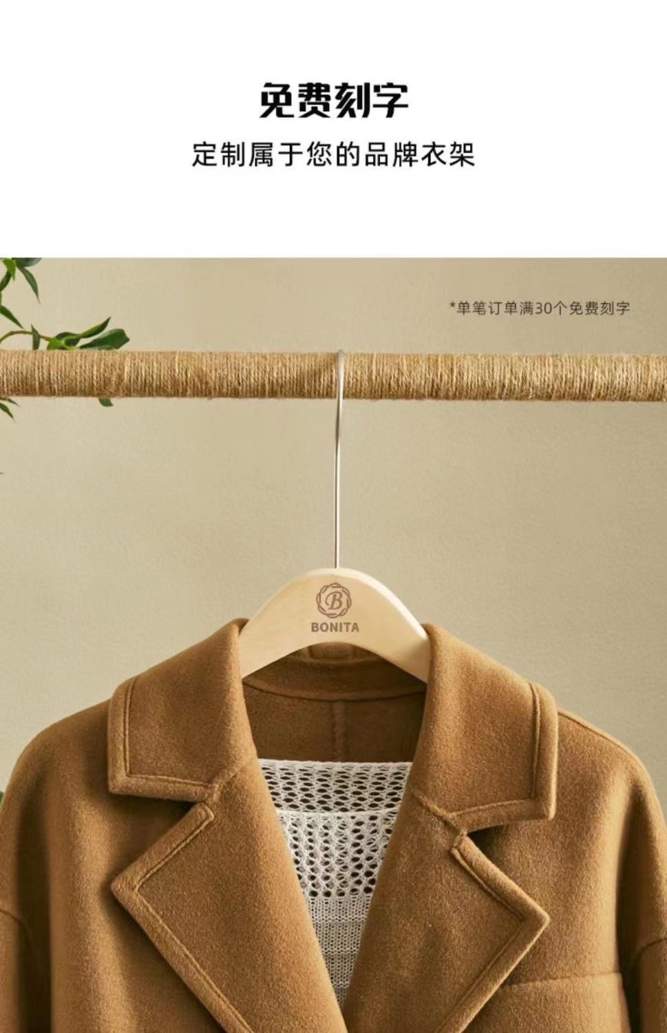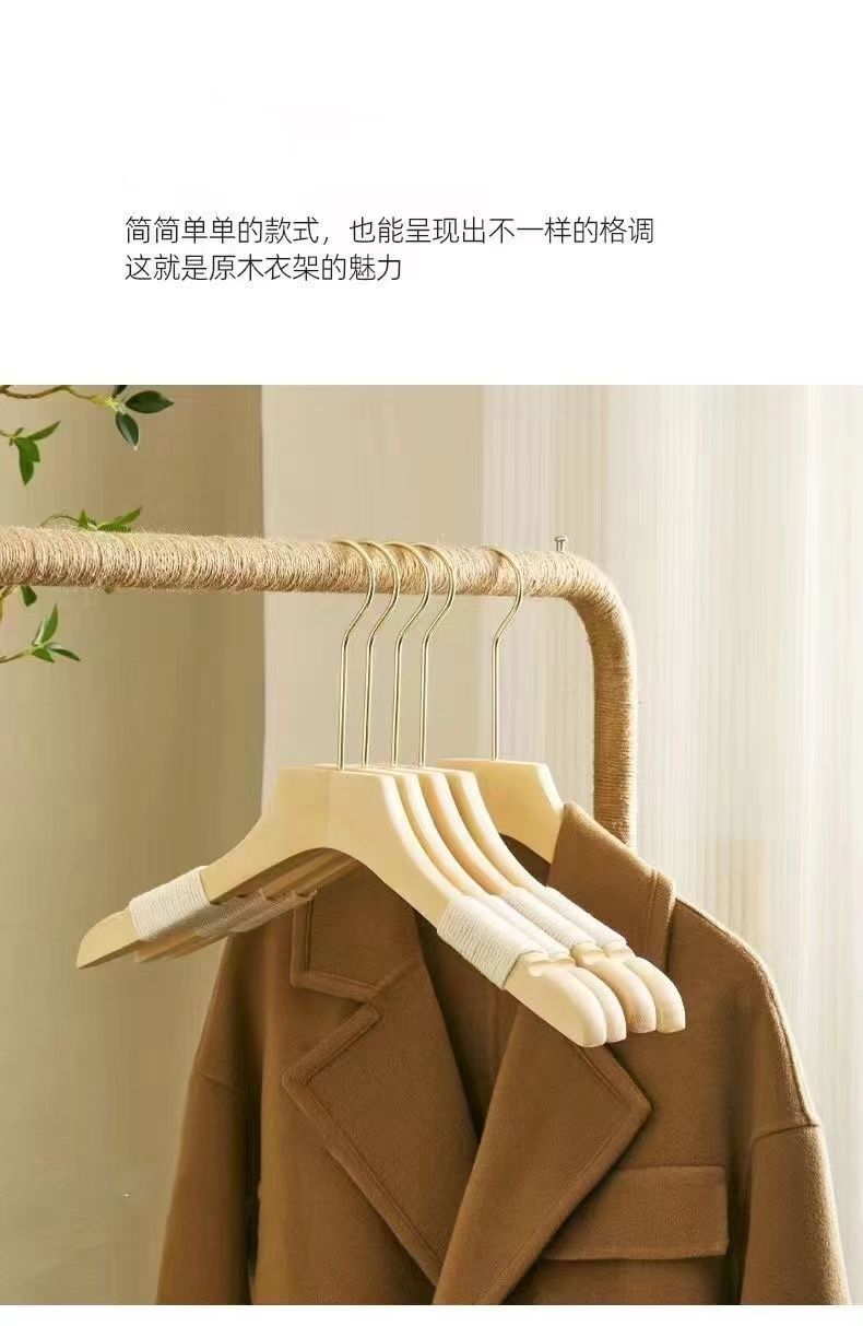 金色の無垢材衣料品店用ハンガー、植毛・紐付き滑り止めハンガー、ロゴ刻印可能、天然木ハンガー、スーツ用