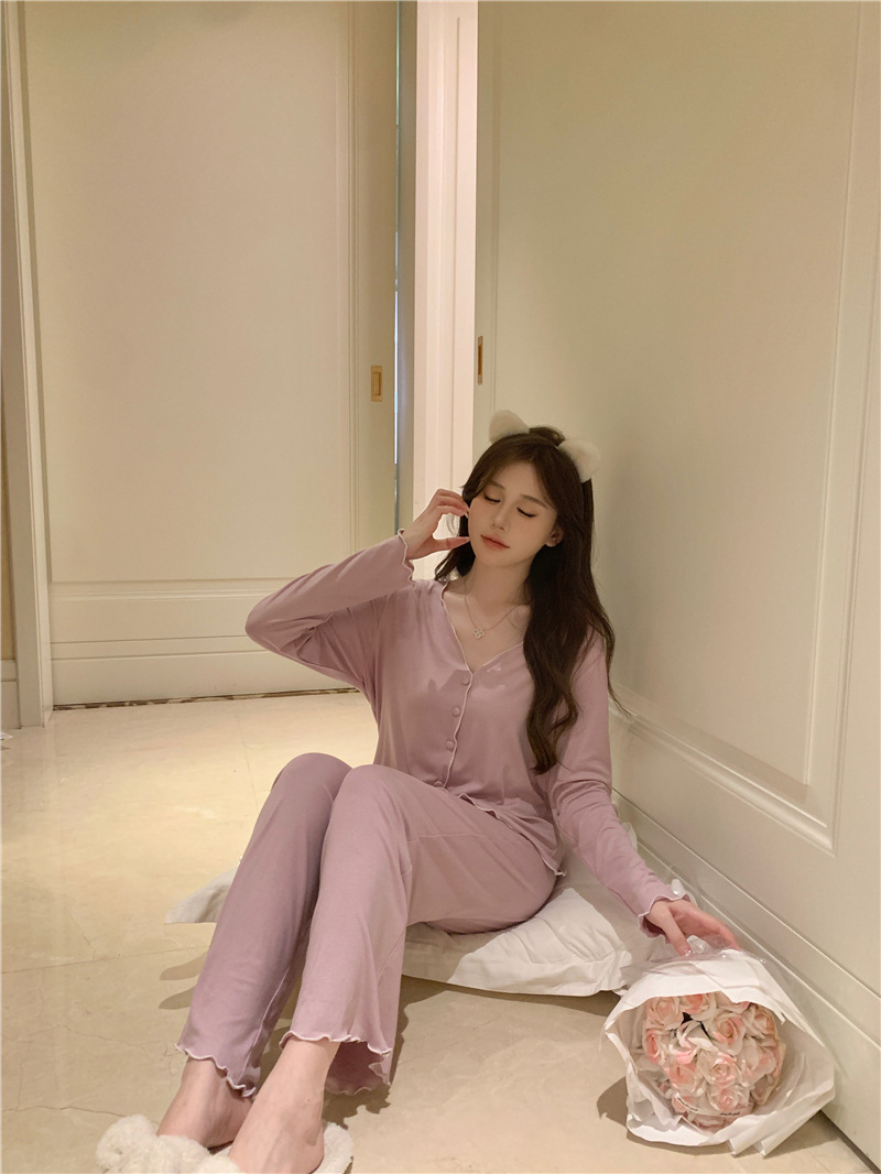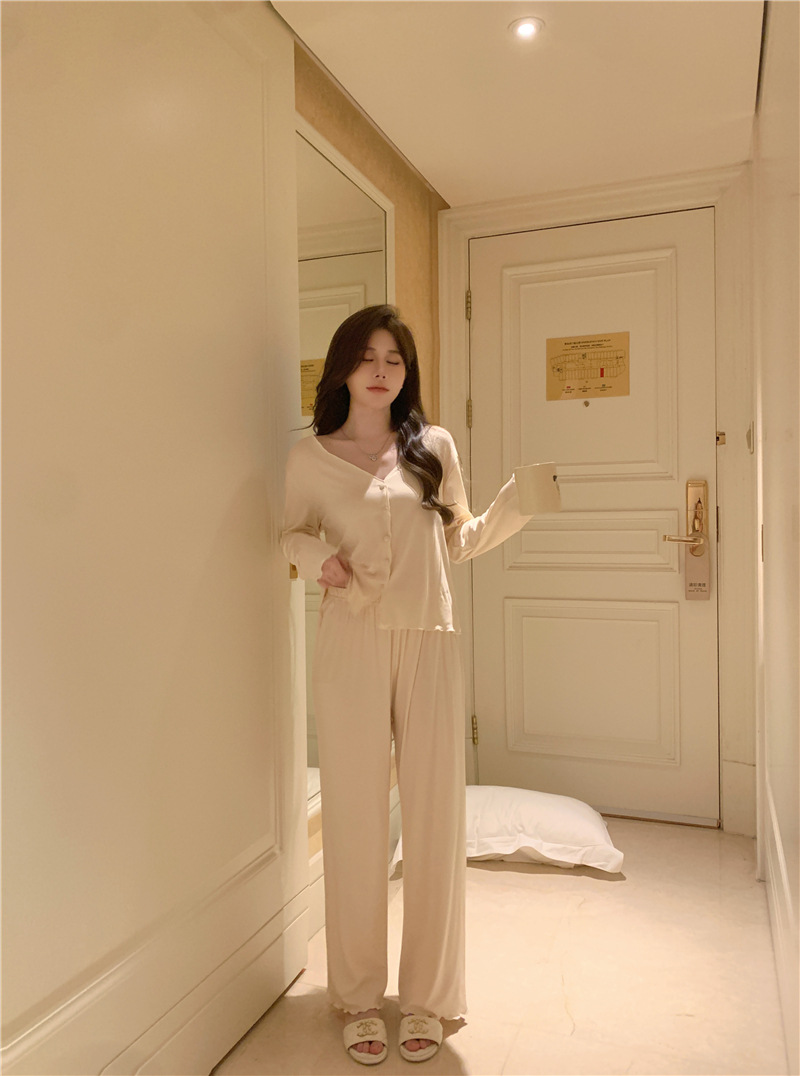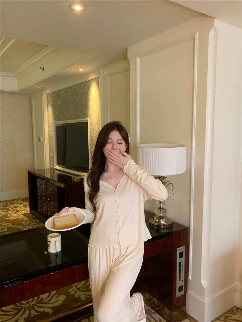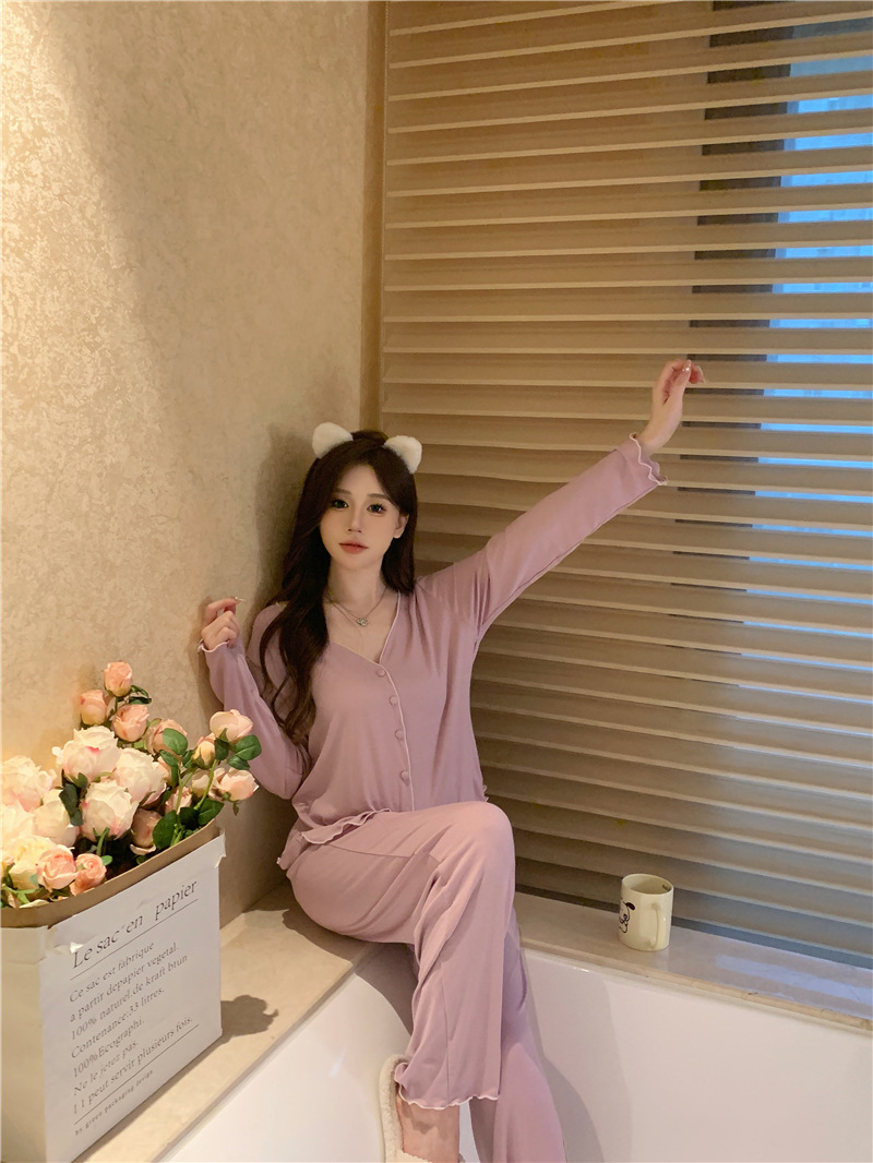 パジャマ春夏秋モーデルコットンセクシー快適vネック長袖長ズボンセットホームウェア