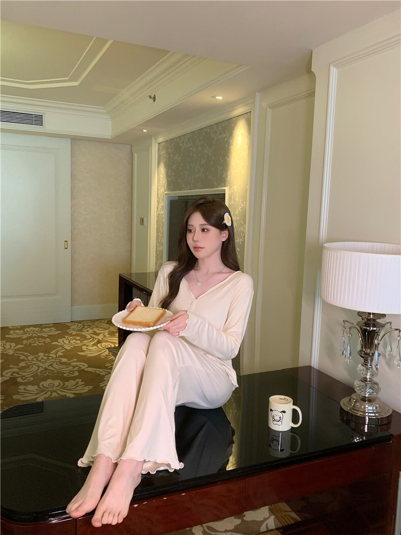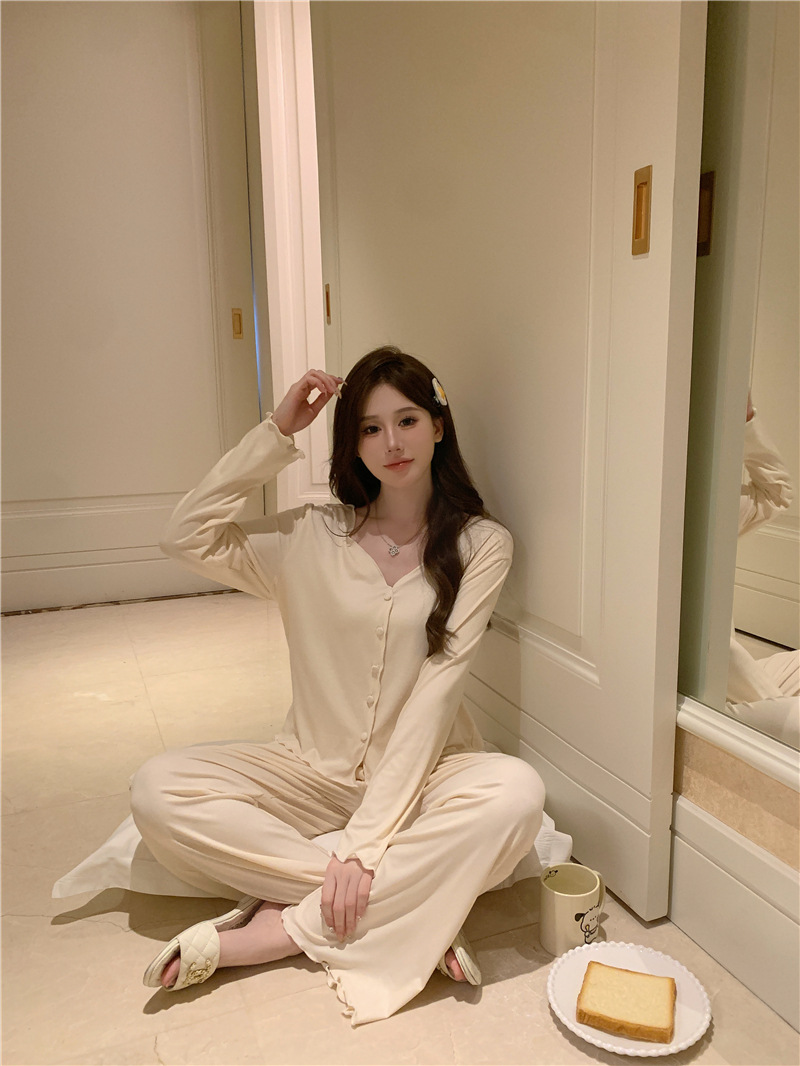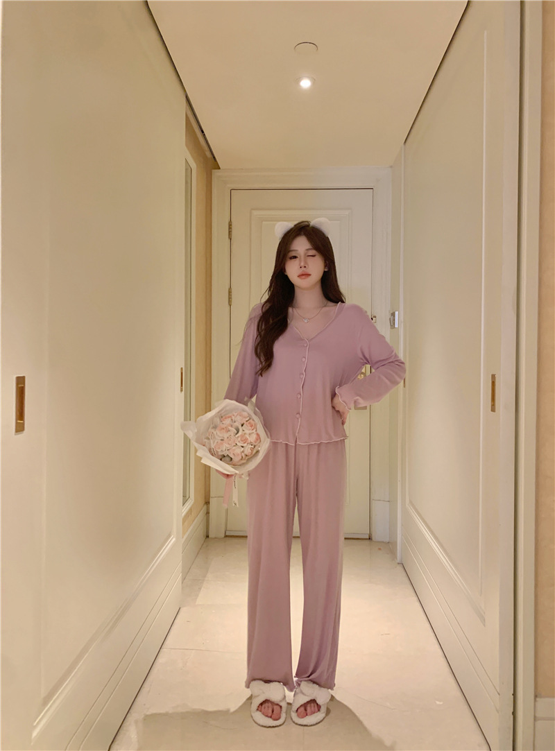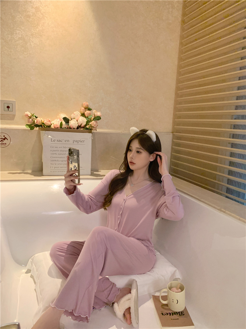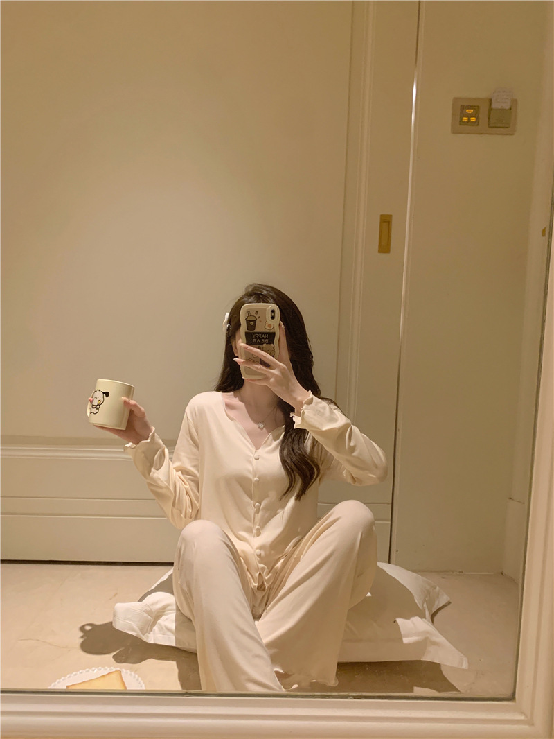 パジャマ春夏秋モーデルコットンセクシー快適vネック長袖長ズボンセットホームウェア