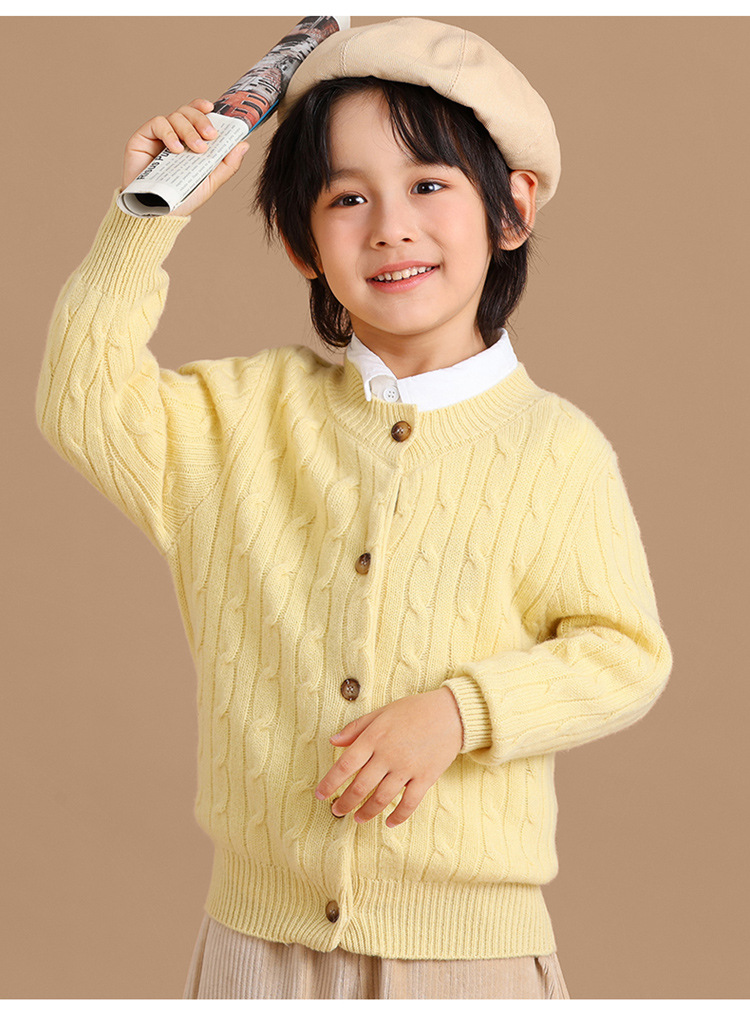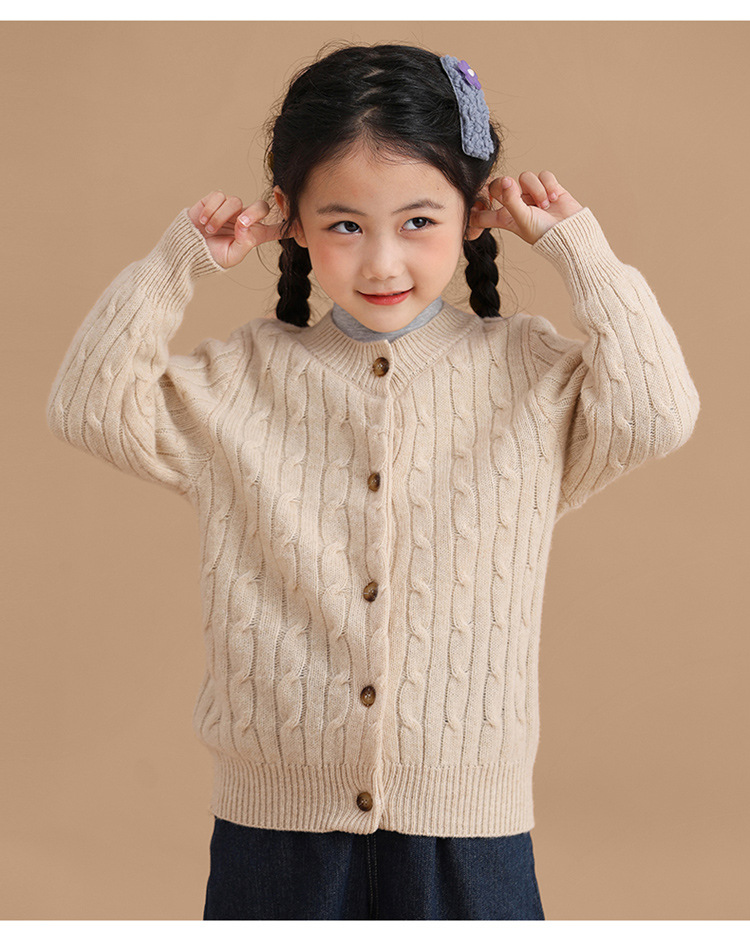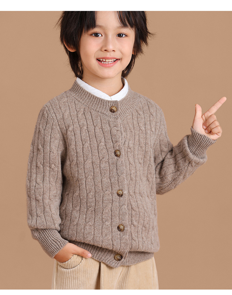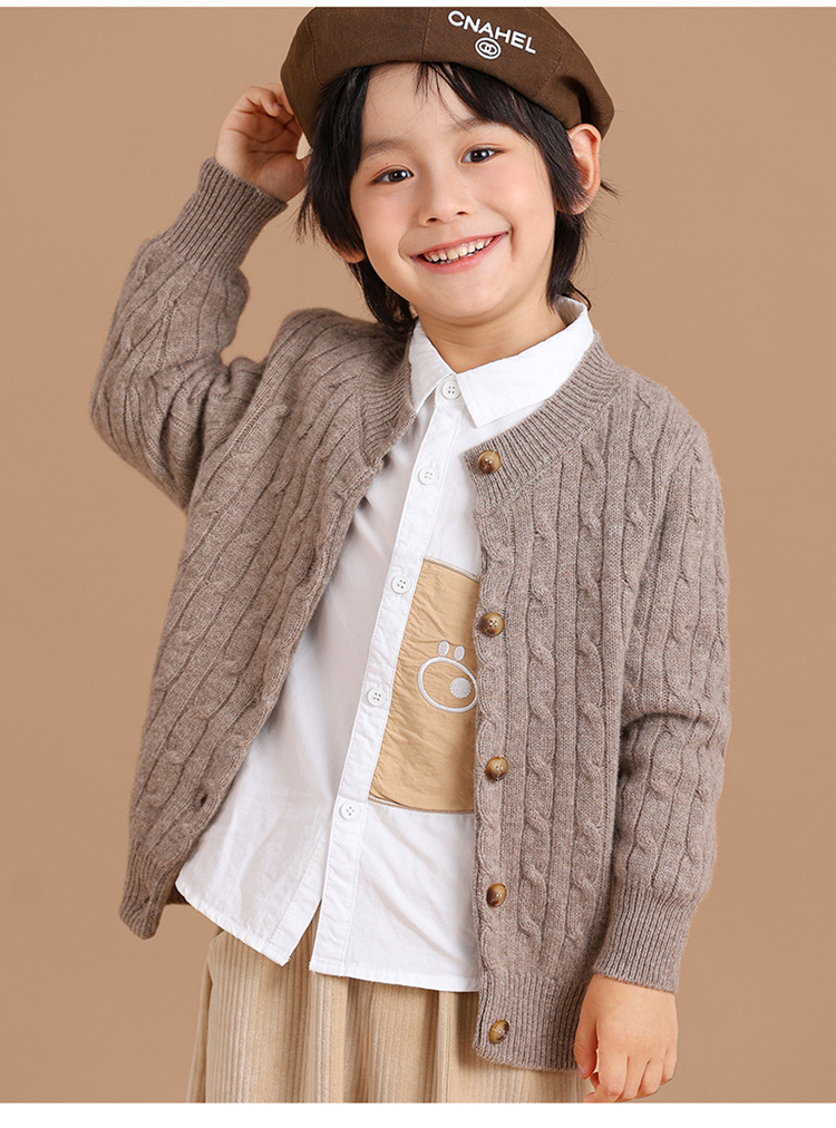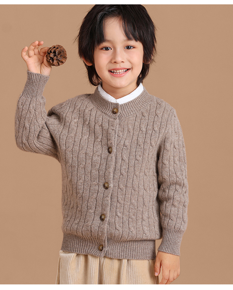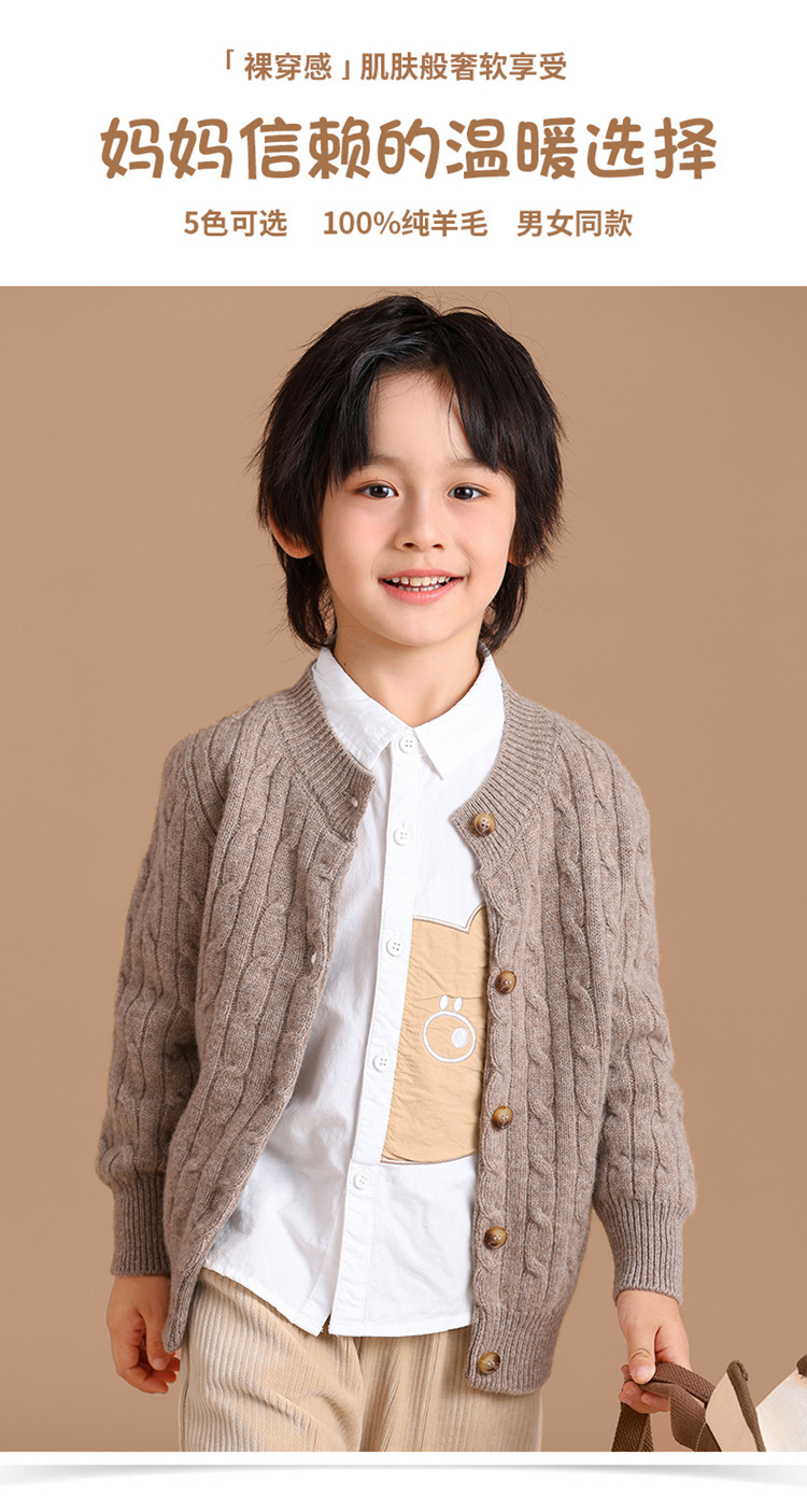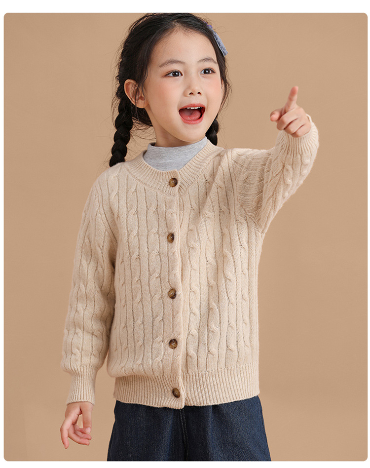 男女子供100% 純ウールクラシックレトロ麻花ニットカーディガン厚手丸襟純色洋気セーター潮