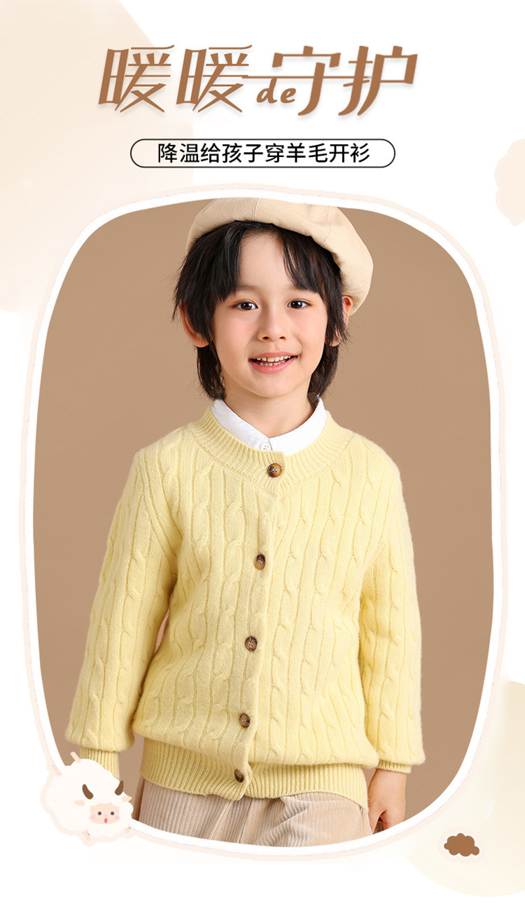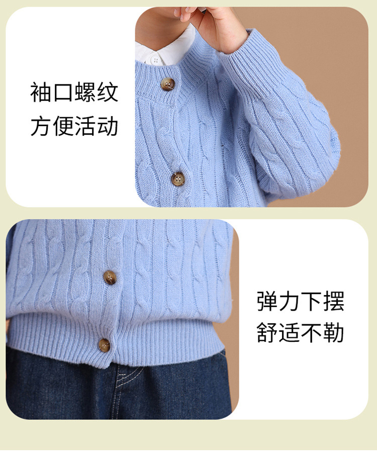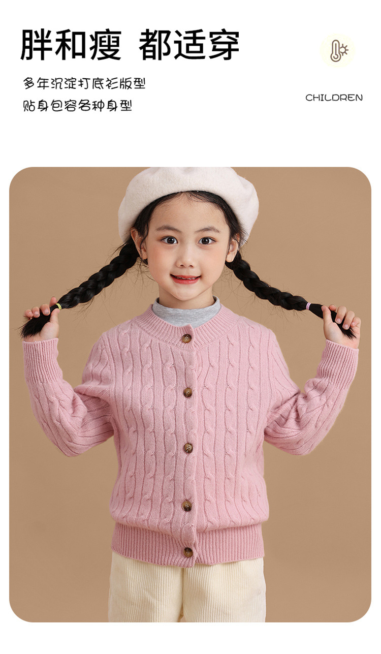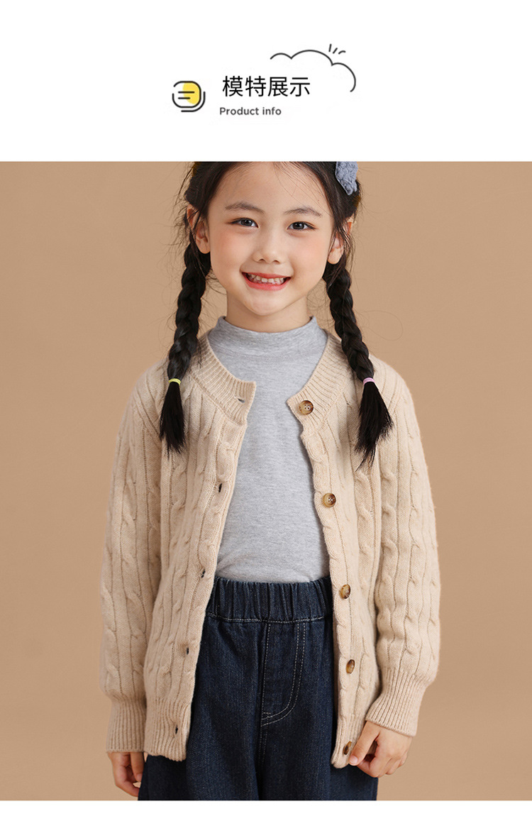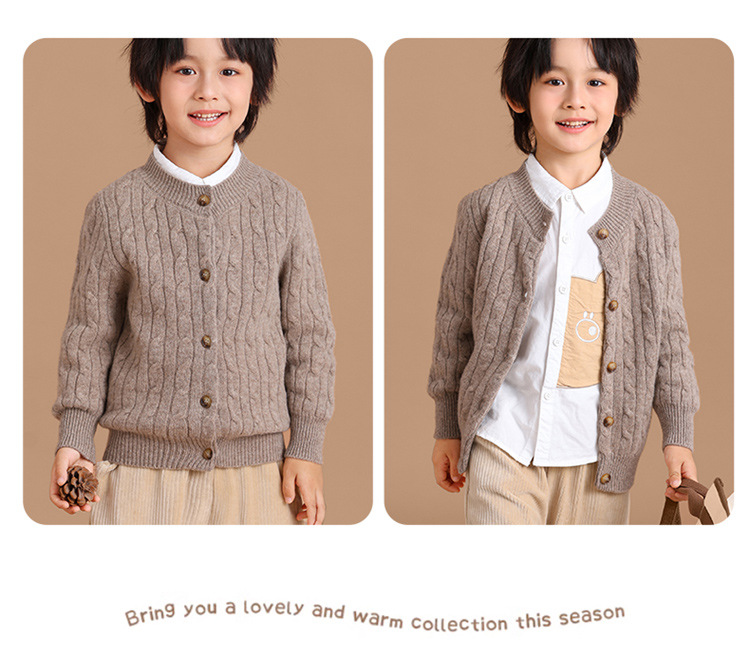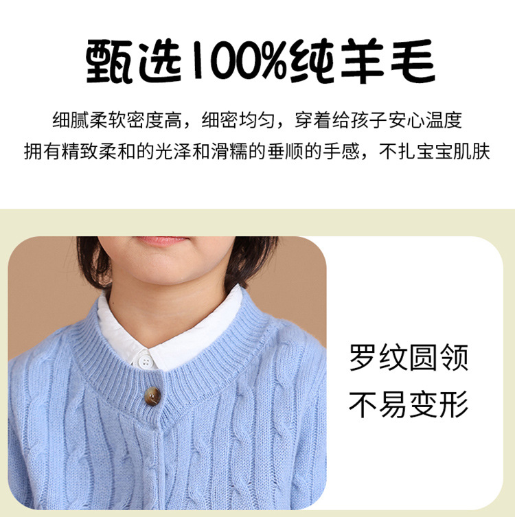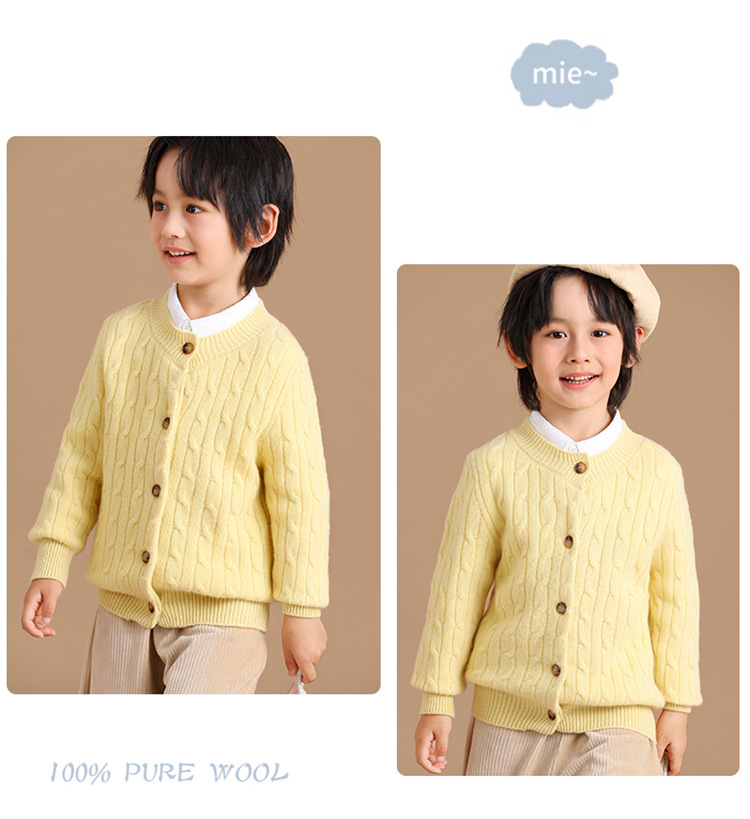 男女子供100% 純ウールクラシックレトロ麻花ニットカーディガン厚手丸襟純色洋気セーター潮