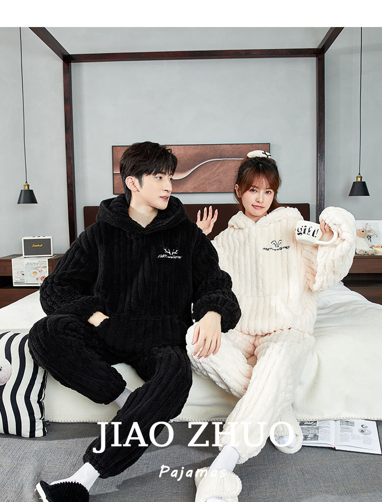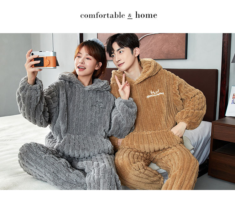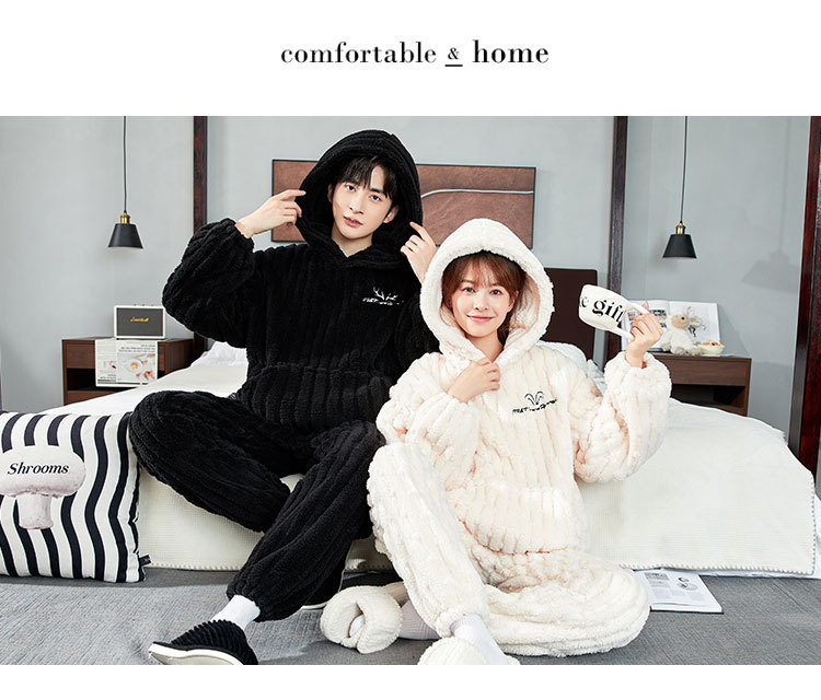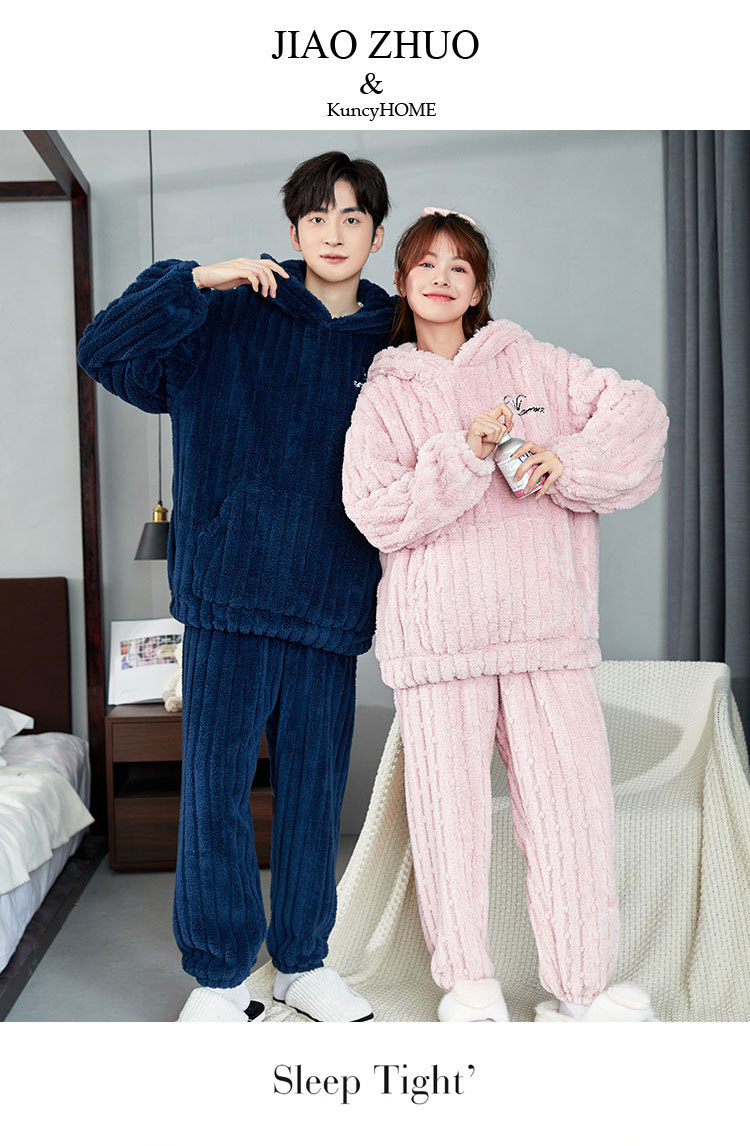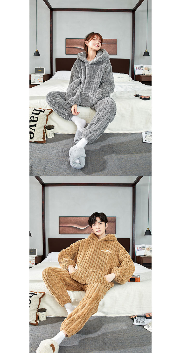 カップルパジャマ冬のサンゴのベルベットの厚いベルベットのフード付き男性女性秋冬フランネルの家庭服セット