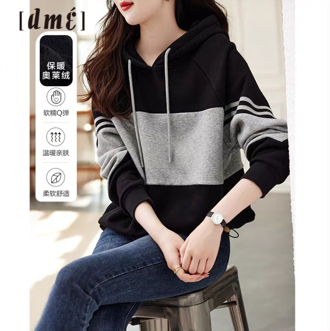 春秋の新型の黒い灰色のストライプは帽子の衛の女性の韓国版のinsの湿っている洋風のカジュアルな頭の上着をつなぎ合わせます。