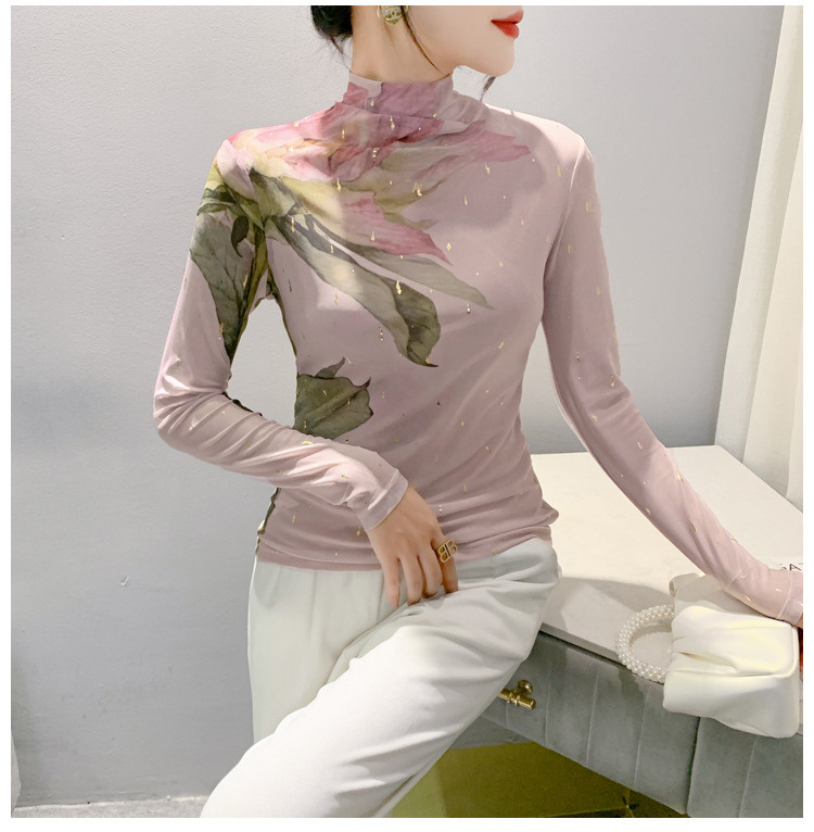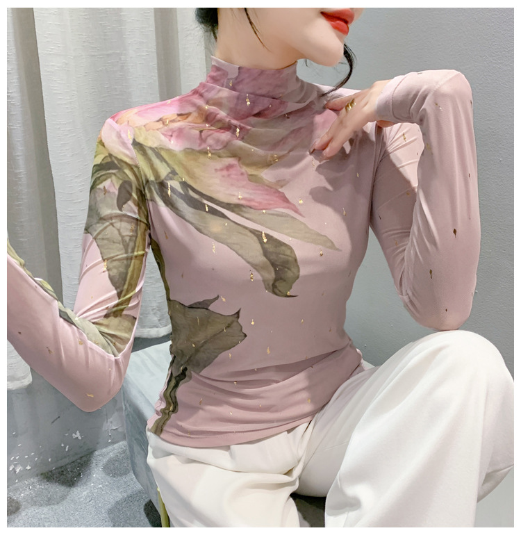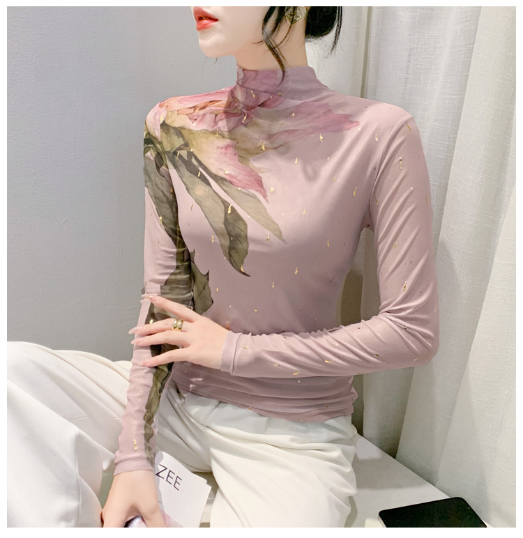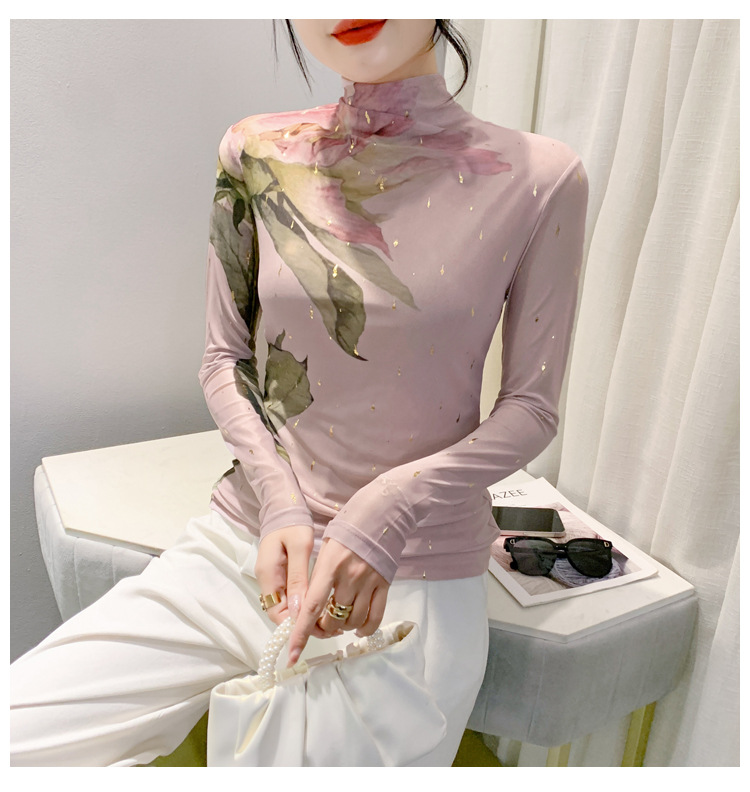 欧品女装2023秋ファッション洋気長袖高襟ネット糸tシャツ女性箔押し定位花底シャツ上着