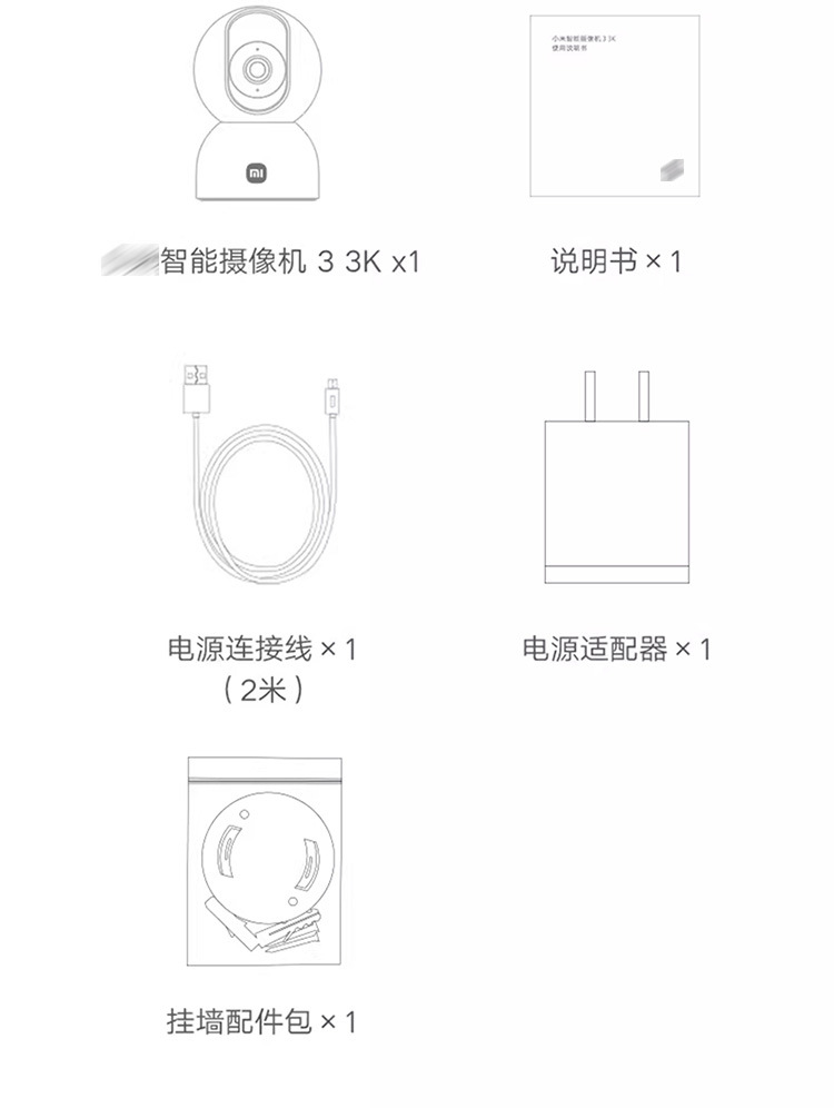 スマートカメラ 3 3K 1台、取扱説明書 1部、電源ケーブル 1本、電源アダプター 1個、壁掛け用アクセサリーキット 1個