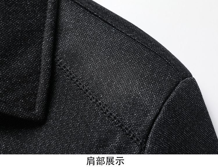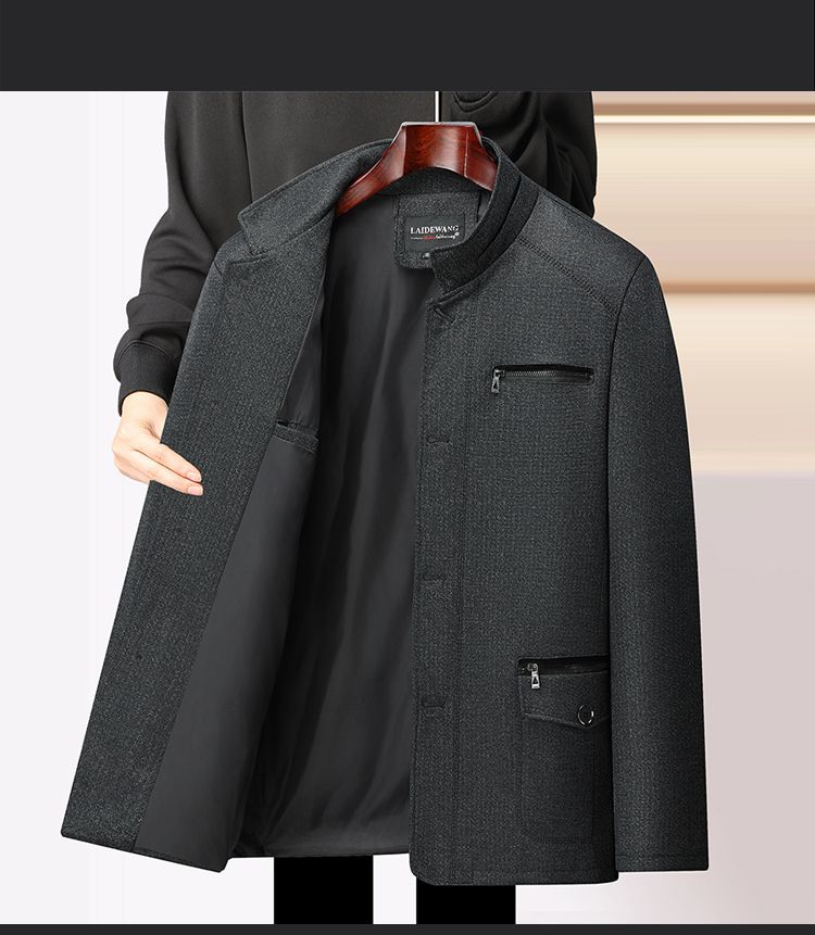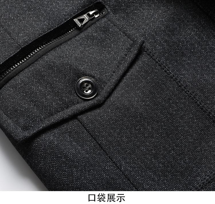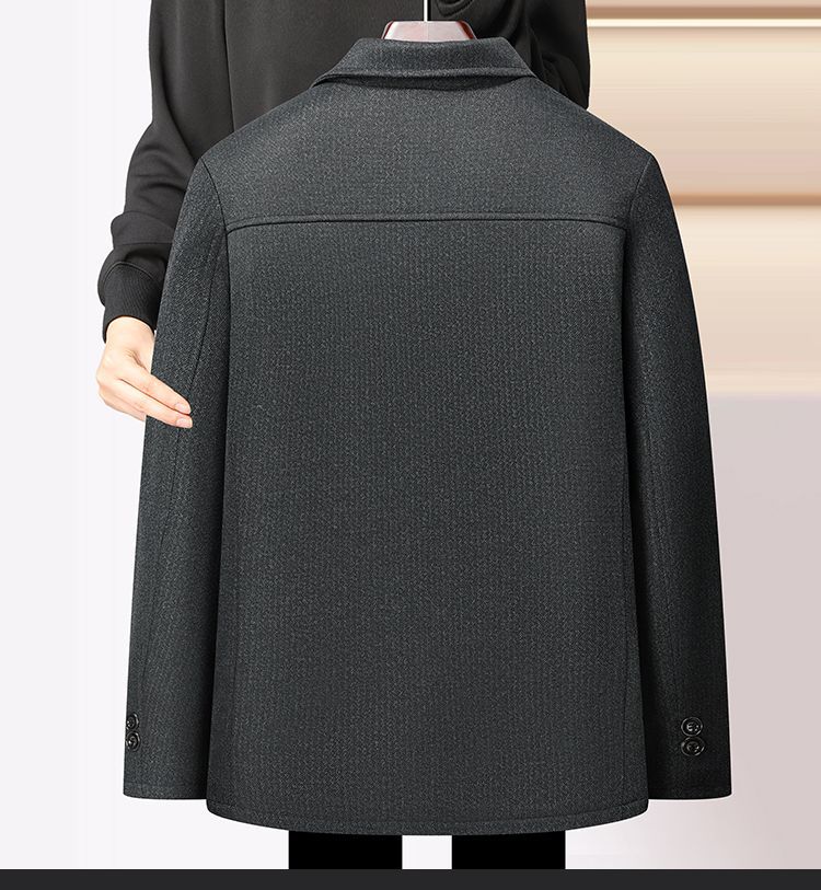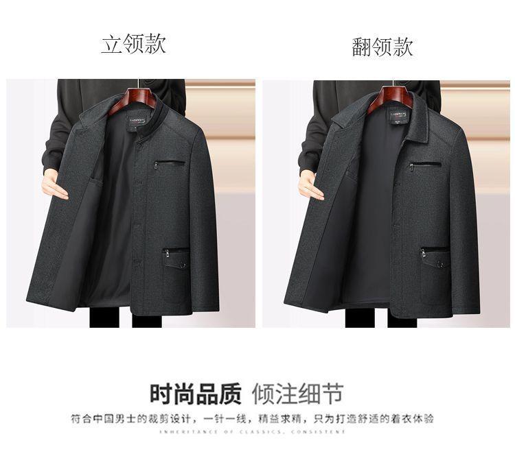 秋冬の中高年のメンズとベルベットのコートのお父さんはビジネス服の中年の男性の厚いジャケットの上着を襟を返します。