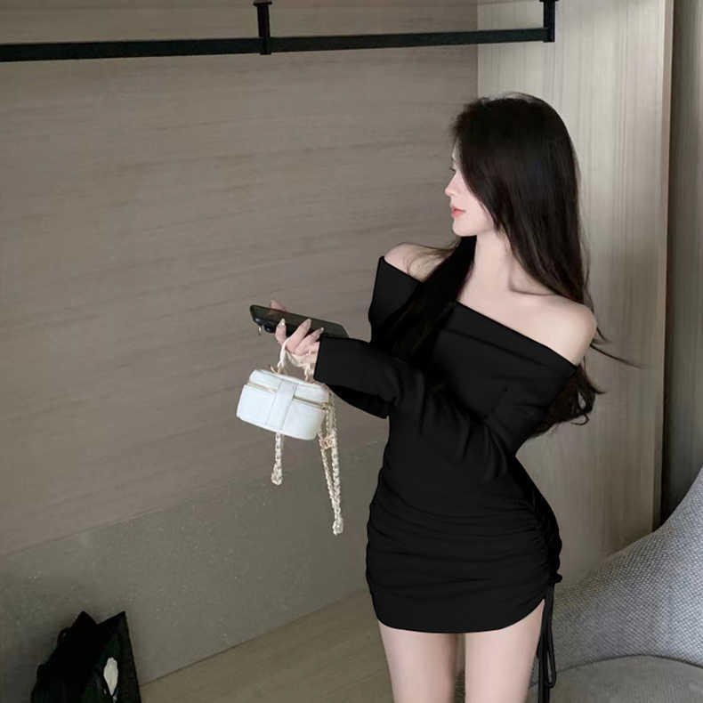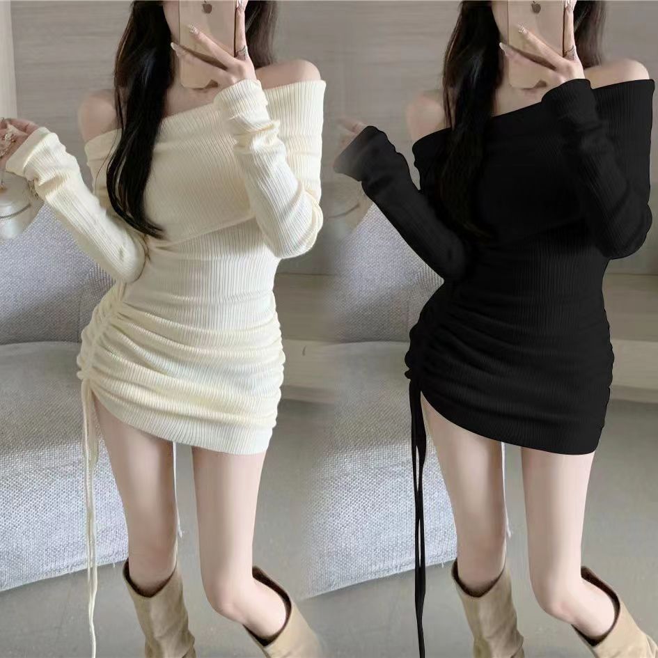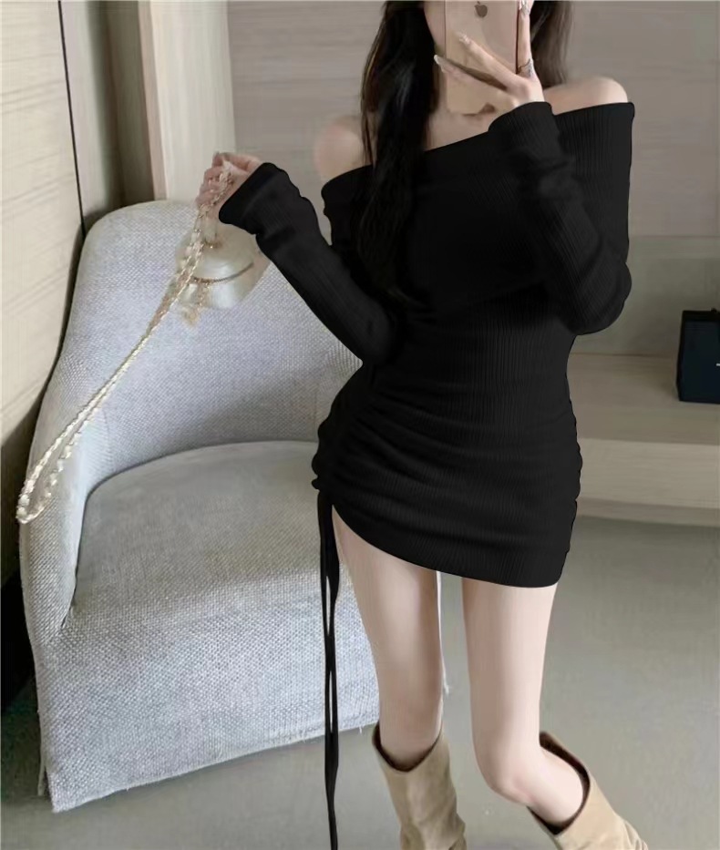 ワンショルダー長袖ニットワンピース レディース 秋 2026新作 ホットガール風 ドローストリング プリーツ ウエストシェイプ ヒップカバー スカート