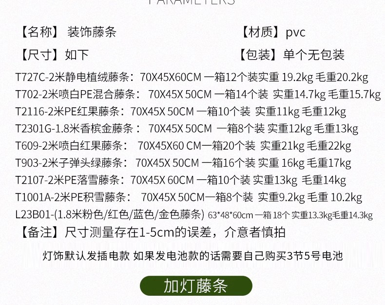 T609- 2m スプレー白と赤のフルーツ籐,T702- 2m スプレー ホワイト PE 混合ラタン,T727C-2m 静電植毛籐,T1001A- 2m PE スノーラタン,T2107- 2m PE 降雪ラタン,T2301G- 1.8m シャンパンゴールドラタン,L23B02-( 1.8m レッドラタン),L23B04-( 1.8m ブルーラタン),L23B05-(1.8mゴールデンラタン),L23B01-(1.8m ピンク籐),PEラタン(フラットスタイル),PEラタン(丸型),PEラタン(針式),PE植毛籐(フラットスタイル),PE植毛籐(丸型),PE植毛籐(針式),T609- 2m スプレー白と赤の果実籐 + ライト,T702- 2m スプレーホワイト PE 混合ラタン + ライト,T727C-2m 静電植毛籐 + ライト,T1001A- 2m PE スノーラタン + ライト,T2107- 2m PE 落雪籐 + ライト,T2301G- 1.8m シャンパンゴールドラタン+ライト,L23B02-( 1.8m レッドラタン)+ライト,L23B05-(1.8mゴールデンラタン)+ライト,L23B01-(1.8m ピンク籐)+ライト,L23B04-( 1.8m ブルーラタン)+ライト,PEラタン(フラットスタイル)+ライト,PEラタン(丸型)+ライト,PEラタン(針式)+ランプ,PE植毛籐(フラットスタイル)+ライト,PE植毛籐(丸型)+ランプ,PE植毛籐(針式)+ランプ,T2301R- 1.8m (レッド) ラタン,T2301R- 1.8m (レッド) ラタン+ライト,2306- 2m 2色PE籐,2306- 2m 2色PE籐+ライト,2318- 2m バナナリーフラタン,2318- 2m バナナリーフラタン+ライト,T2129- 2m (クリスマスフラワー) ラタン,T2129- 2m (クリスマスフラワー) 籐+ライト,T2510-1.8m ミックスラタン,T2510-1.8m ミックスラタン+ライト,Z25A11(<ne1>レッドゴールドラタン)+ライト