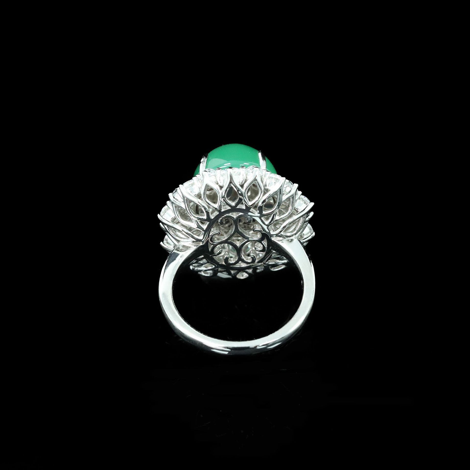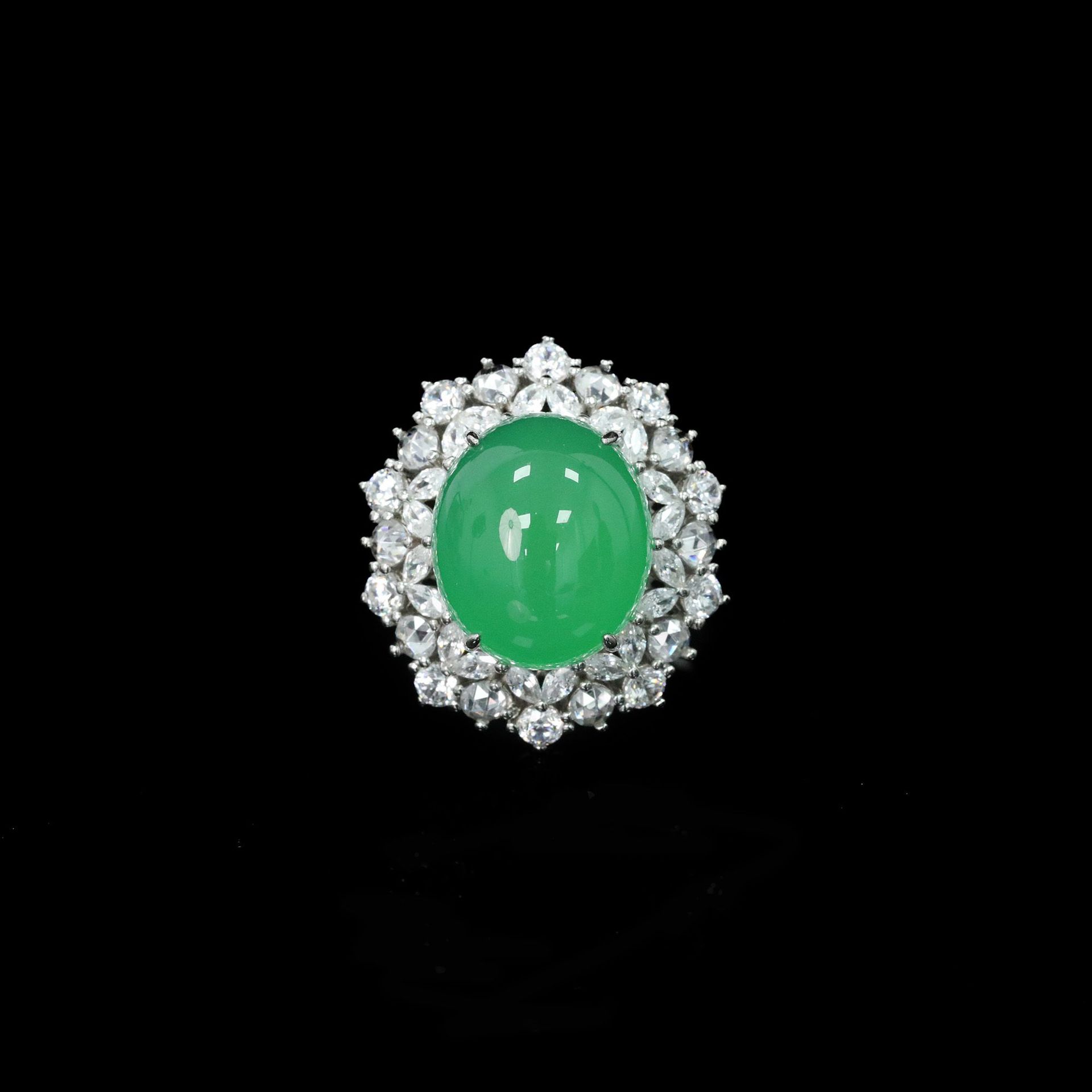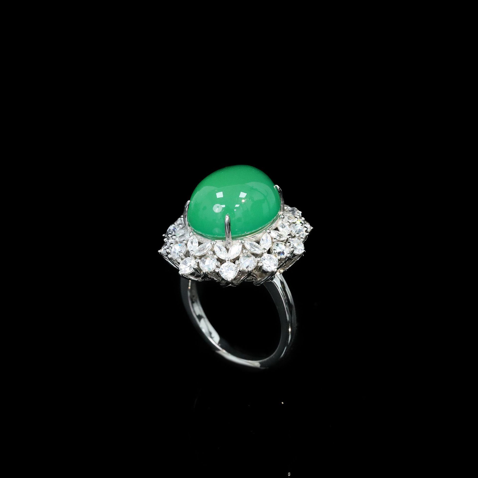 925シルバー金メッキリング、高炭素ダイヤモンド、天然カルセドニーエッグシェイプ、オークションフラワーモチーフ、ニッチで汎用性の高いジュエリー、富家の女性向け象嵌作品
