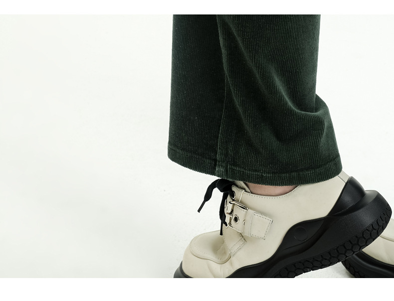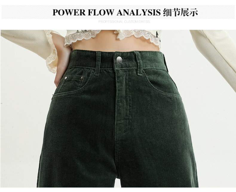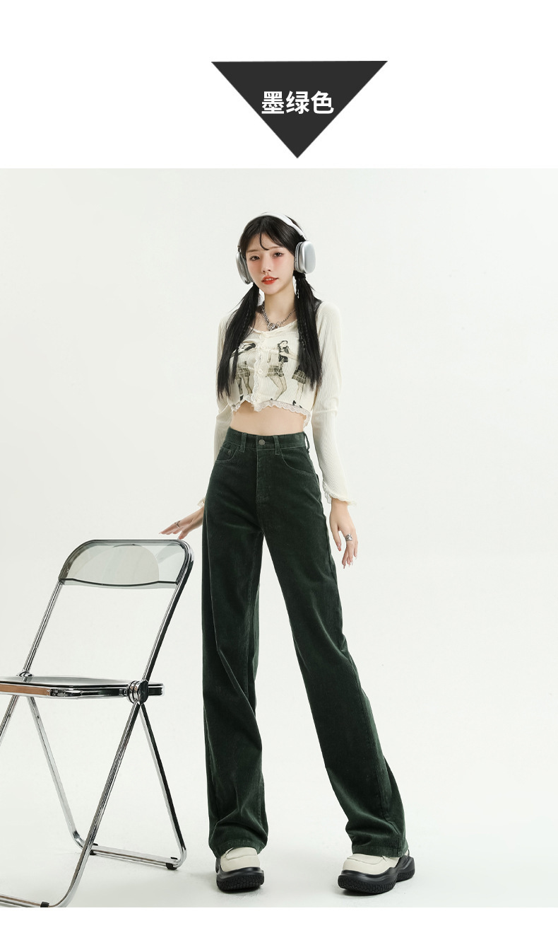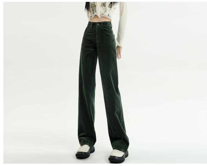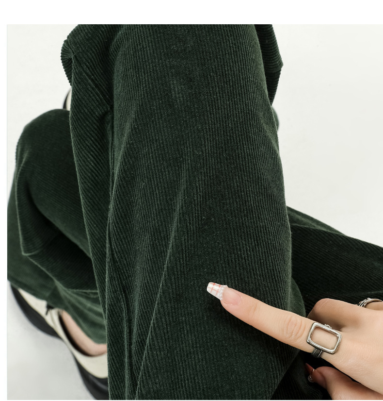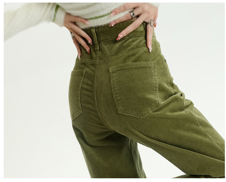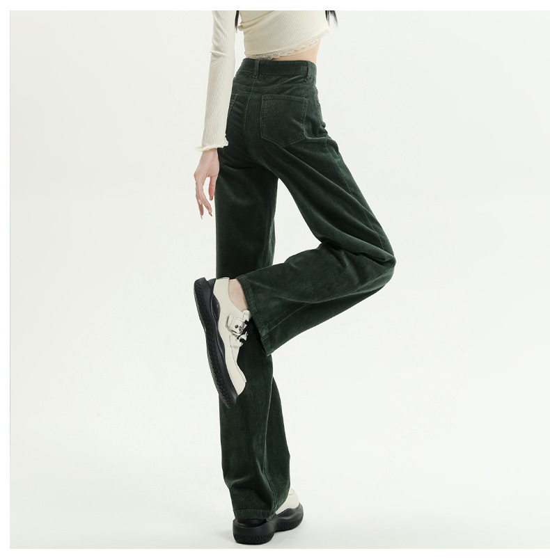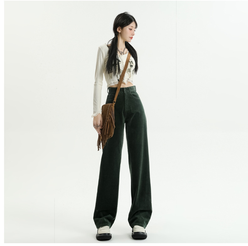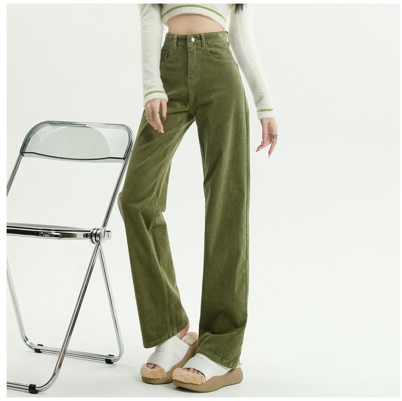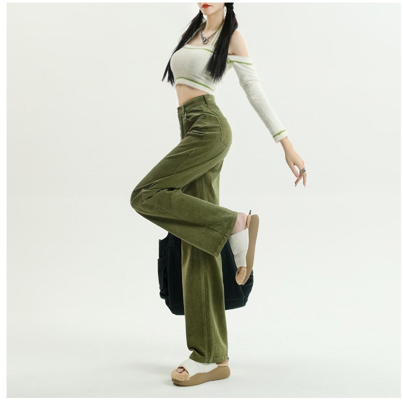 2024春秋人気商品 草緑色コーデュロイワイドパンツ レディース レトロハイウエストロングパンツ カジュアルロングストレートパンツ