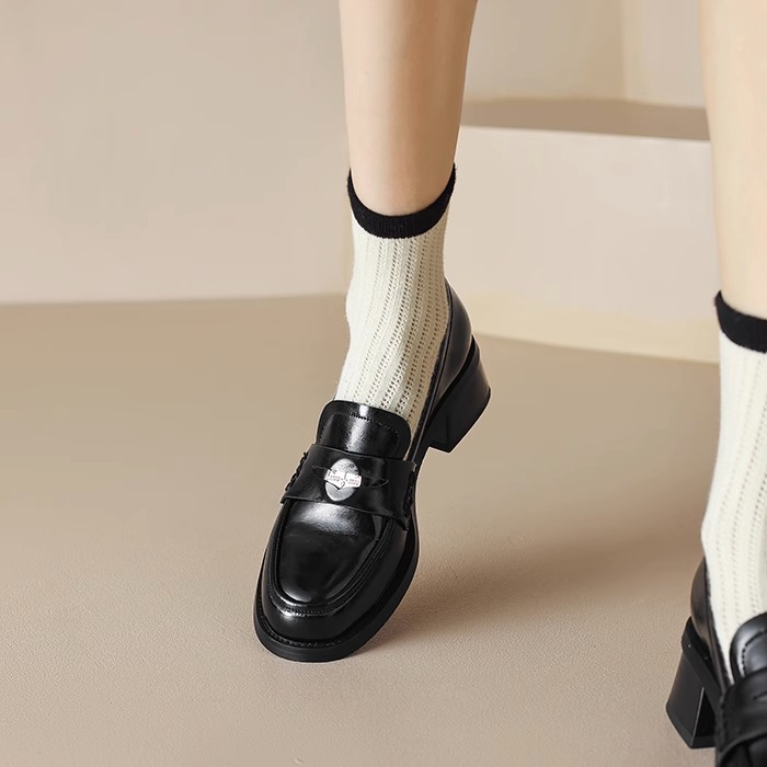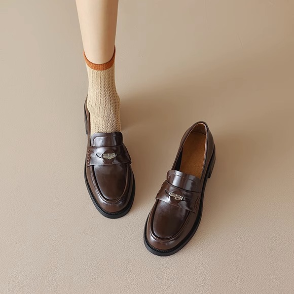 Xinyuda~柔らかくて柔らかい!とても履きやすいです!レトロブラウンゴールドコインラウンドトゥミッドヒールシングルシューズ小さな革靴レディースローファー