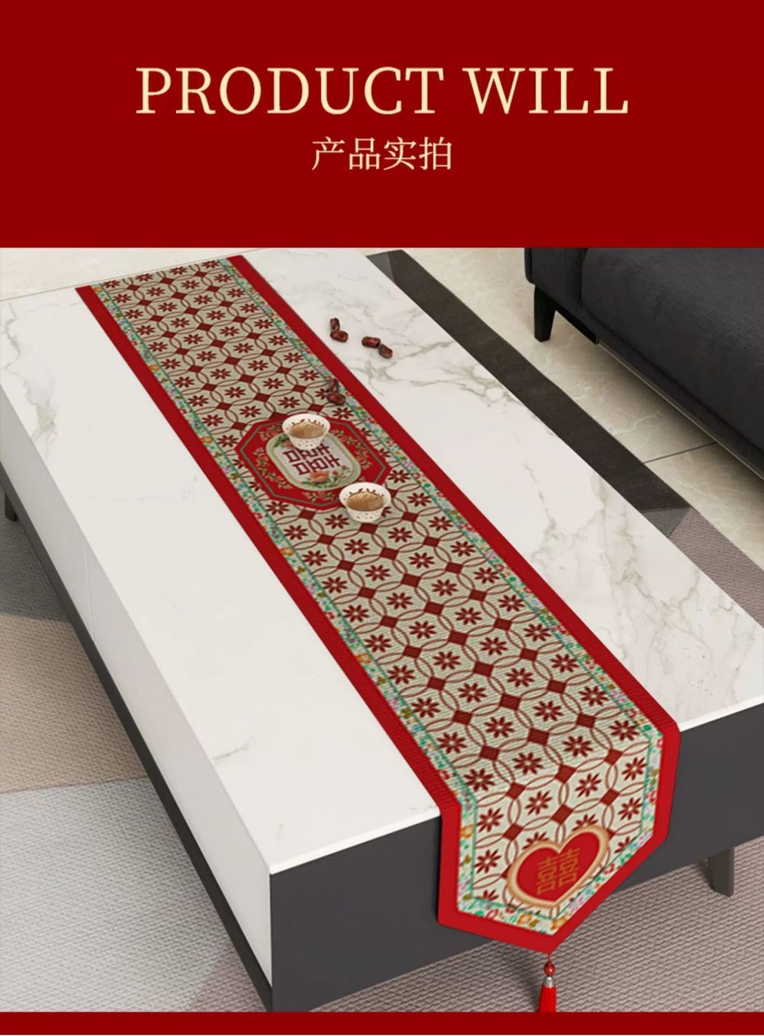 結婚の喜びの字のテーブルの旗の赤い祝い事はお茶の布のテーブルクロスを飾ります。