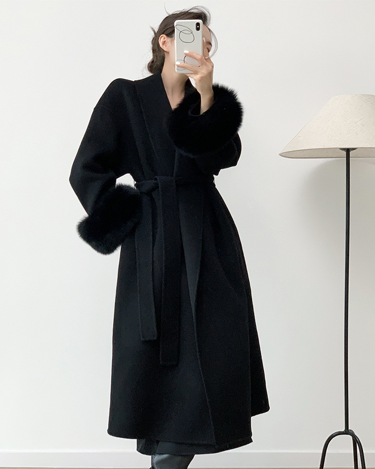 雰囲気のバスローブの長いタイプのウールの両面のラシャのコートの女性の高級な秋冬は本当にキツネの毛のコートを取り外します。