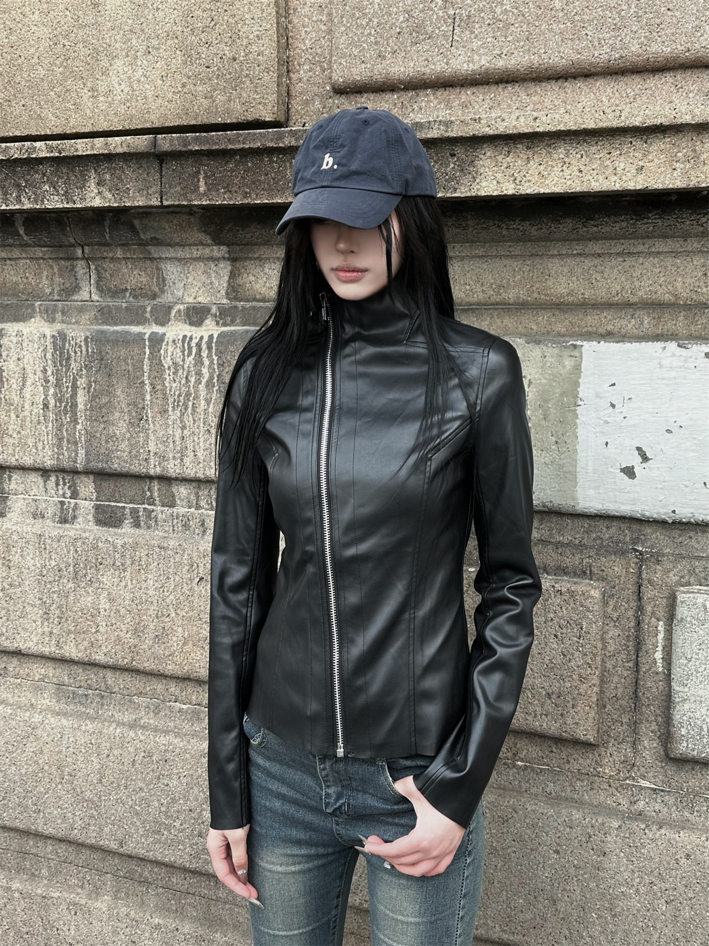 スバルレディース2024 2024春夏PUレザースリムスリム薄い生地斜めジッパー高襟レザージャケット