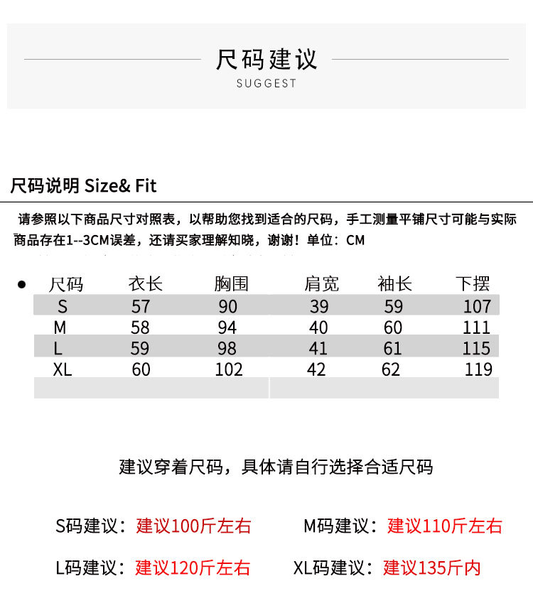 S (推奨100斤程度),M (推奨110斤程度),L (推奨120斤程度),XL (推奨 65kg 以内)