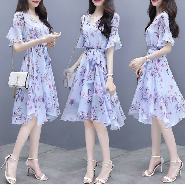 プリントの気質のワンピースの女性の夏の新型の韓国版の長いスカートは腰を収めてやせている仙女のスカートの中で長いスカートを現します。