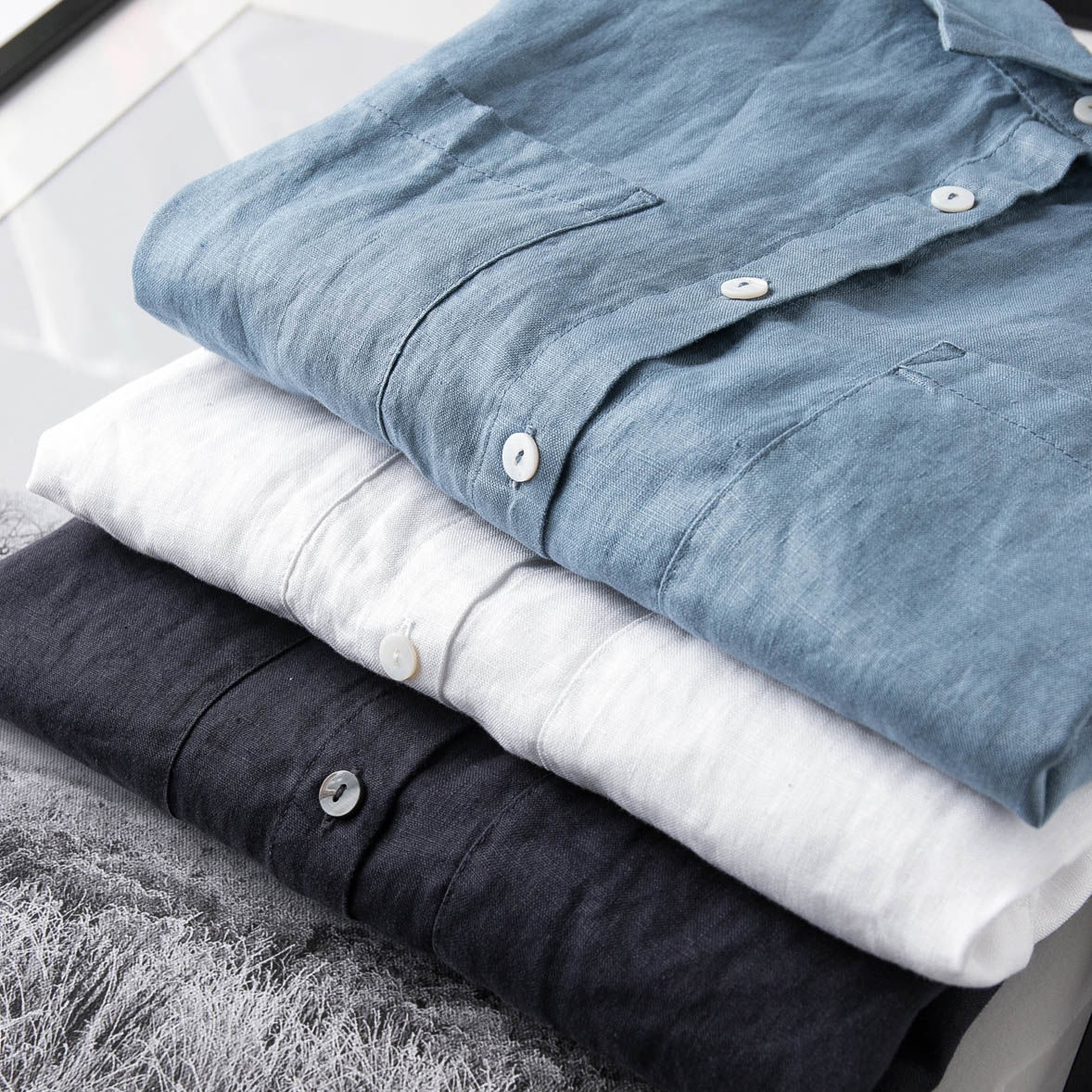 輸出日単14本輸入フランス純亜麻双胸袋中長長袖日焼け止め白シャツ上着女