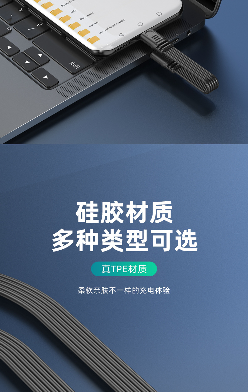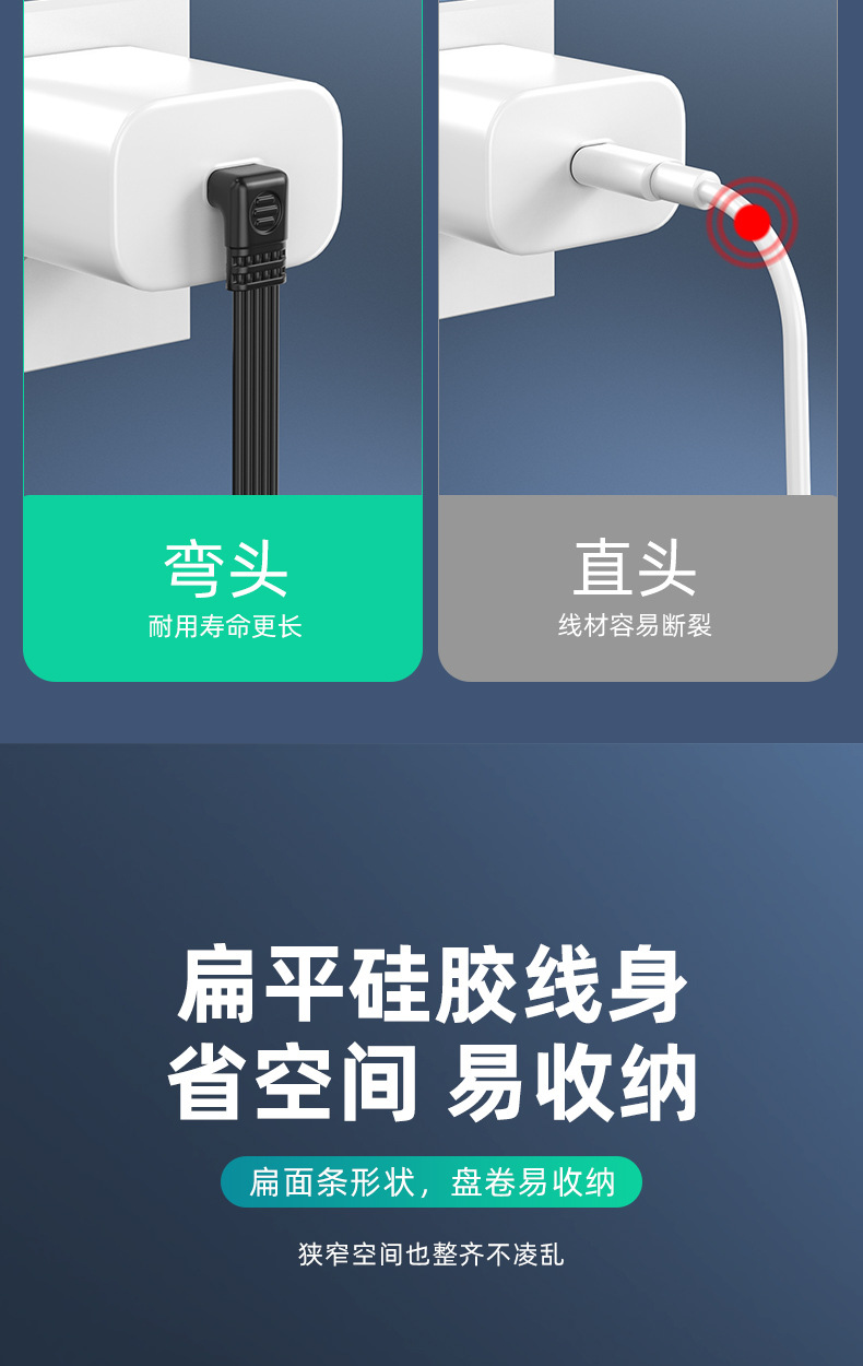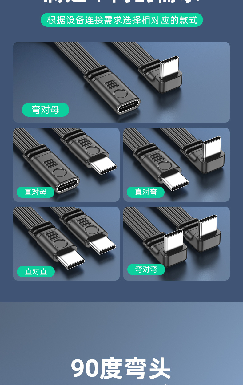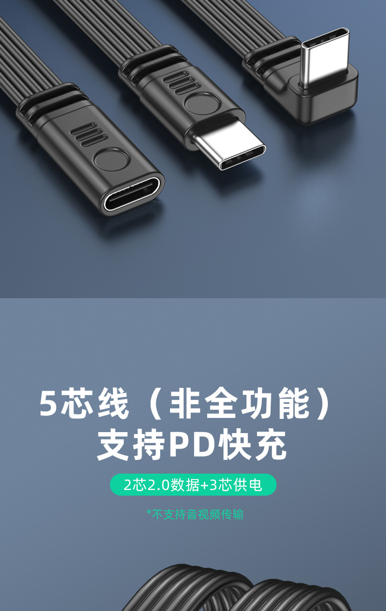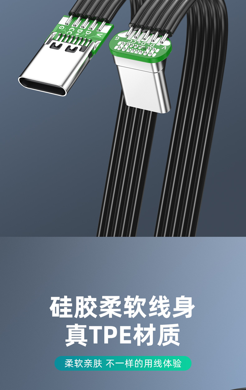 デュアルType-Cフラットシリコンケーブル デジタルアクセサリー 延長ケーブル データ転送 PD急速充電 エルボケーブル Type-C 車載用