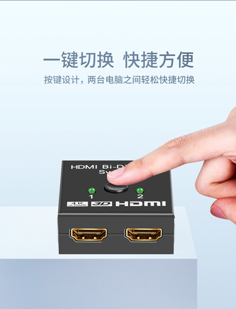 HDMI双向智能切换器,可以让一个HDMI端口分配出两个HDMI端口的高清音视频分配器,也可以从两个HDMI端口输入,一个HDMI端口输出的高清音视频切换器,仅仅通过产品上面的按钮,就可以轻松实现切换器和分配器之间的转换。可以使高清电视机顶盒、DVD播放机、D-VHS放映机和其他HDTV设备的HDMI信号分配出两路一致、同步的HDMI信号输出。用户输出的单路信号,可以同时连接高清投影机、DLP、LCD高清电视机等音像设备,而且支持蓝光、PS3等3D设备。让精彩的3D世界触手可及。
