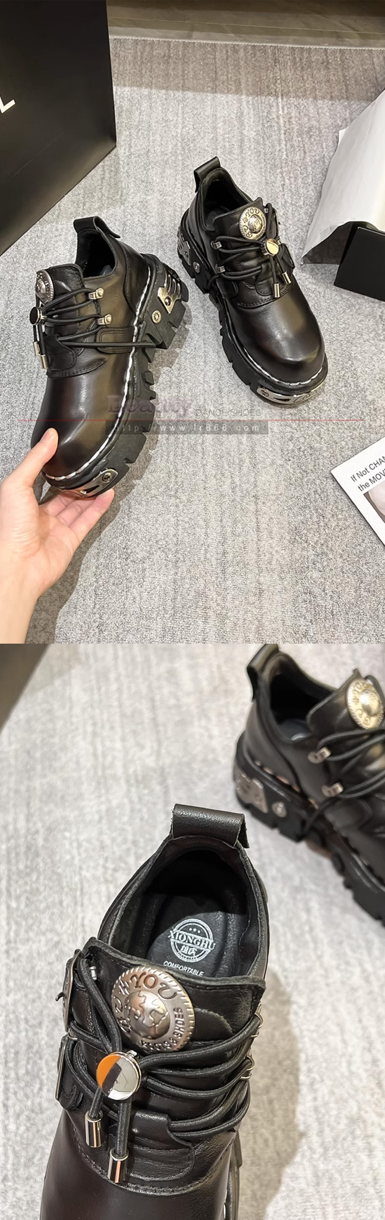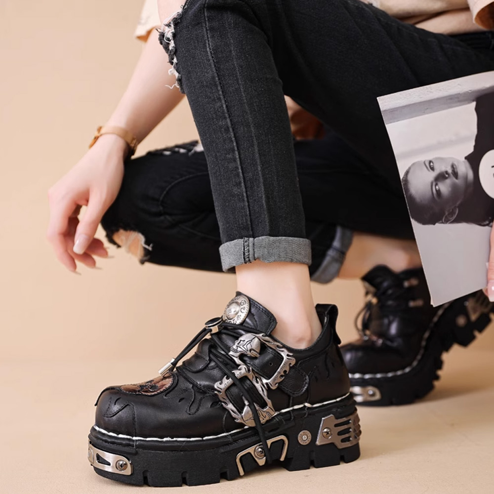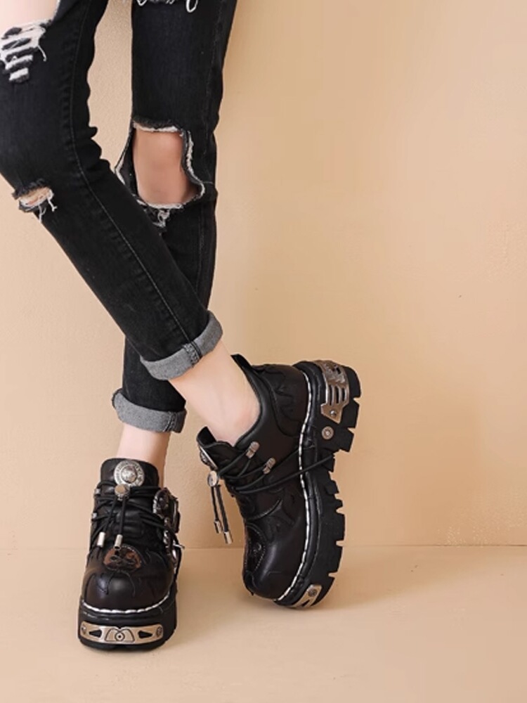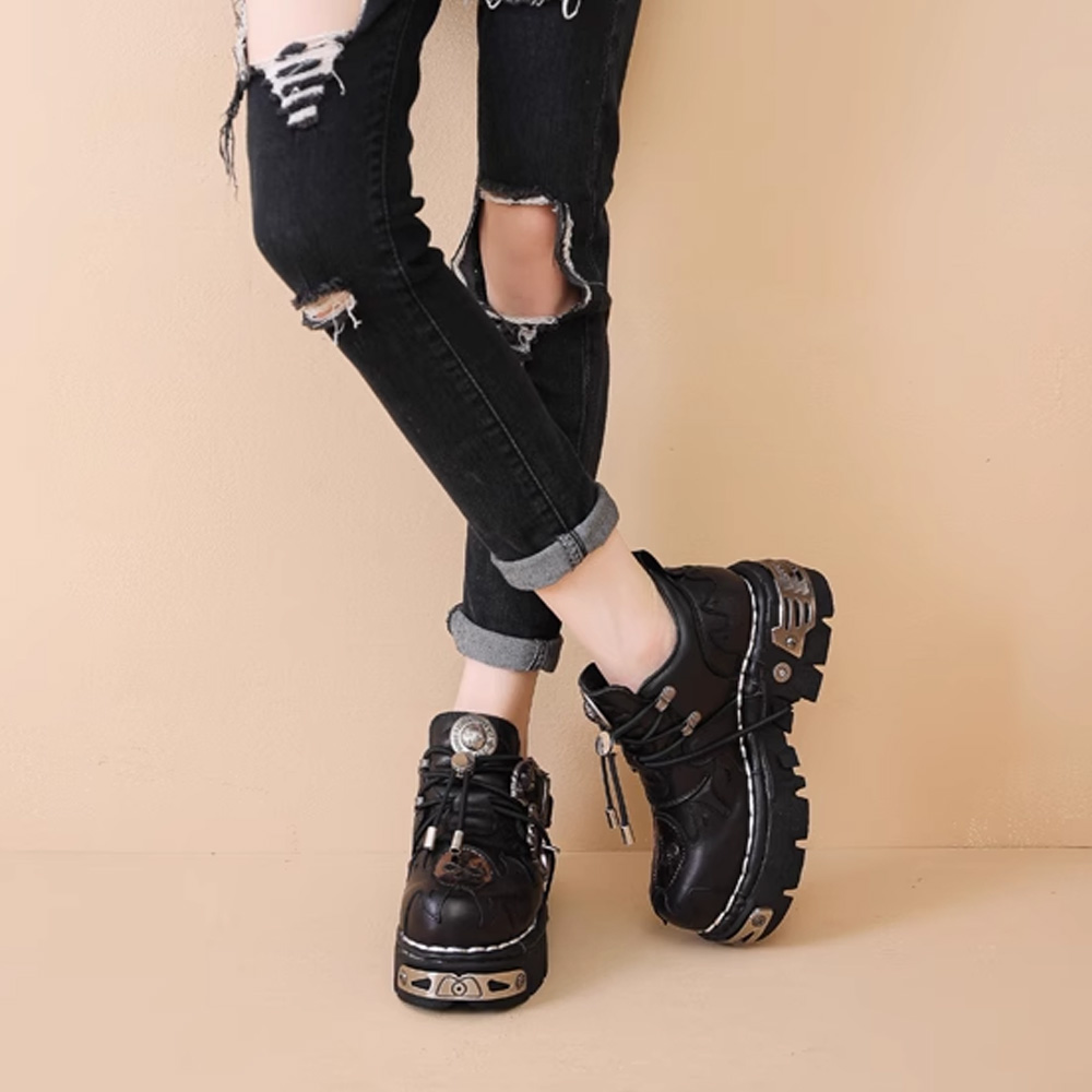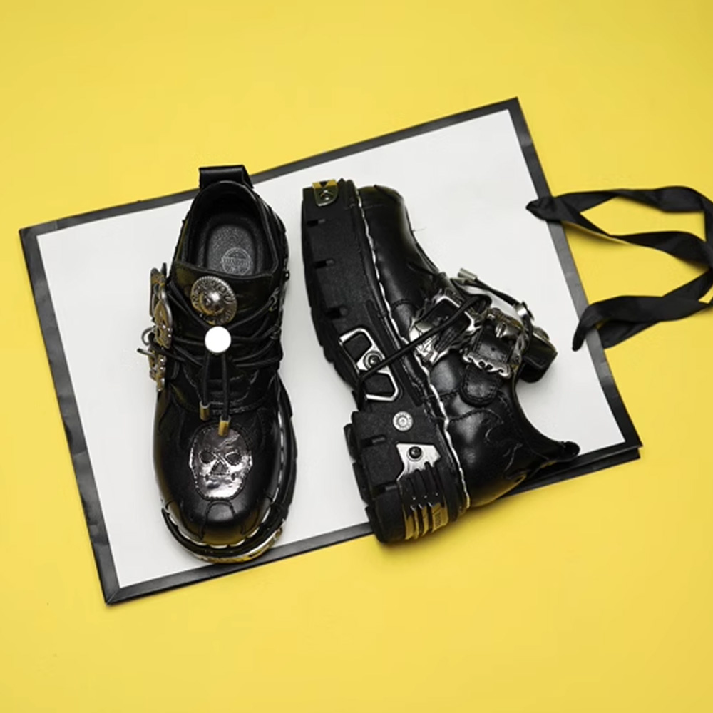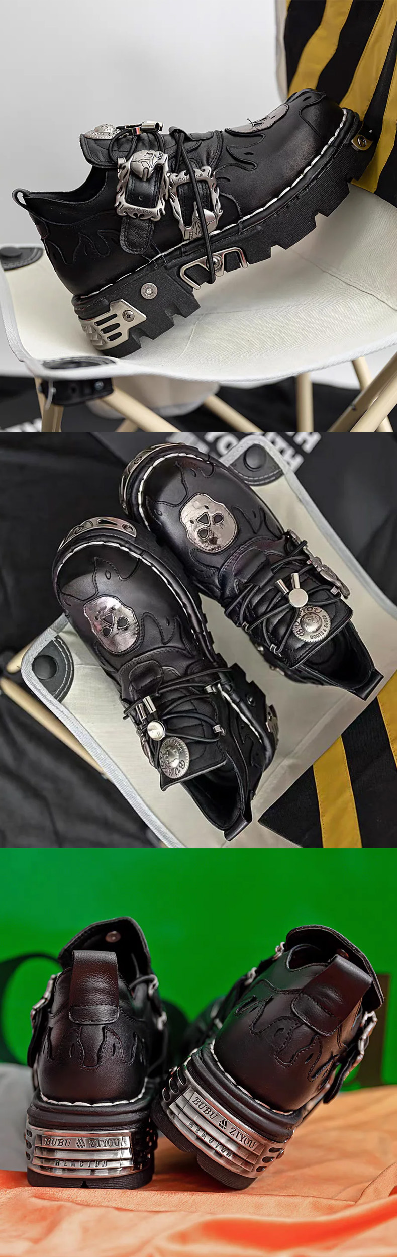 第一層牛革製バイクブーツ、ニューレトロなスカルヘッド、パンクメタルロック、トレンディなインスタイル、本革ローカット厚底シューズ