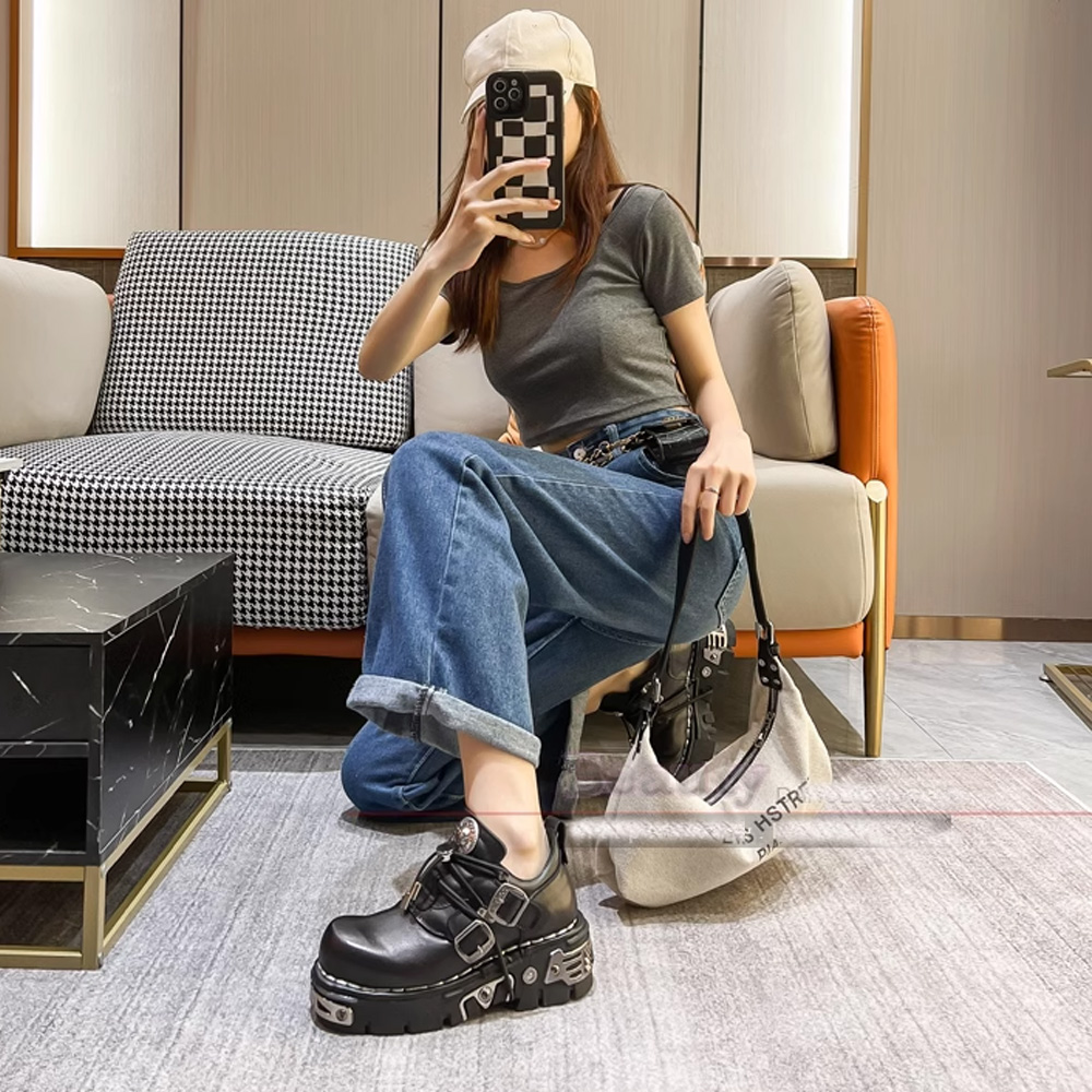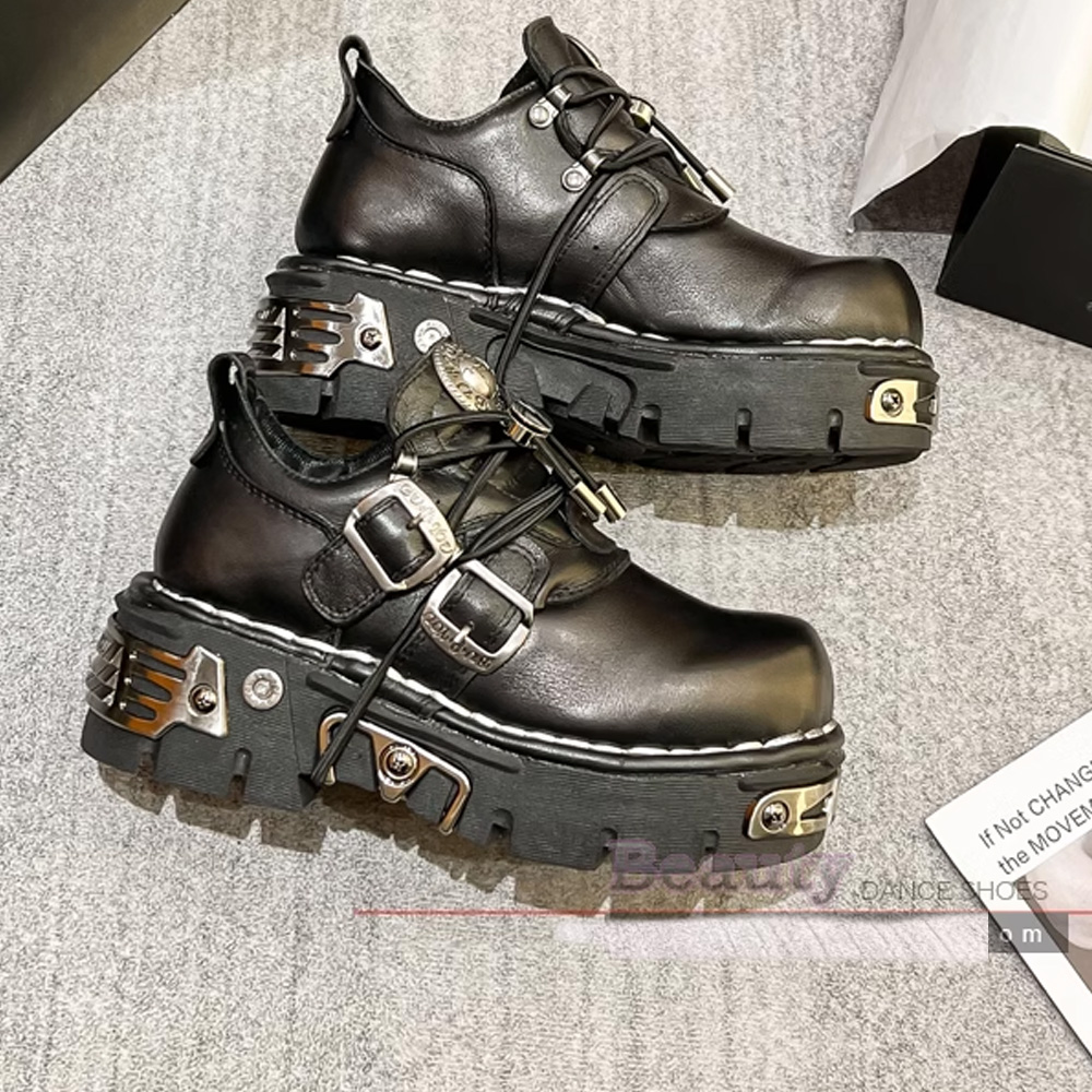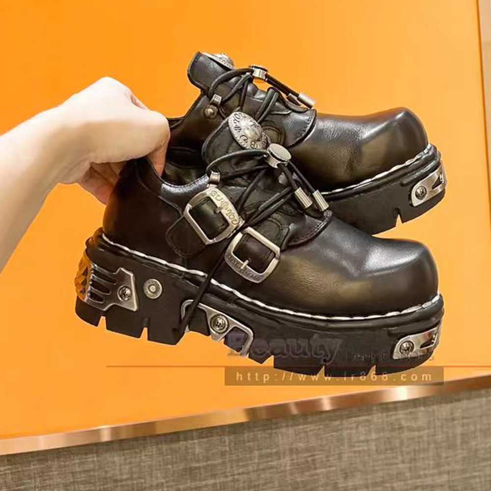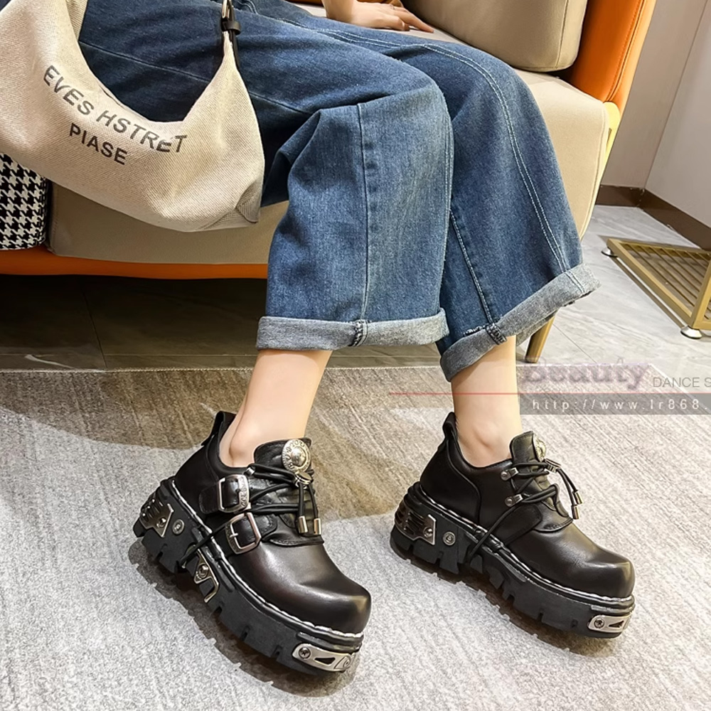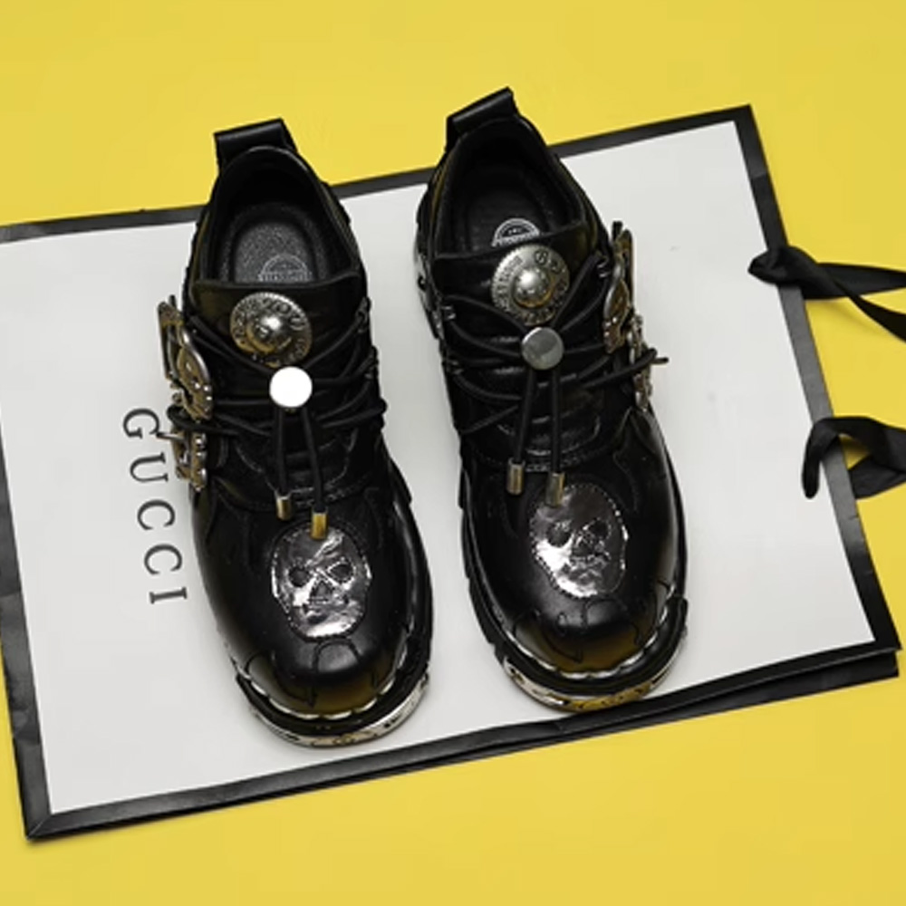 第一層牛革製バイクブーツ、ニューレトロなスカルヘッド、パンクメタルロック、トレンディなインスタイル、本革ローカット厚底シューズ