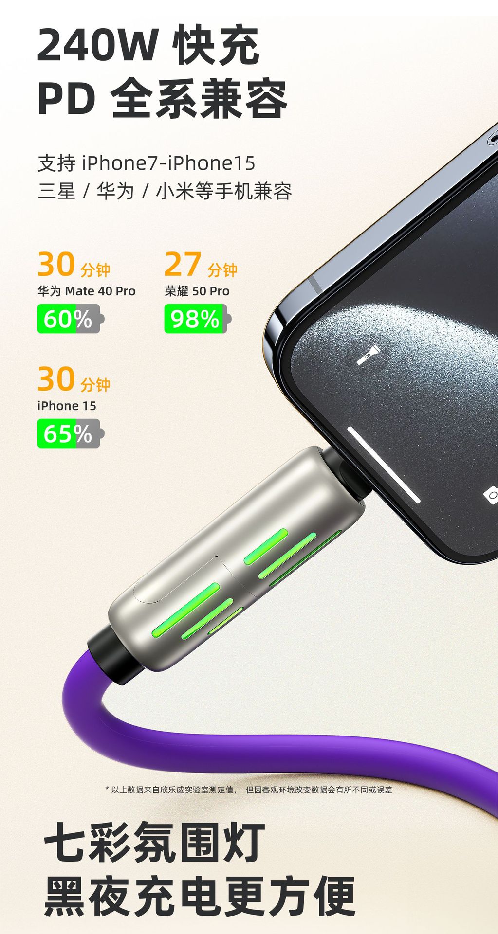 スポット 240 ワット急速充電 2 対 2 カラフルな呼吸ライトデータケーブル携帯電話多機能車タイプ C 充電ケーブル