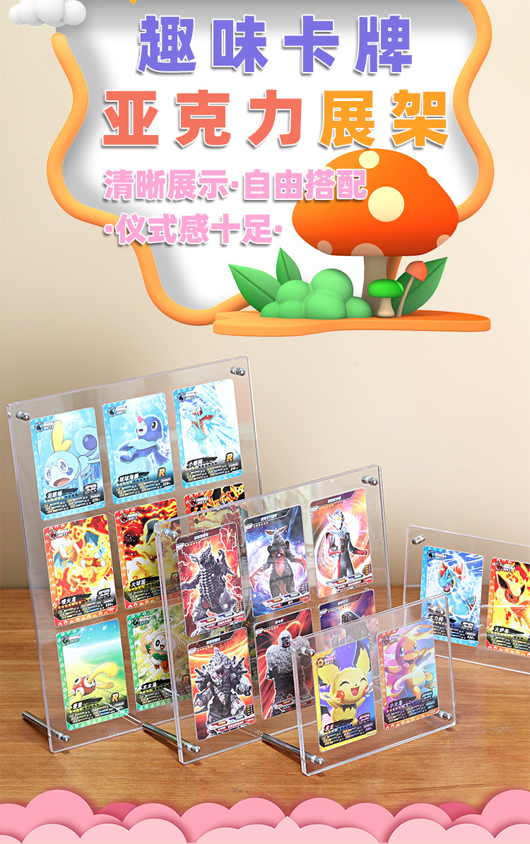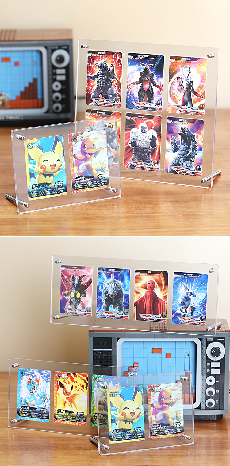 九宮格のフォトフレームは透明で台のボールの星のカードを並べて3寸の立て札を収めてウルトラマンの小さいカードの展示棚を収めます。