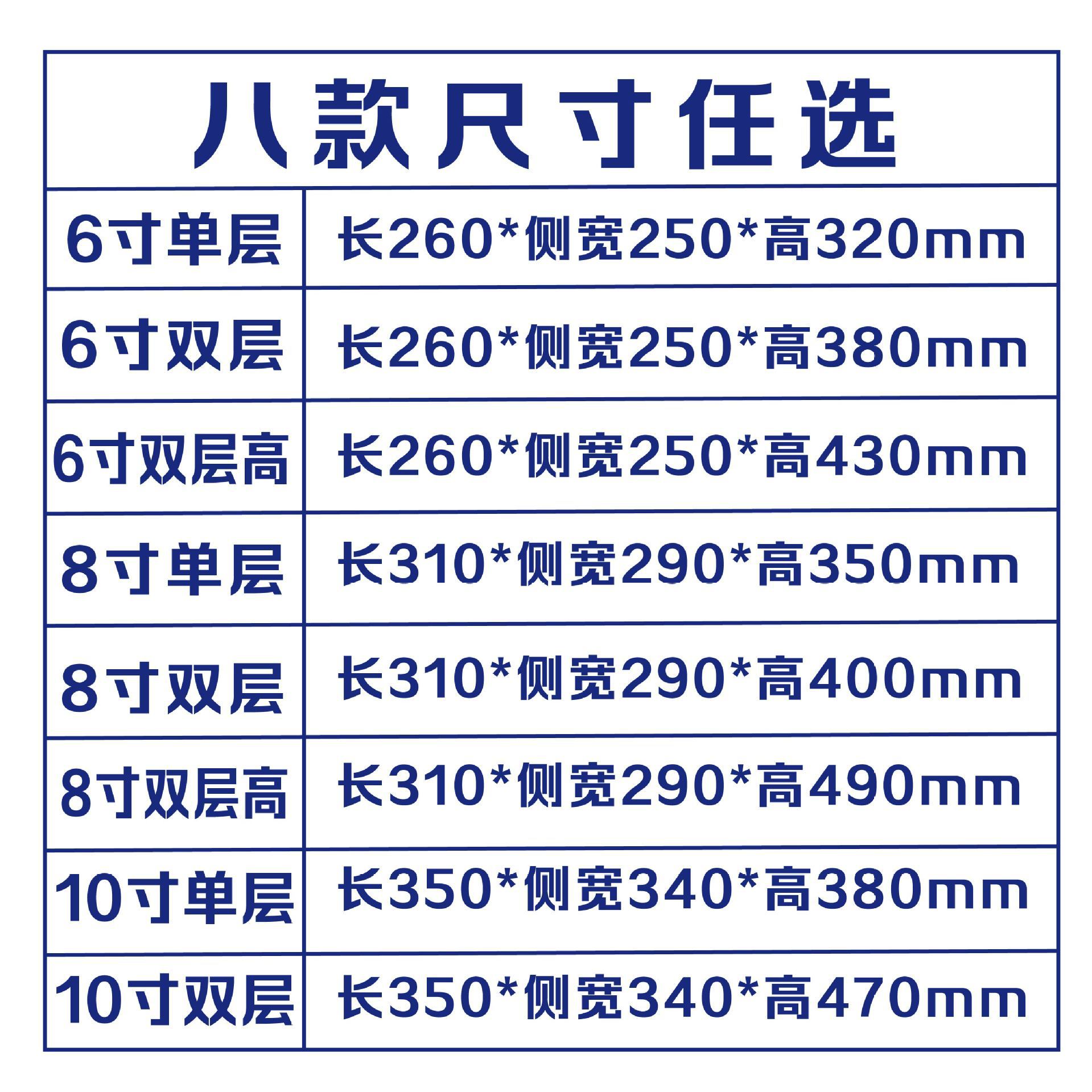 4inch (22*20*32 センチメートル),6inch 単層 (26*25*32 センチメートル),6inch 高さを高める (26*25*43 センチメートル),8inch 単層 (31*29*35 センチメートル),8inch 二重層 (31*29*40 センチメートル),8inch 高さ増加 (31*29*49 センチメートル),10inch 単層 (35*34*38 センチメートル),10inch 二重層 (35*34*47 センチメートル),6inch 二重層 (26*25*38 センチメートル)