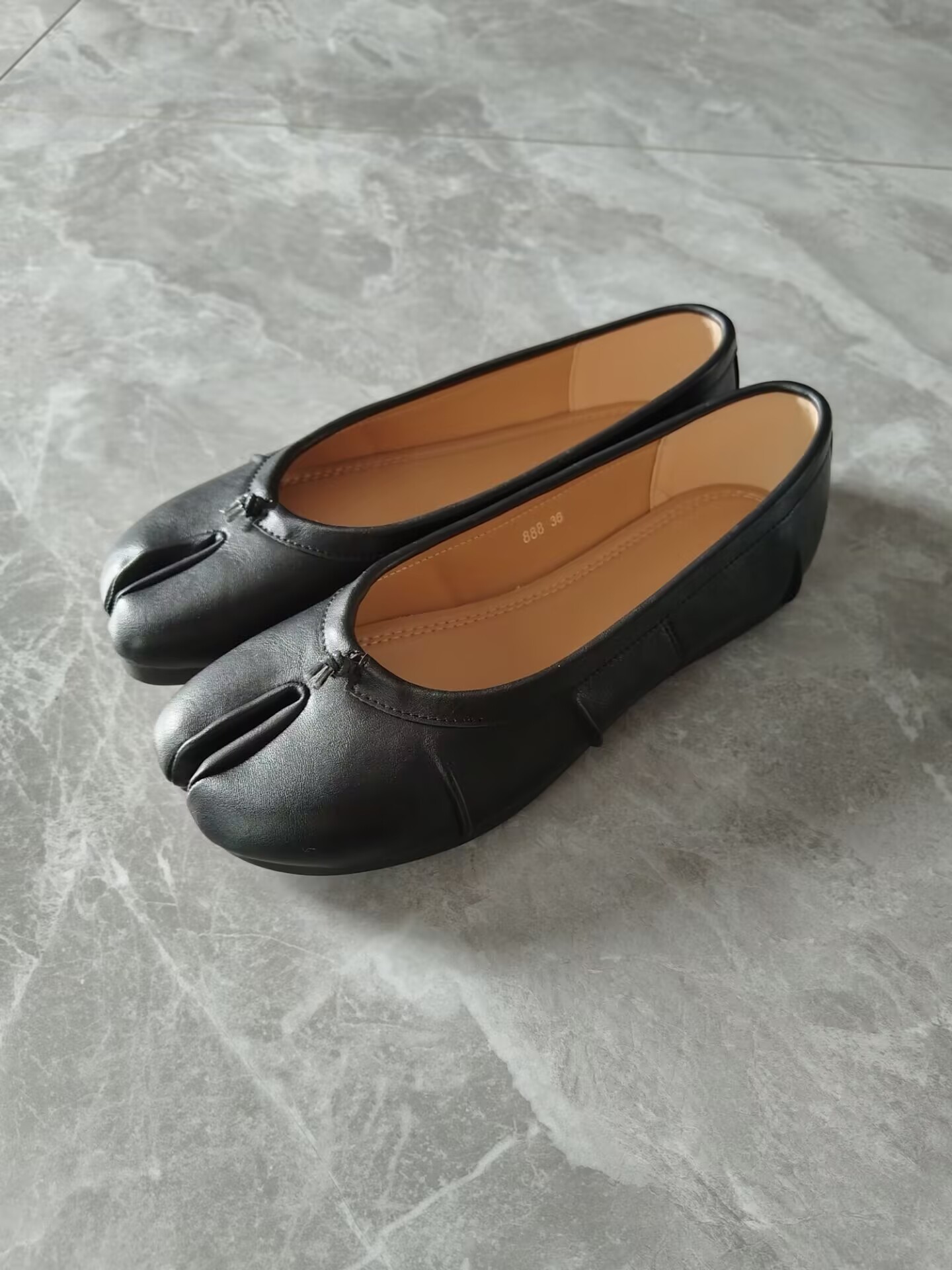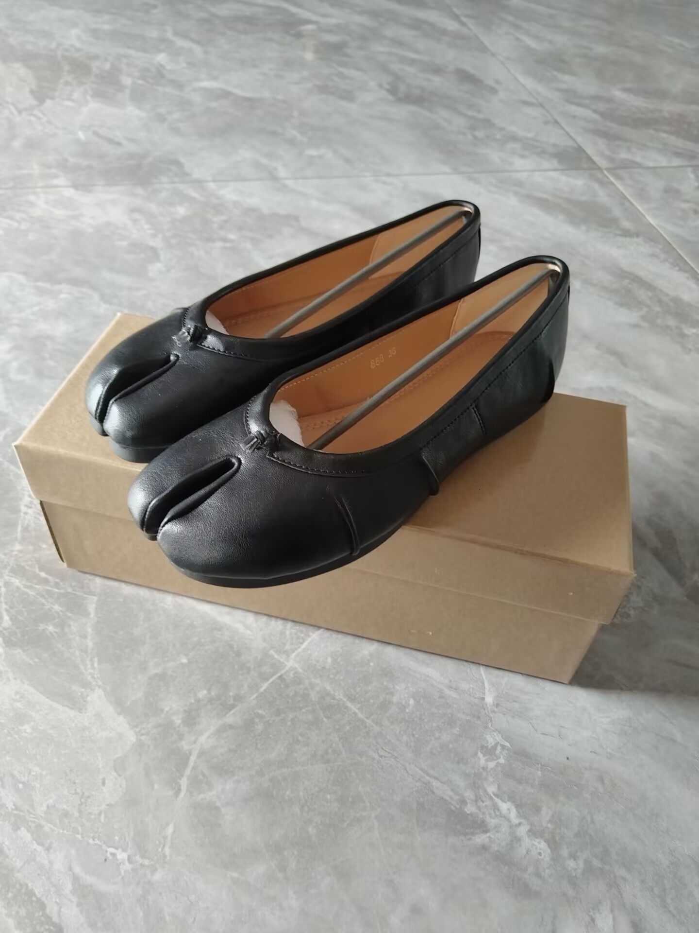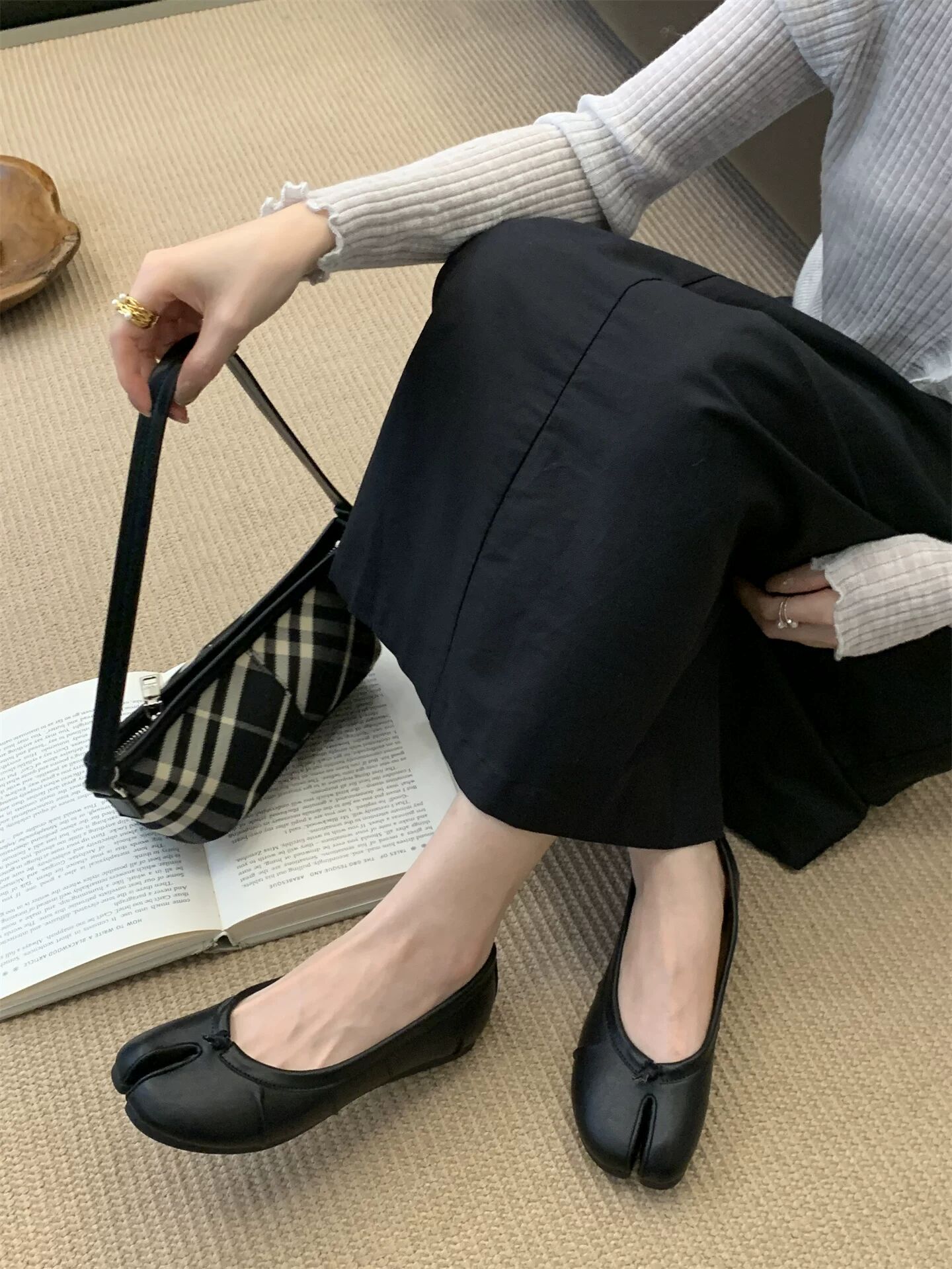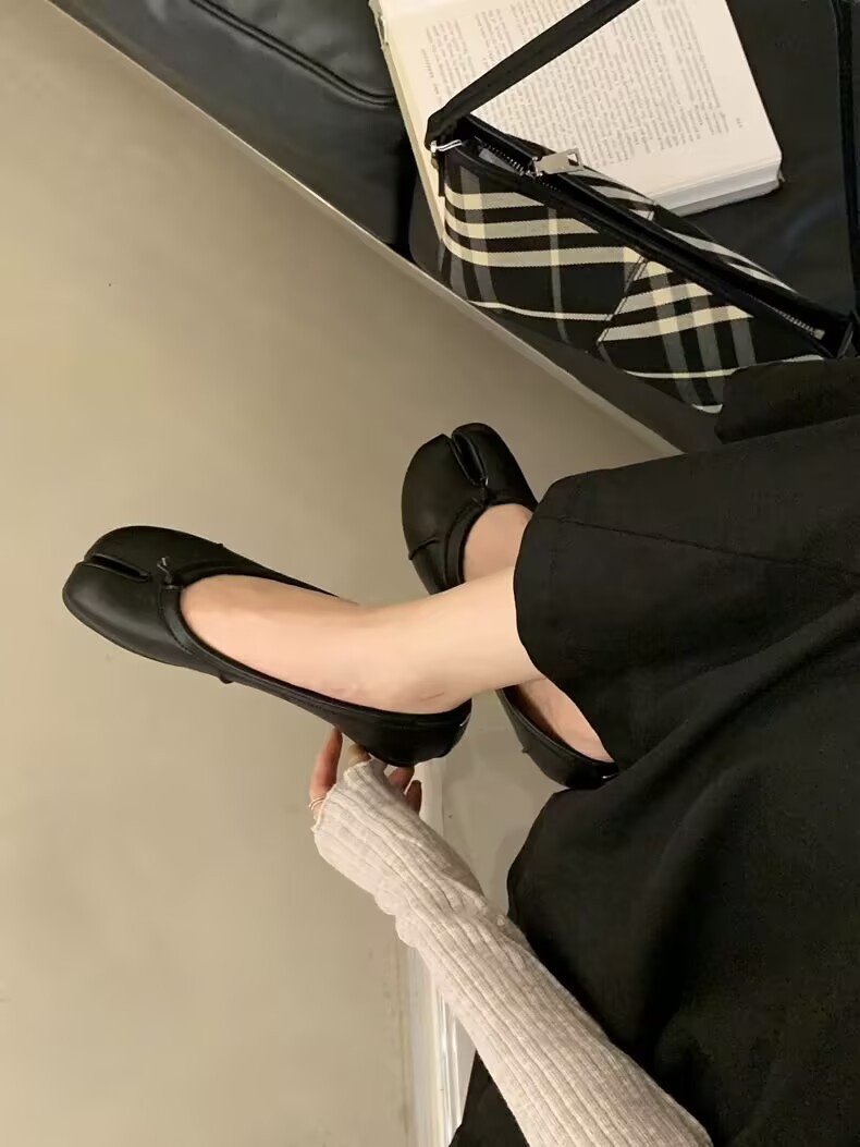在庫あり女性用タビスプリットトゥシューズ2024新作ニッチプリーツバレエピッグトゥ浅口リボンフラットシューズ