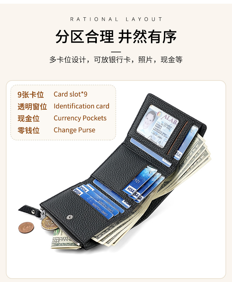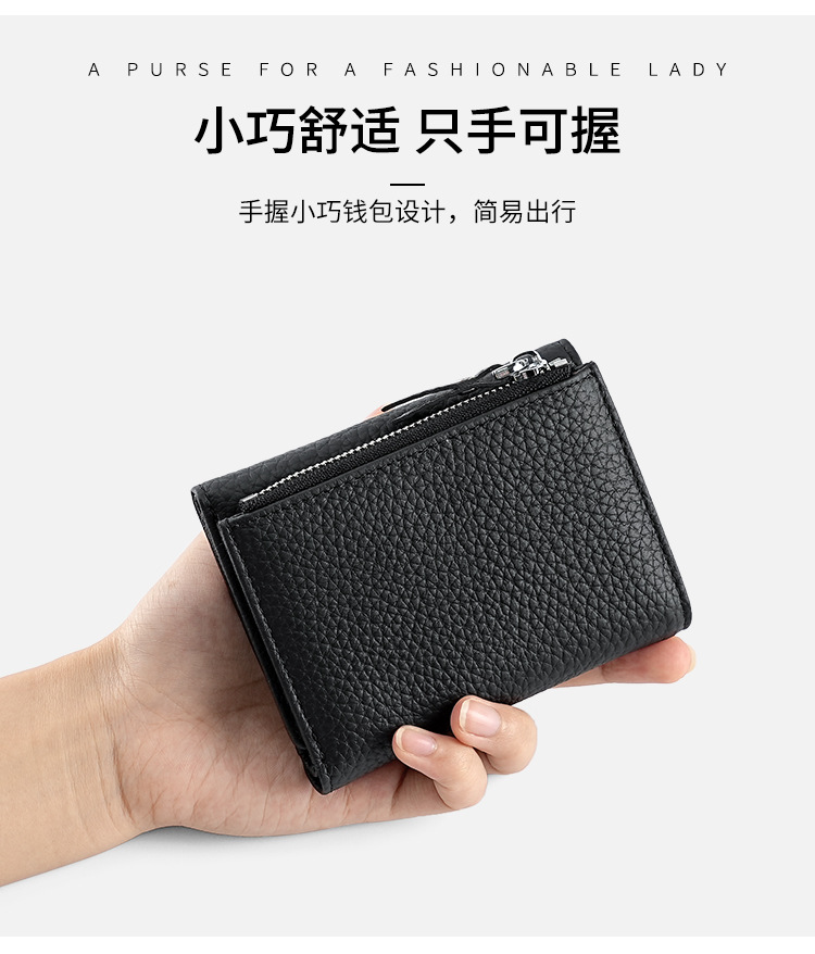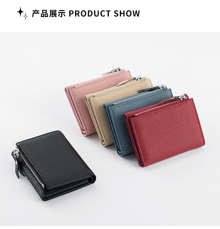 三つ折り財布の女性のトップ層牛革RFID盗難防止ブラシクリップ多カード位真皮カードバッグジッパー小銭袋